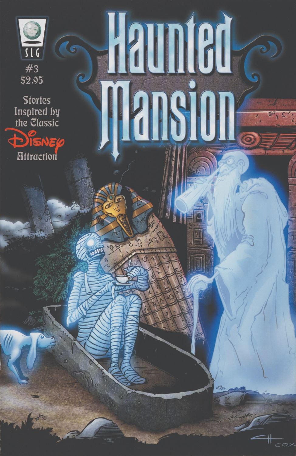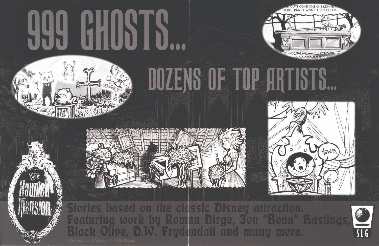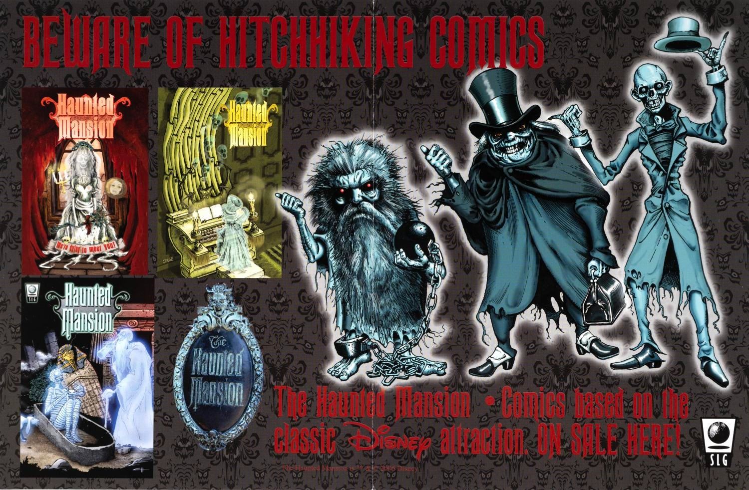 (SLG, 2005) A collection of Haunted Mansion comics #1-5, a promotional card, and a poster by Slave Labor Graphics. The books measure 6.75"x10.25", the card is 6"x9", and the poster is 8.75"x11". Each piece is in fine condition.