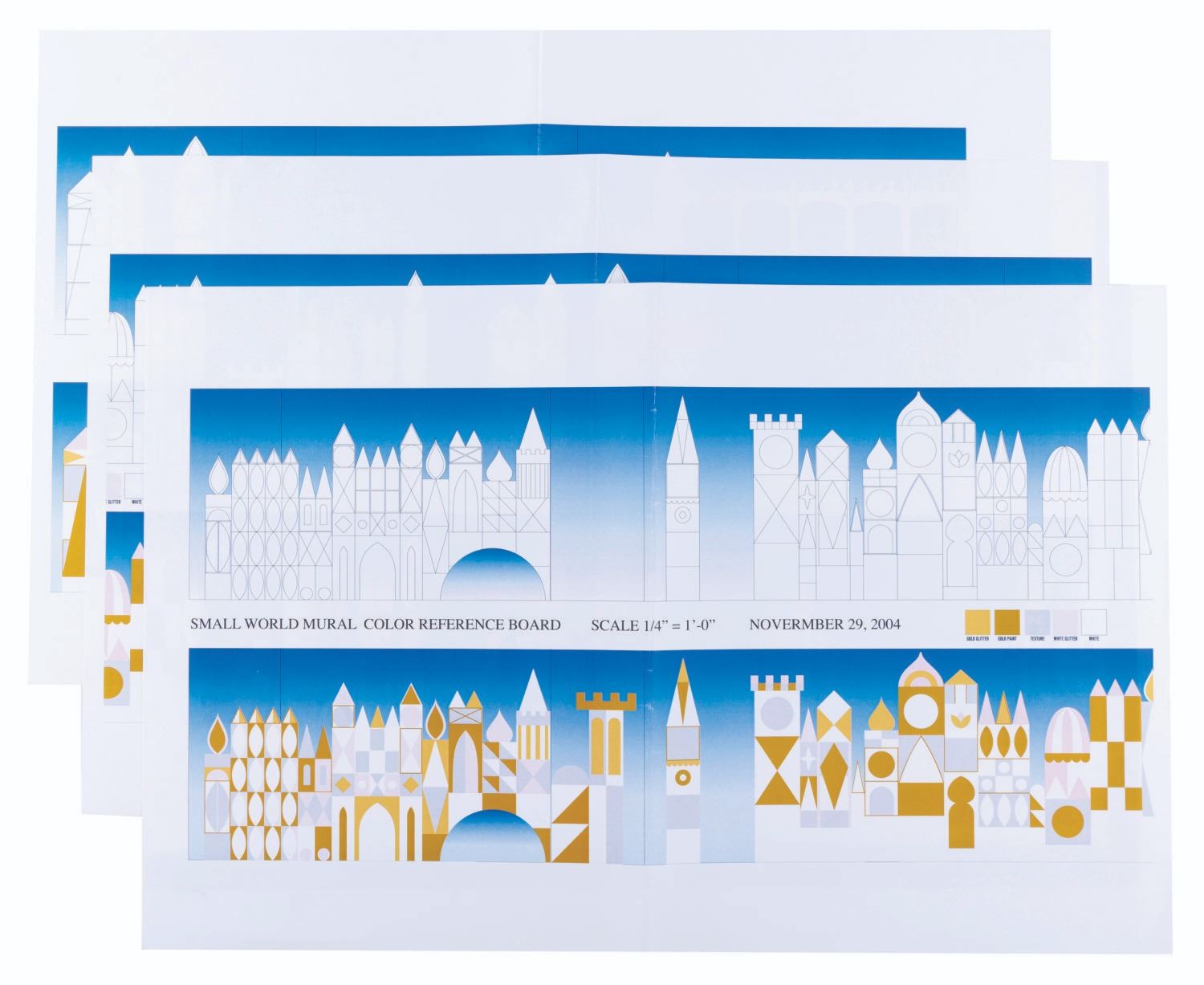 (Walt Disney World, 2004) A set of three color reference boards for the It’s a Small World queue area mural. Adjacent to the familiar, central facade, a substantial mural adorns the back wall of the attraction's queue area at Walt Disney World. Printed on heavy printer paper, these boards ensure the proper colors are assigned to the correct segments of the mural. Measuring 11” x 17”, the boards are in good, production-used condition with heavy fold marks down the center from being folded.