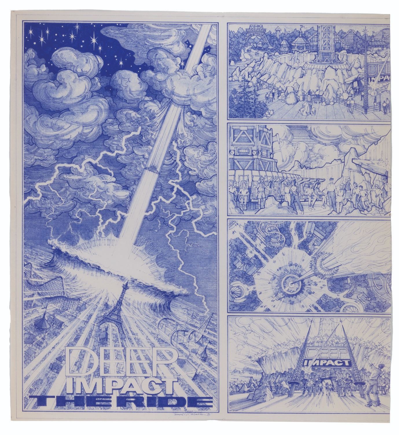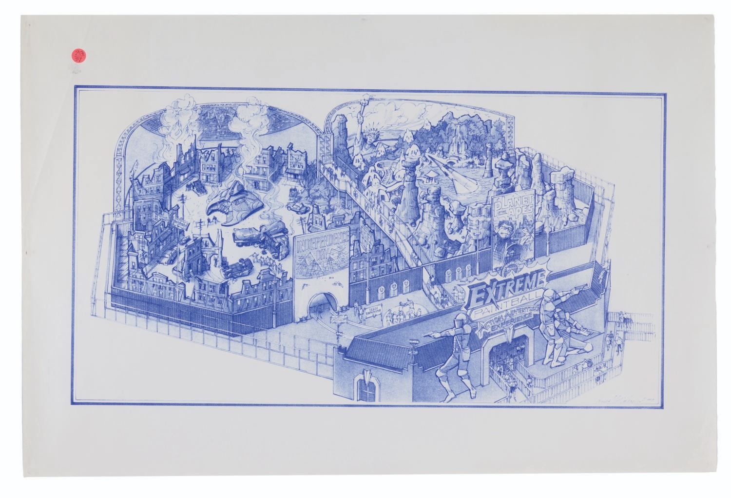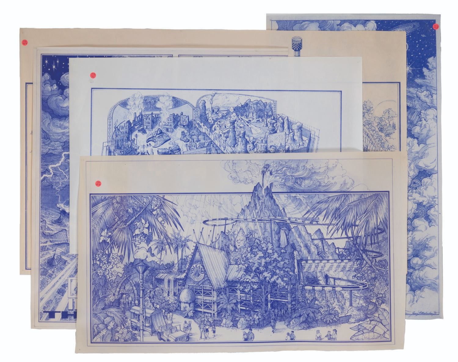 (Kings Island, 1990s) A set of five attraction concept blueprints by Jim Michaelson for Paramount's Kings Island. The concepts include a pair of "Deep Impact" drop tower prints, an Extreme Paintball experience with "Independence Day" and "Planet of the Apes" battlegrounds, and a Paramount Action Zone with "Top Gun," "Congo," and "Hunt for Red October" elements. Measuring 21.5" x 37" to 30" x 48", the blueprints are in very good condition with light creasing, discoloration, and ID stickers attached to the corners.