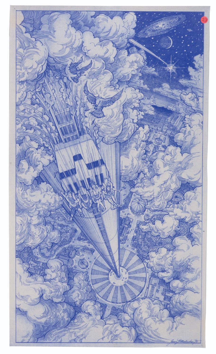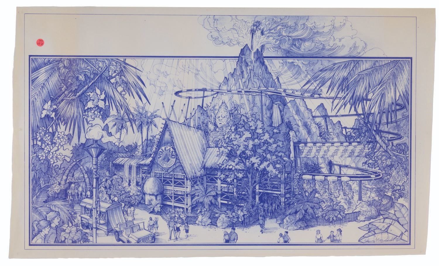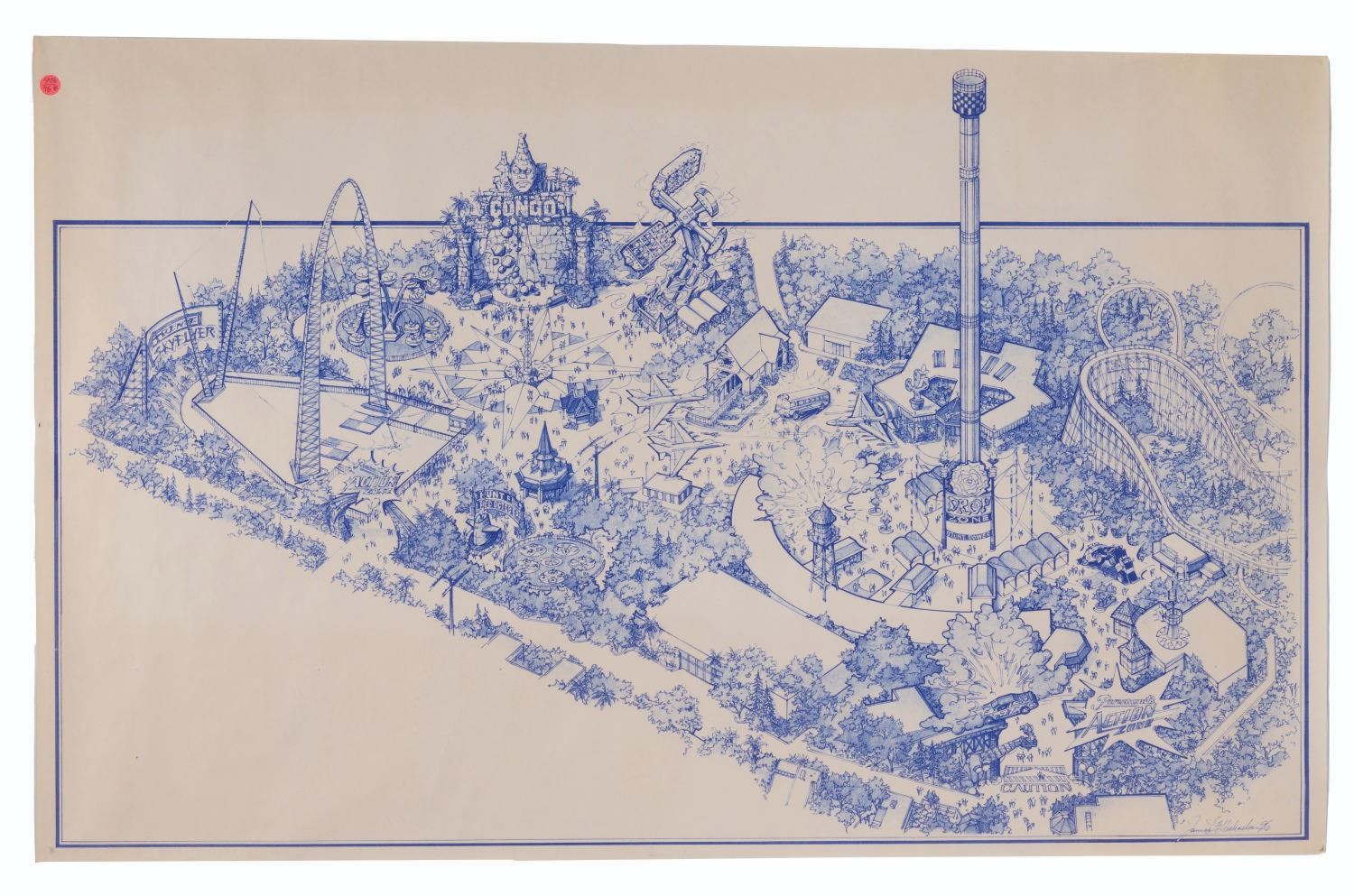 (Kings Island, 1990s) A set of five attraction concept blueprints by Jim Michaelson for Paramount's Kings Island. The concepts include a pair of "Deep Impact" drop tower prints, an Extreme Paintball experience with "Independence Day" and "Planet of the Apes" battlegrounds, and a Paramount Action Zone with "Top Gun," "Congo," and "Hunt for Red October" elements. Measuring 21.5" x 37" to 30" x 48", the blueprints are in very good condition with light creasing, discoloration, and ID stickers attached to the corners.