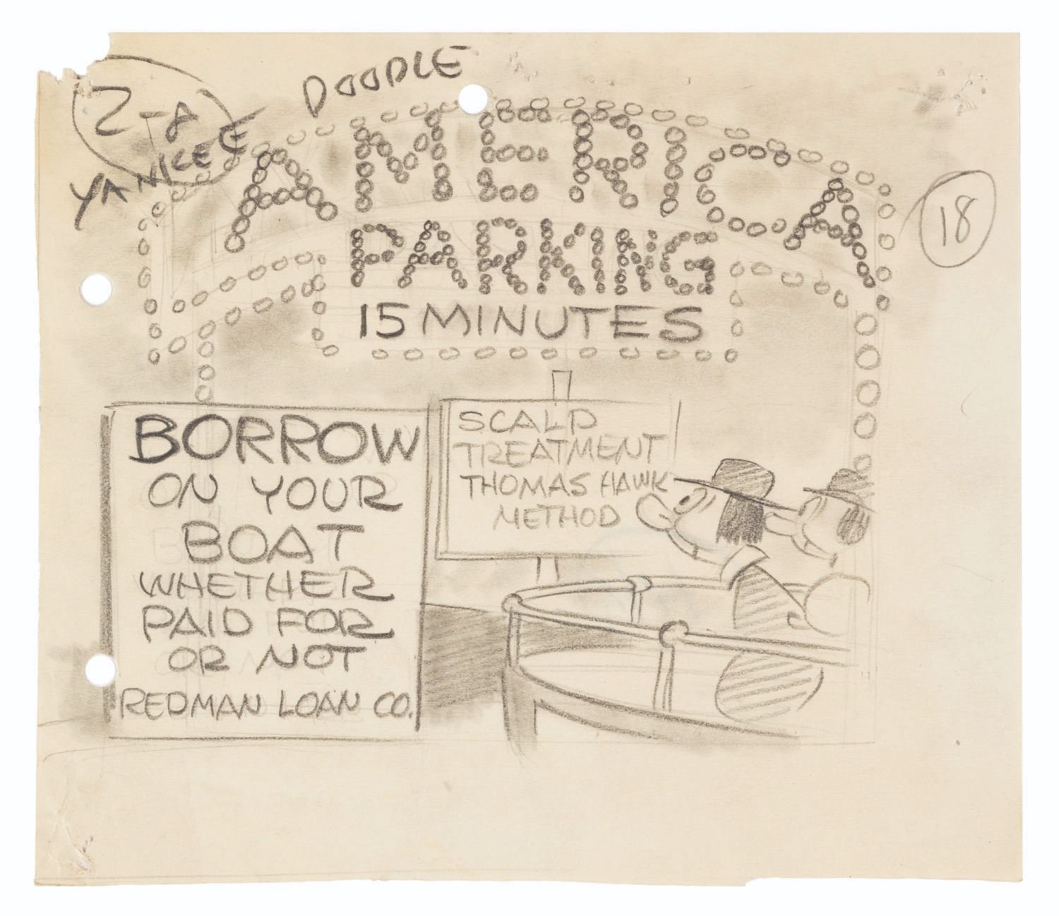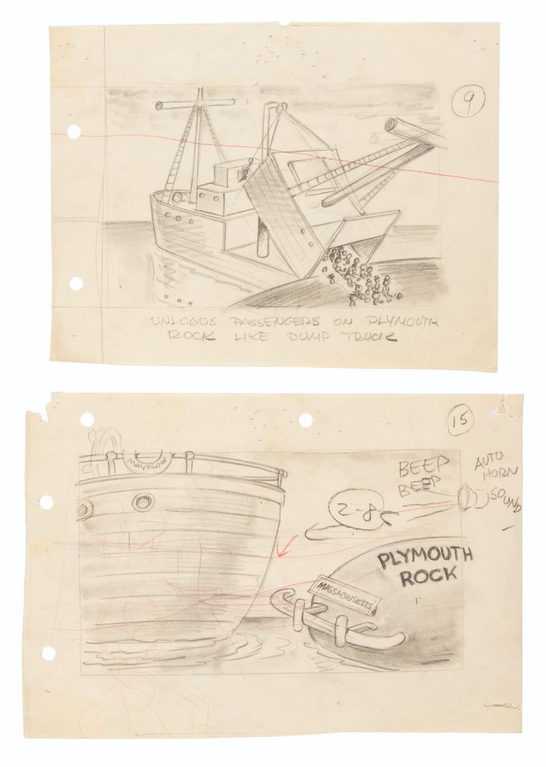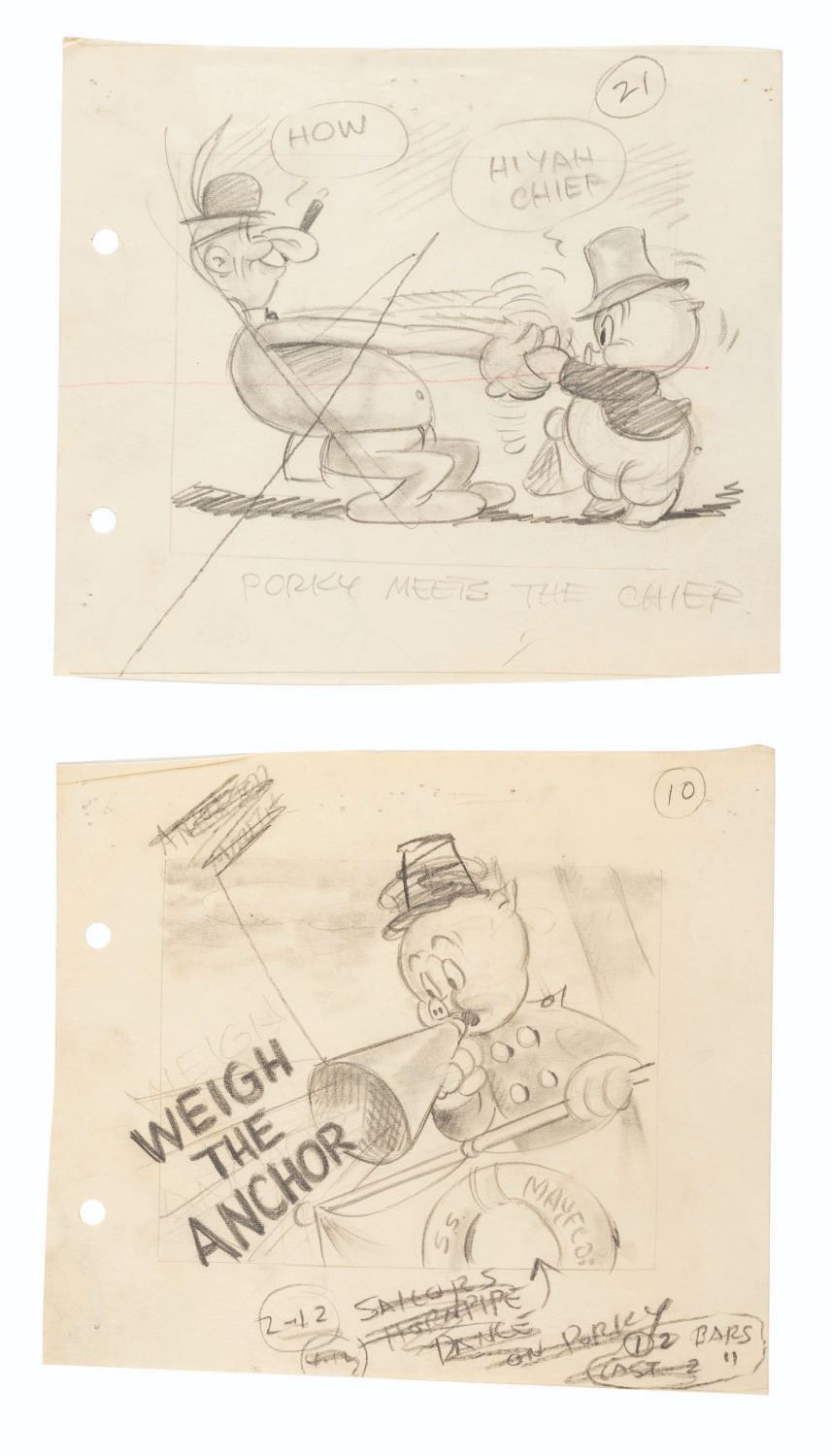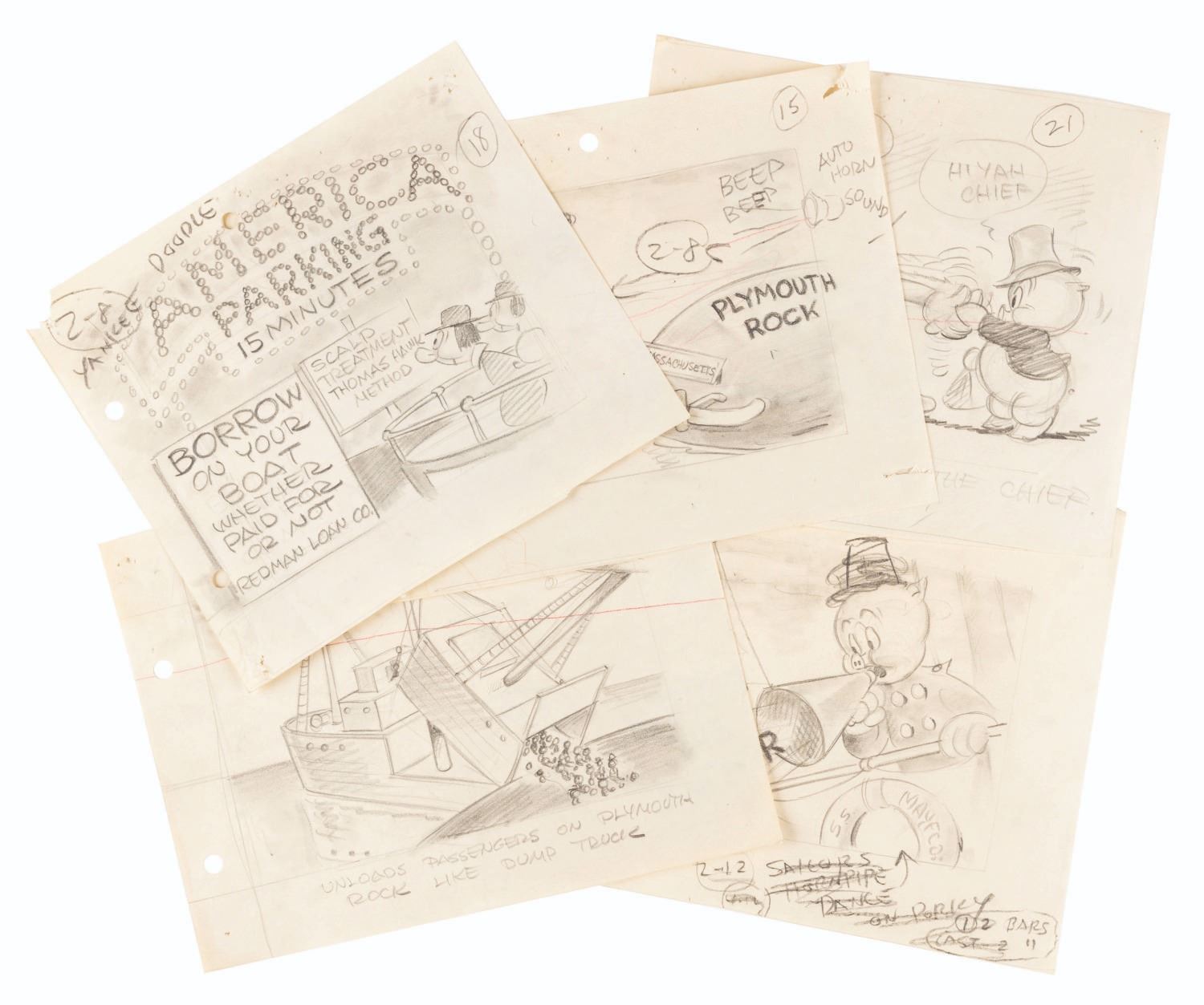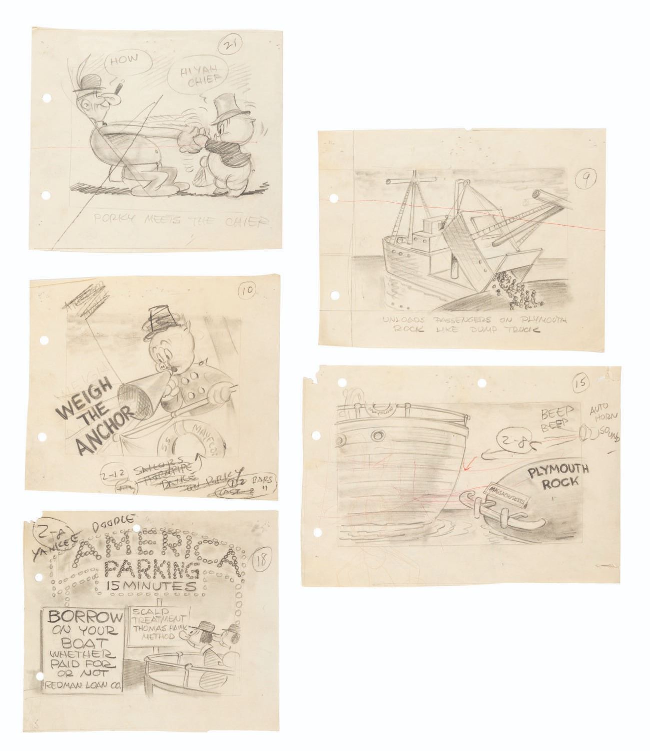 (Schlesinger, 1939) A set of five storyboard panels from the Looney Tunes short “Kristopher Kolumbus Jr.” directed by Bob Clampett. Aside from one gag billboard, these are ideas that do not appear in the final film. With image sizes up to 4” x 7” on 6.25” x 9” paper, the drawings are in good condition with much wear from production use including pinholes, small tears, and smudges.