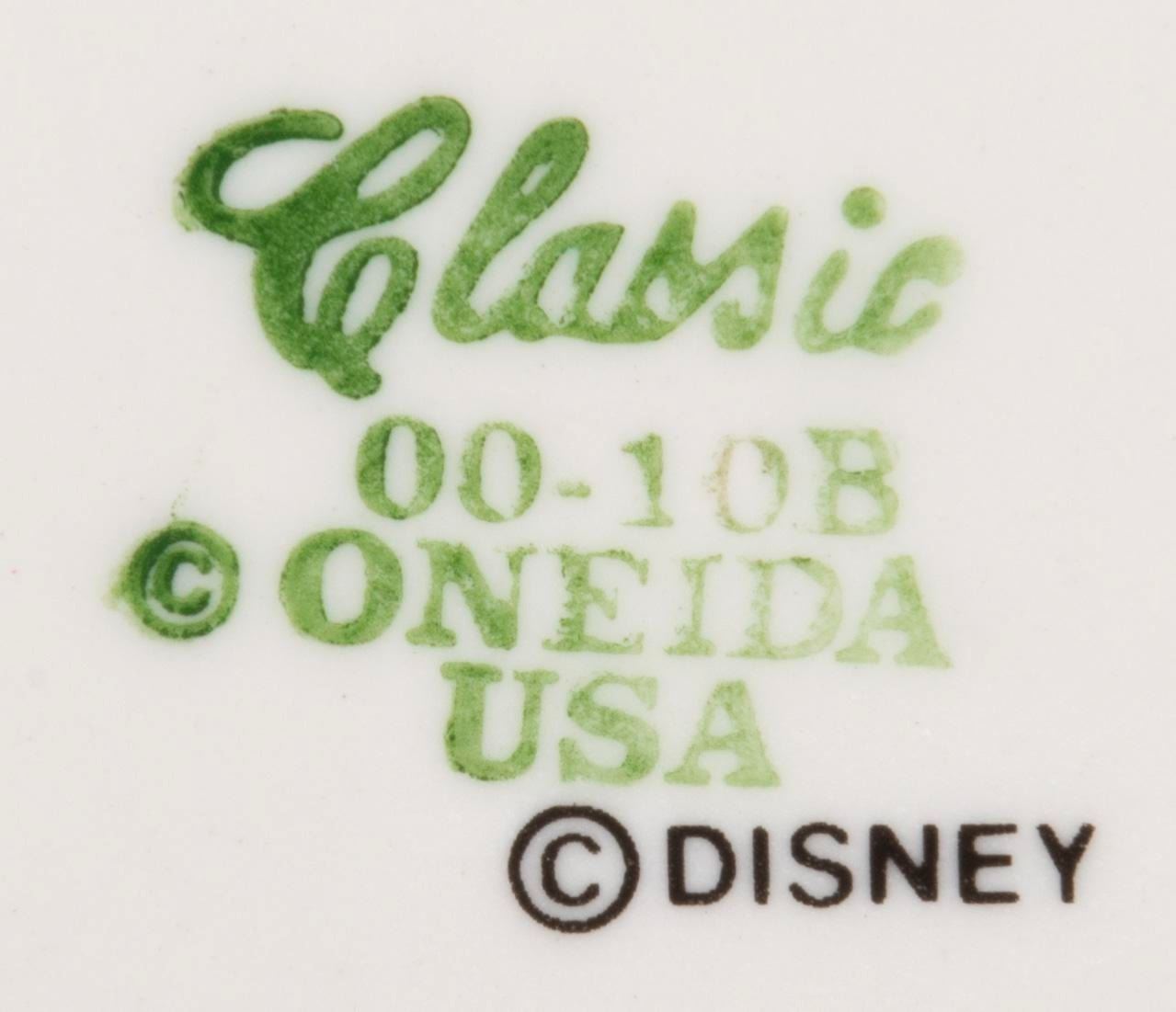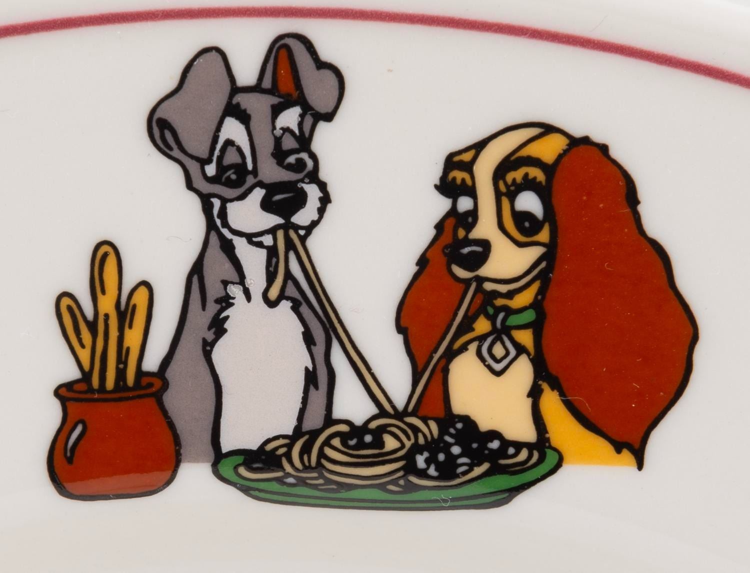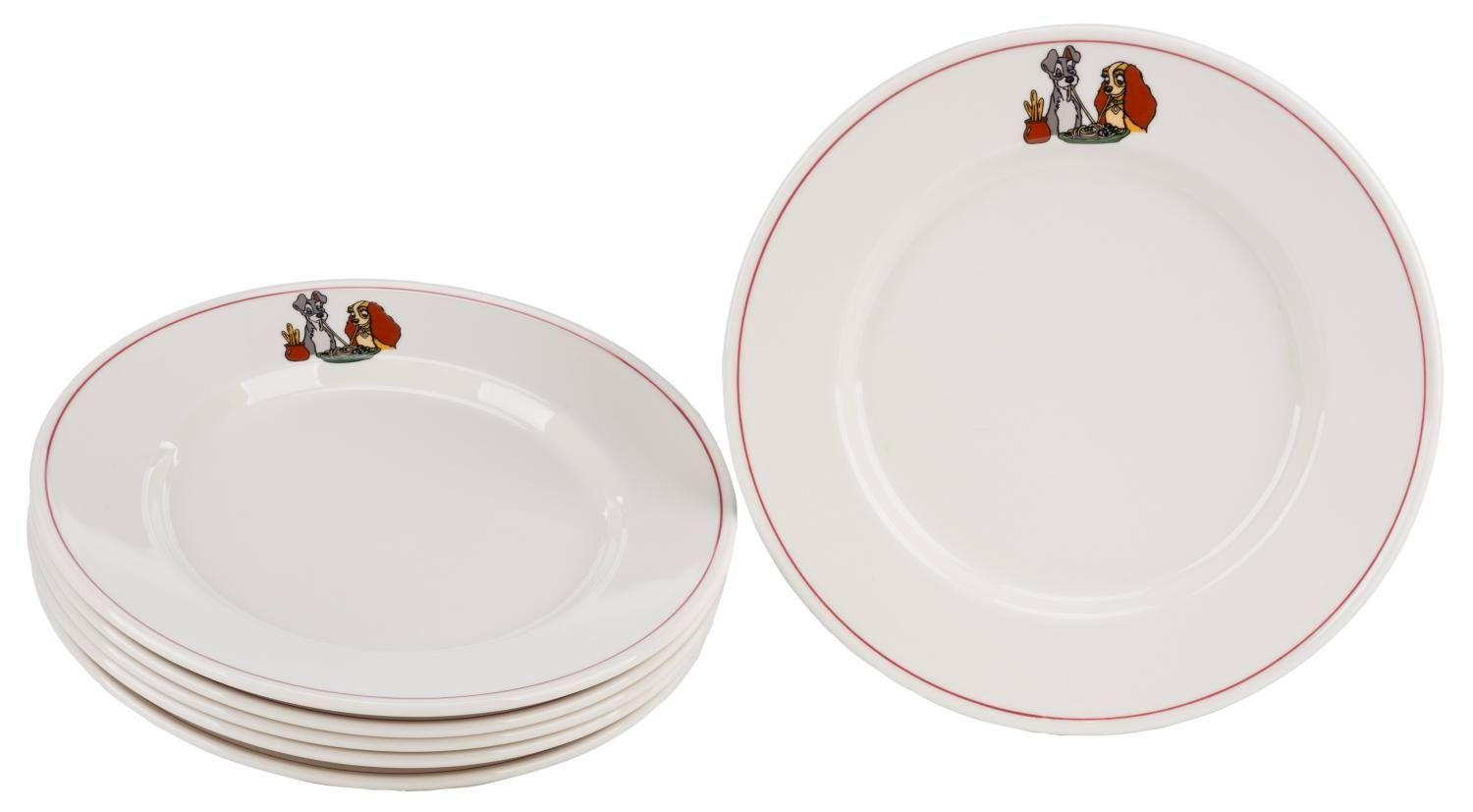 (Walt Disney World, 1990s-2000s) A set of six "Lady and the Tramp" dinner plates from Tony's Town Square Restaurant in Walt Disney World. Measuring 10" in diameter, the plates are in very good condition with slight finish imperfections.