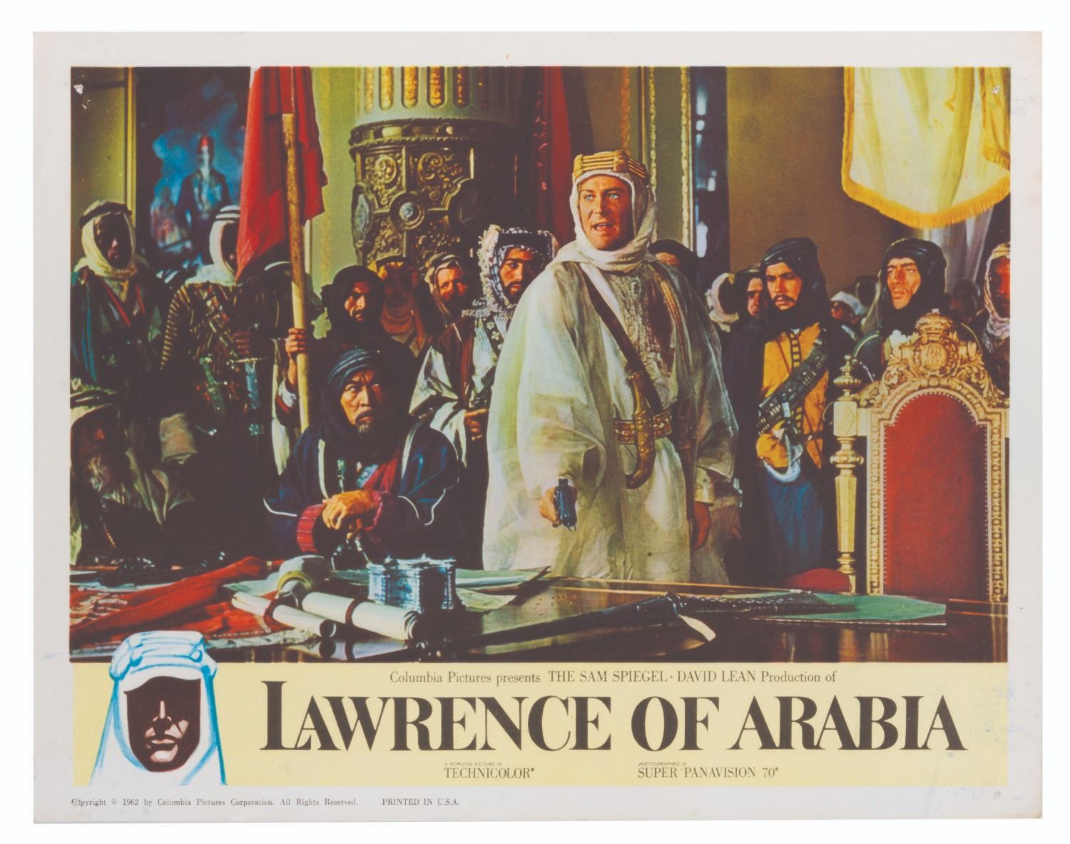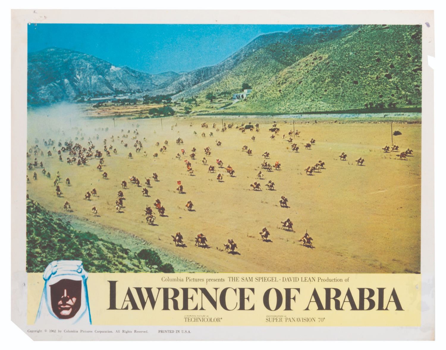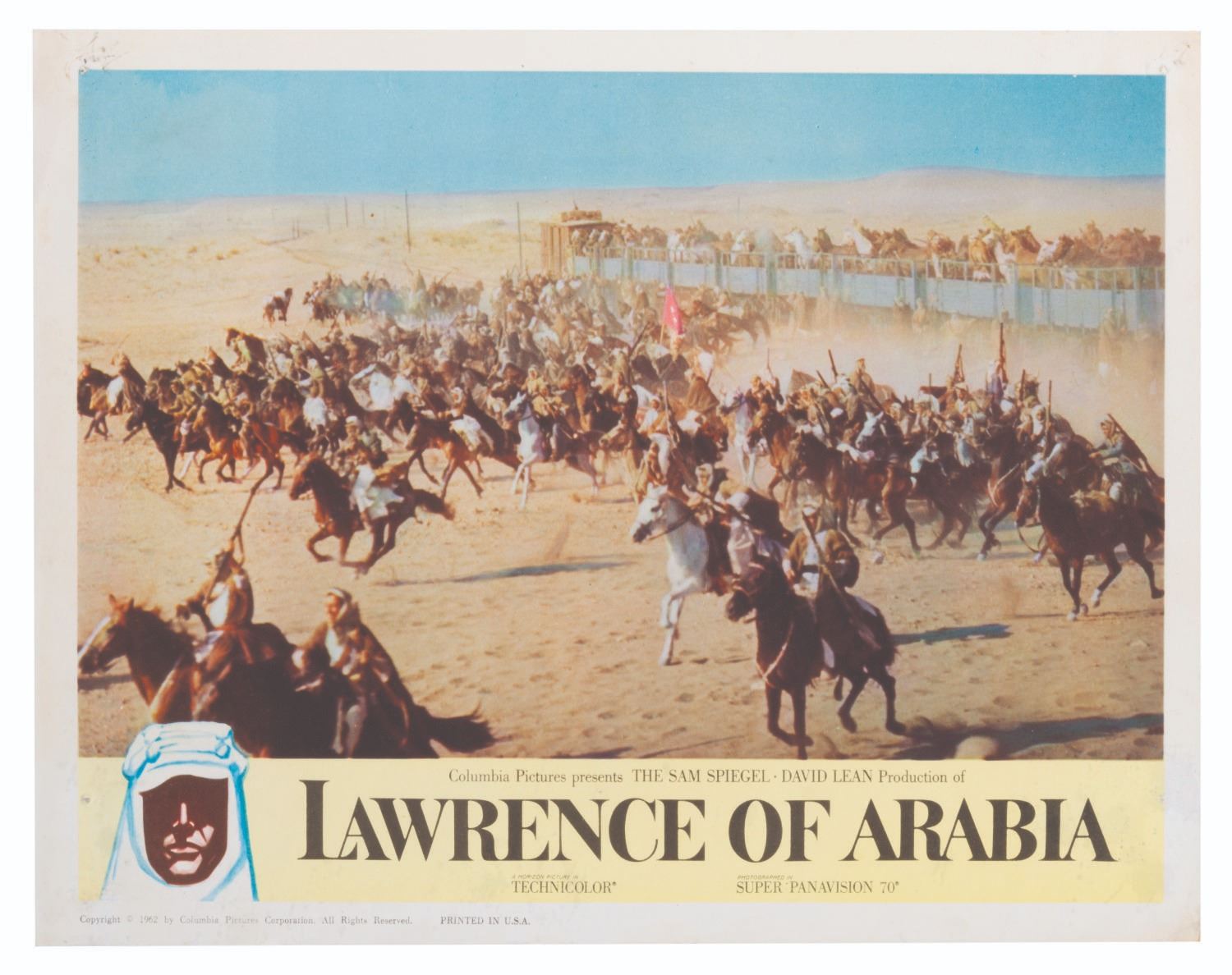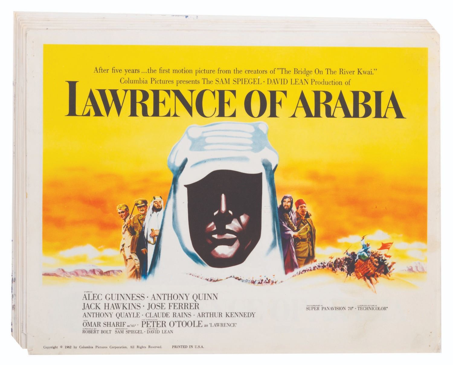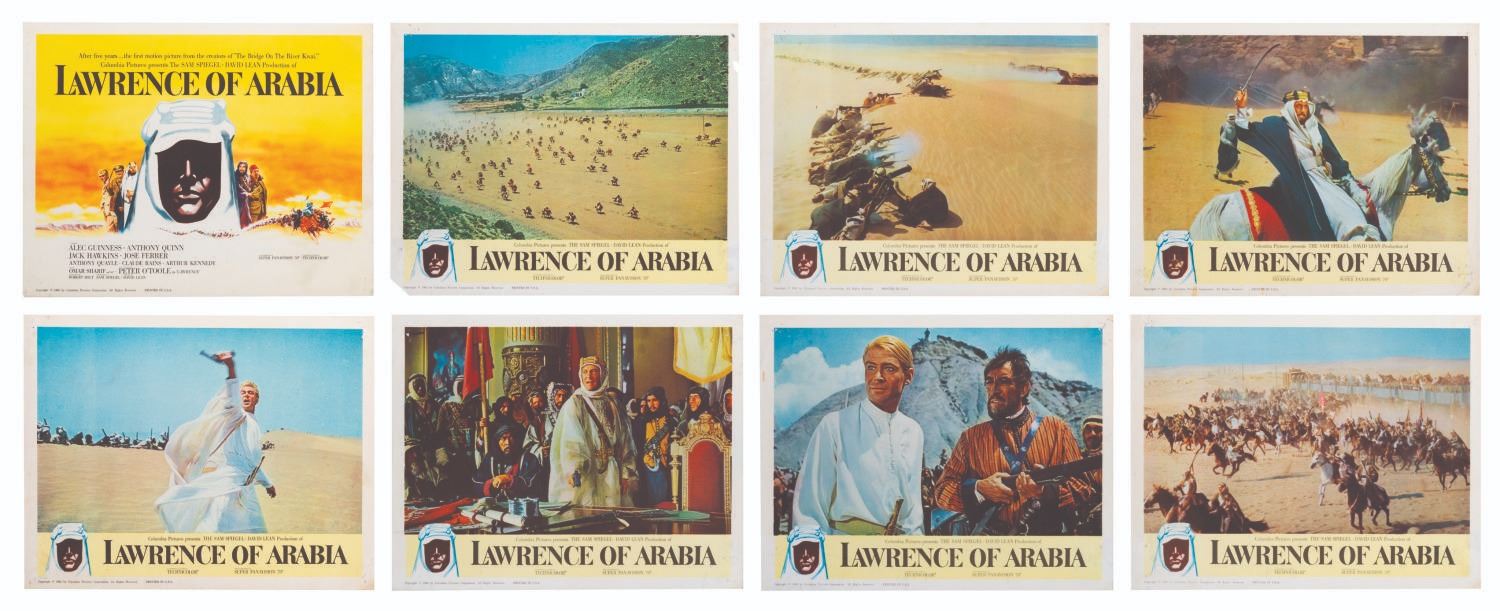 (Columbia, 1962) A set of eight lobby cards for the release of David Lean's "Lawrence of Arabia." Measuring 11" x 14" each, the lobby cards are in good condition with pinholes from display, discoloration from age, stains, scratches, edge tears up to 0.75", adhesive residue on the reverse, tape at the lower left corner of one, and another missing its lower left corner.