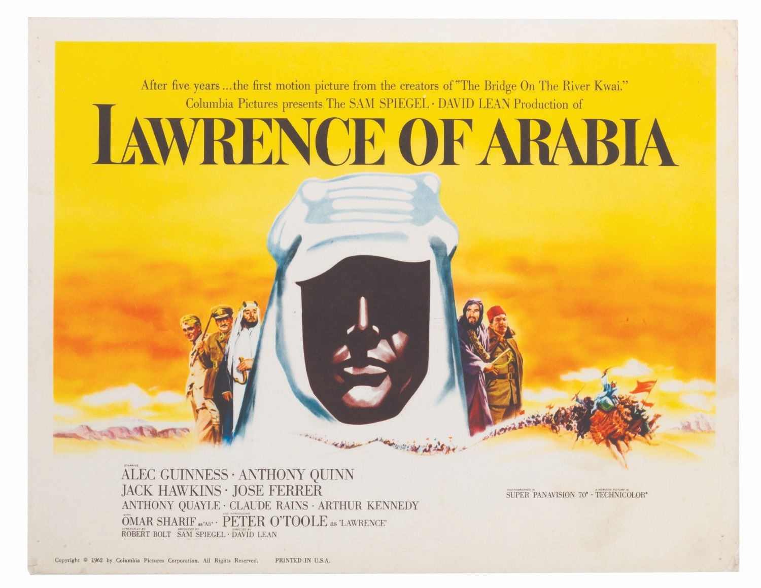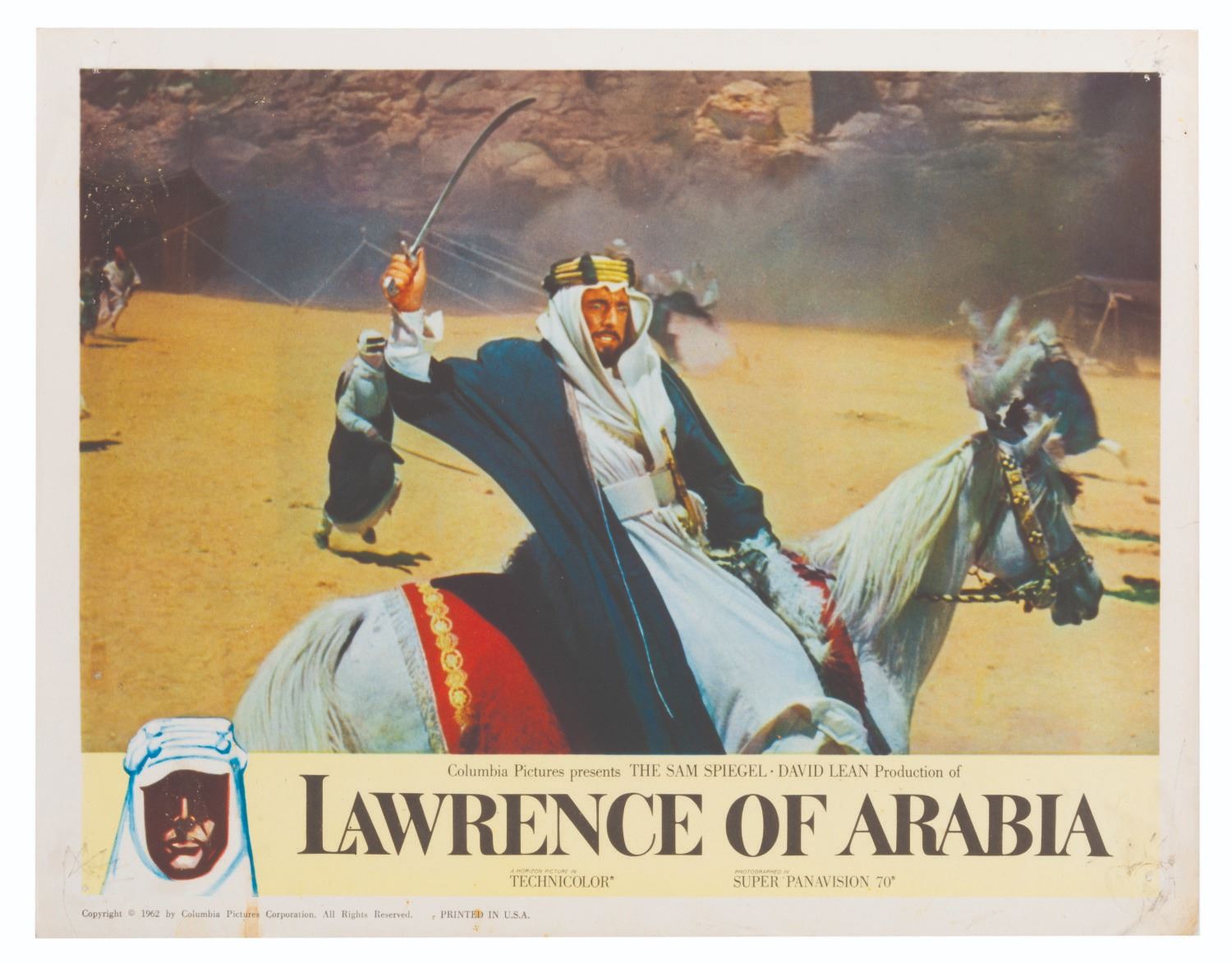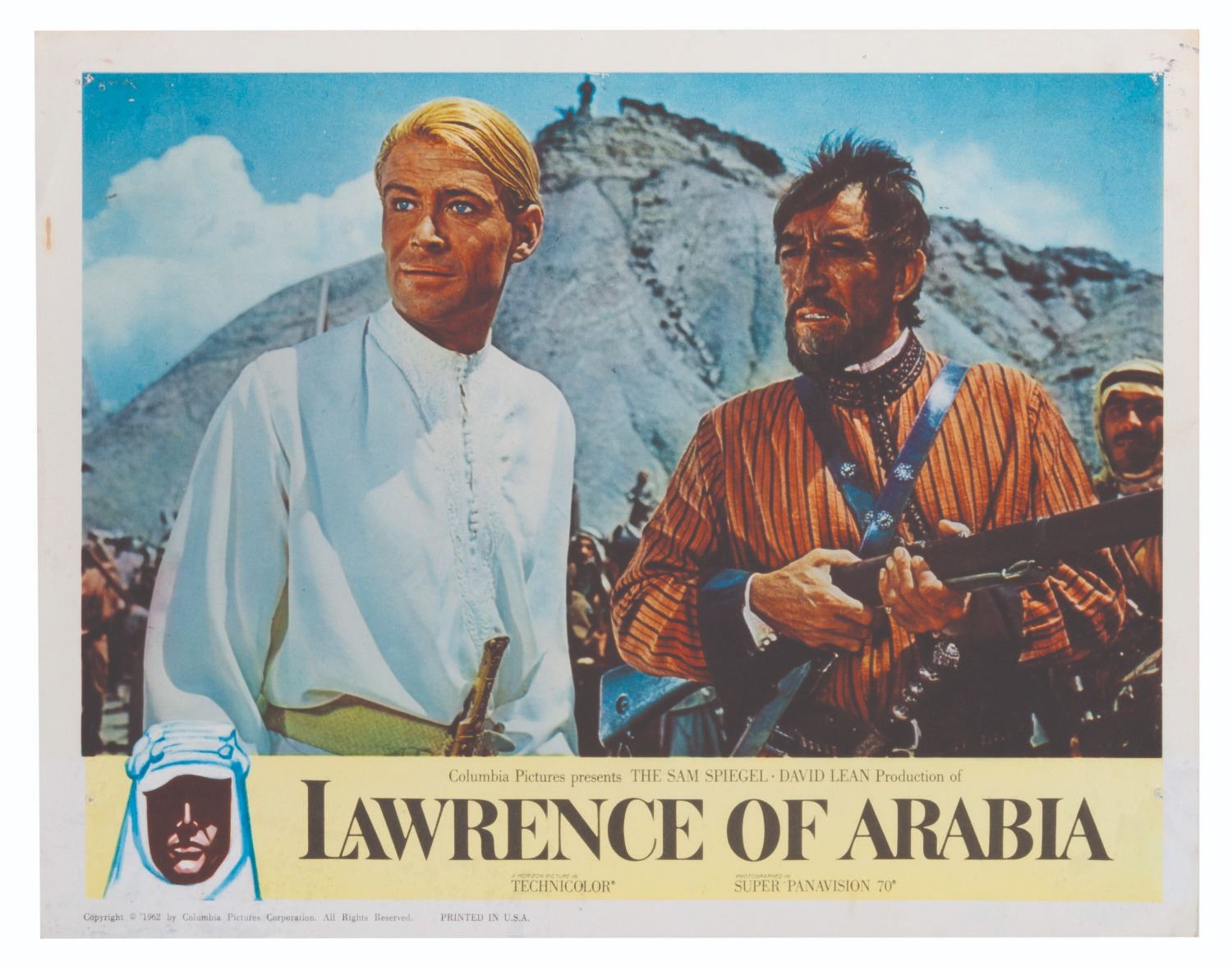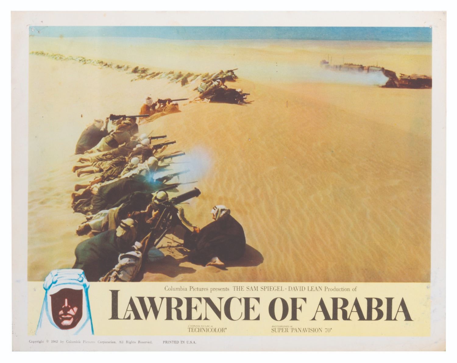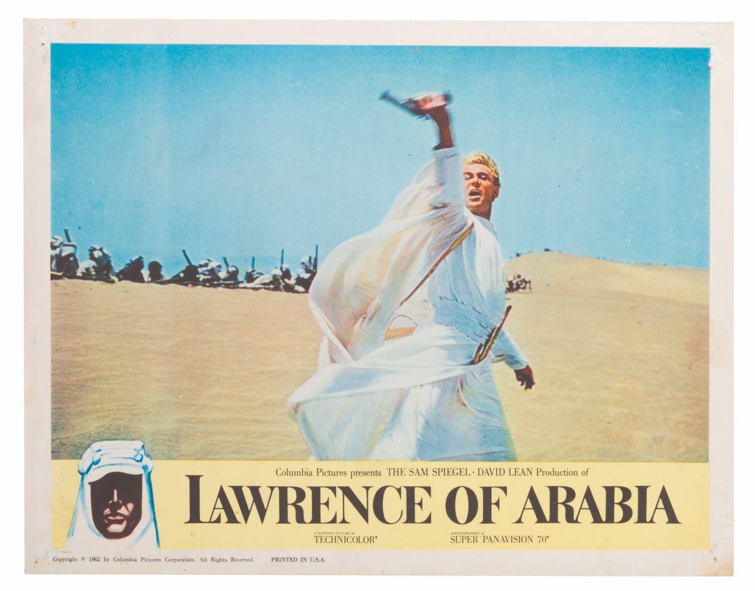 (Columbia, 1962) A set of eight lobby cards for the release of David Lean's "Lawrence of Arabia." Measuring 11" x 14" each, the lobby cards are in good condition with pinholes from display, discoloration from age, stains, scratches, edge tears up to 0.75", adhesive residue on the reverse, tape at the lower left corner of one, and another missing its lower left corner.