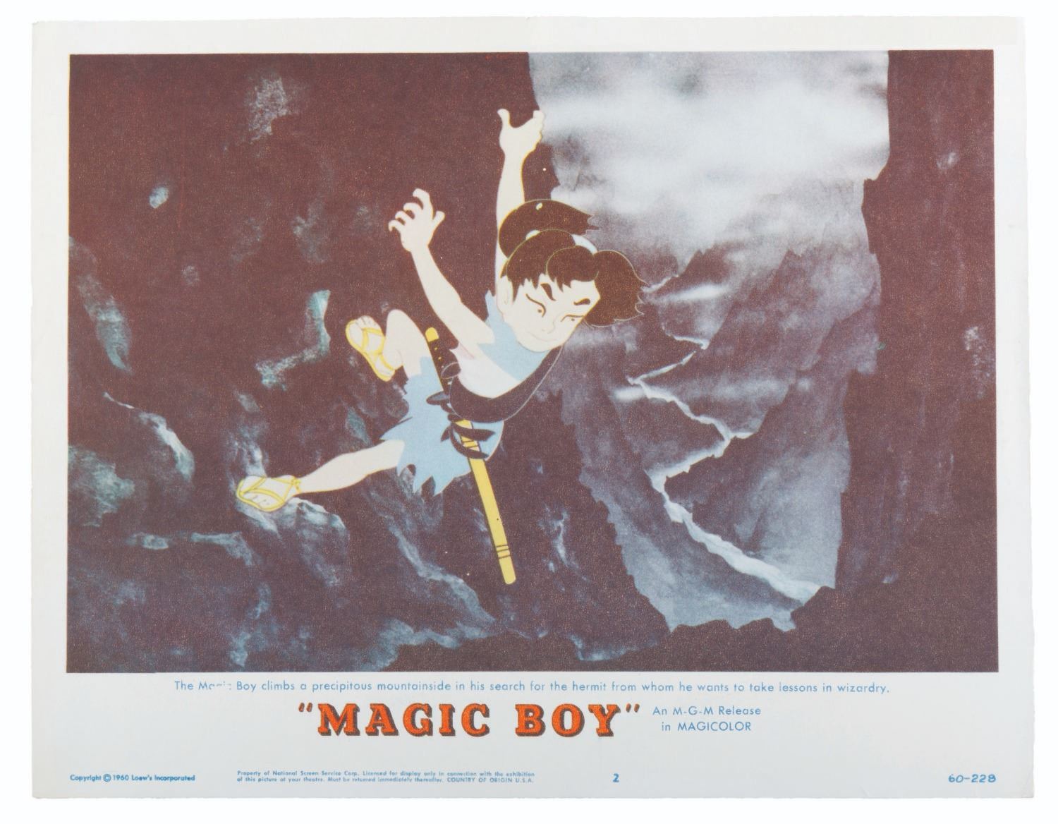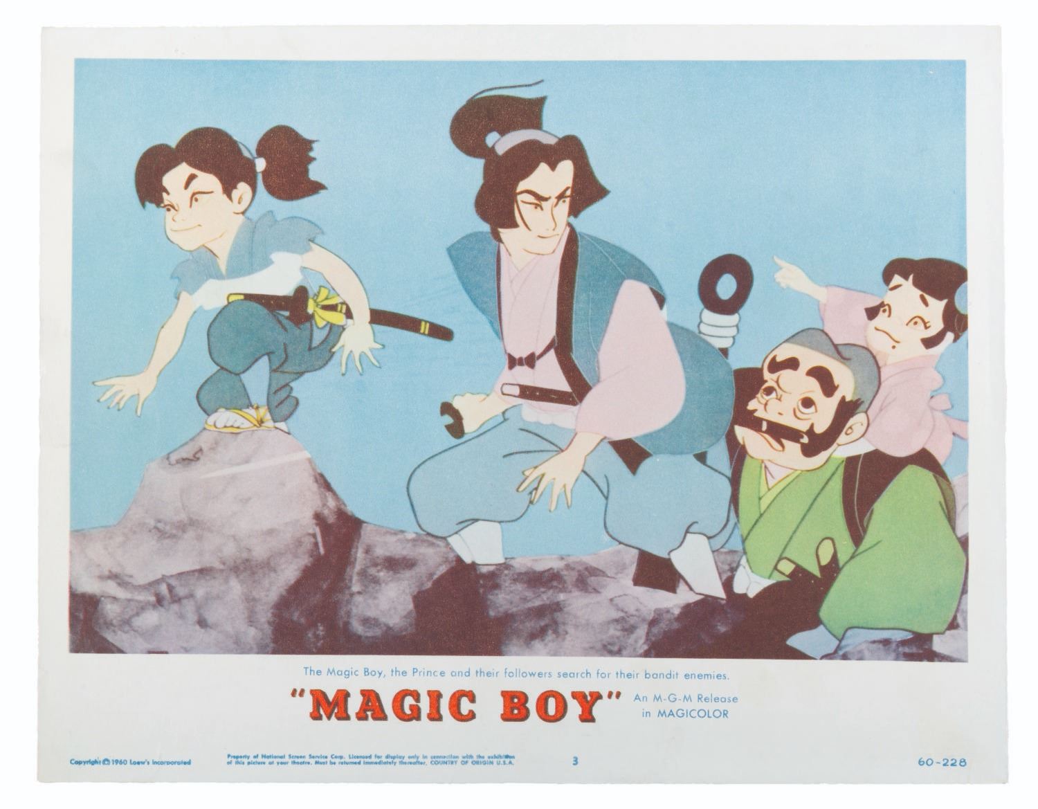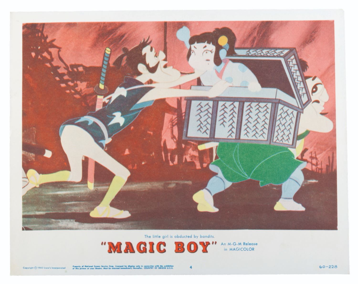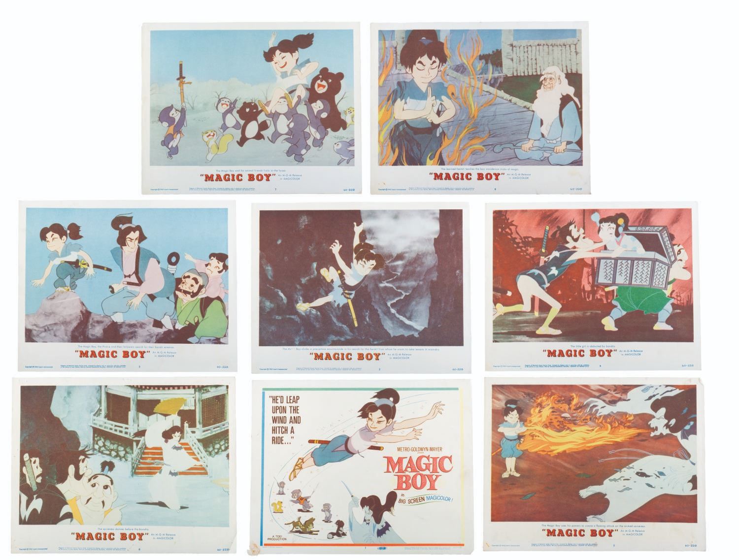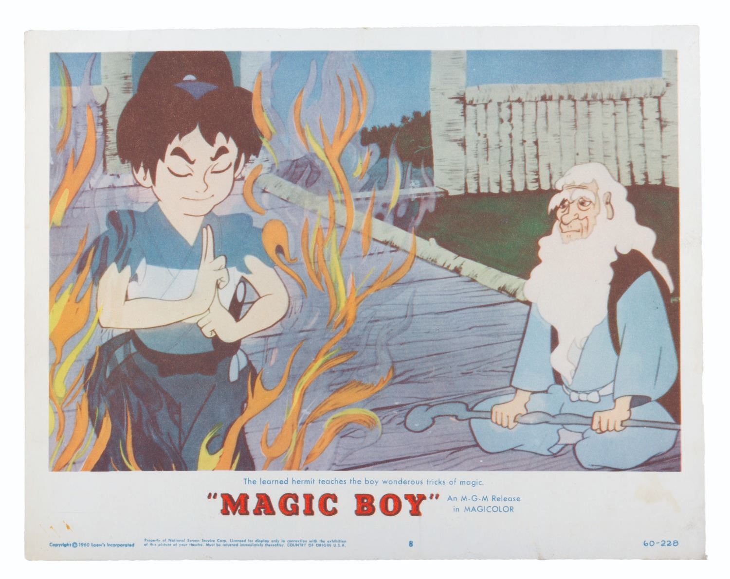 (MGM, 1959) A set of eight lobby cards for the Japanese film "Magic Boy, " the first anime to be released in the United States. Measuring 11 " x 14 " each, the cards are in good condition with discoloration, soiling, small tears, creasing, edge wear, pinholes, and adhesive residue.
