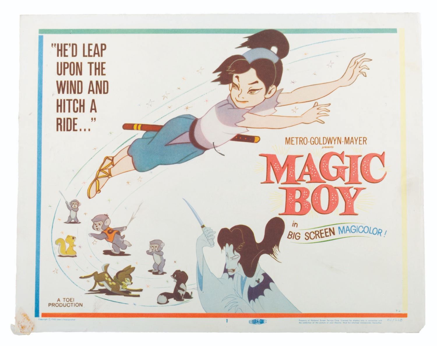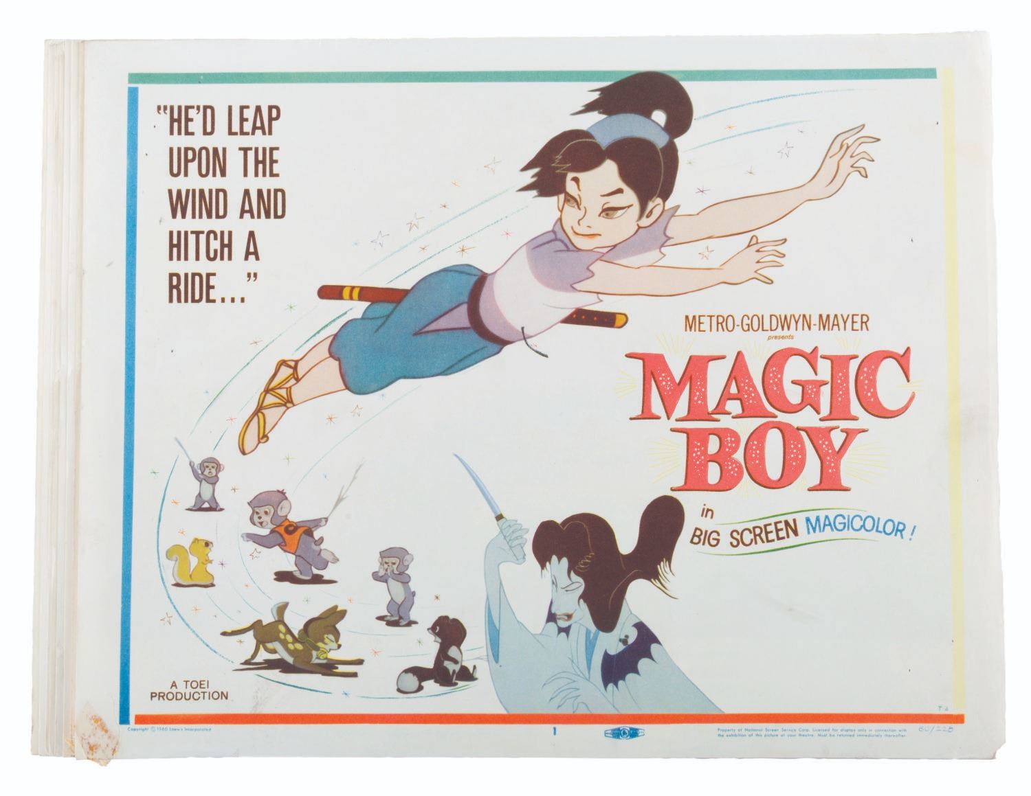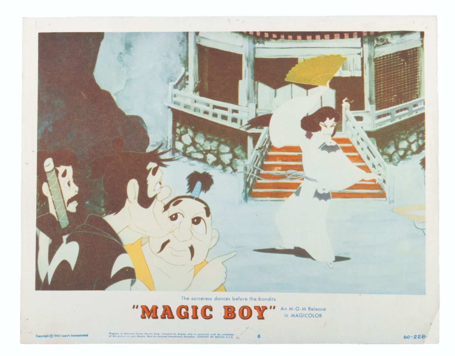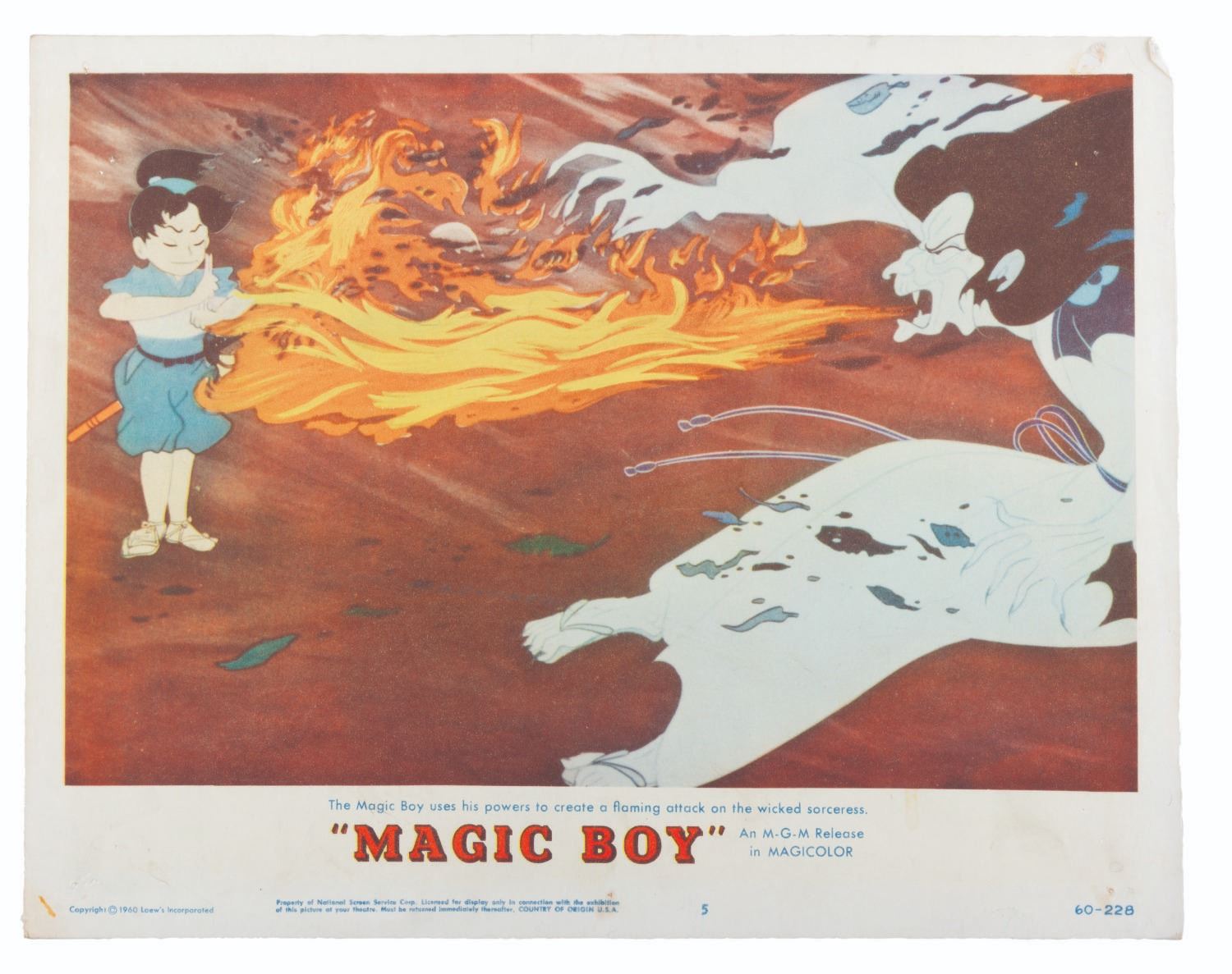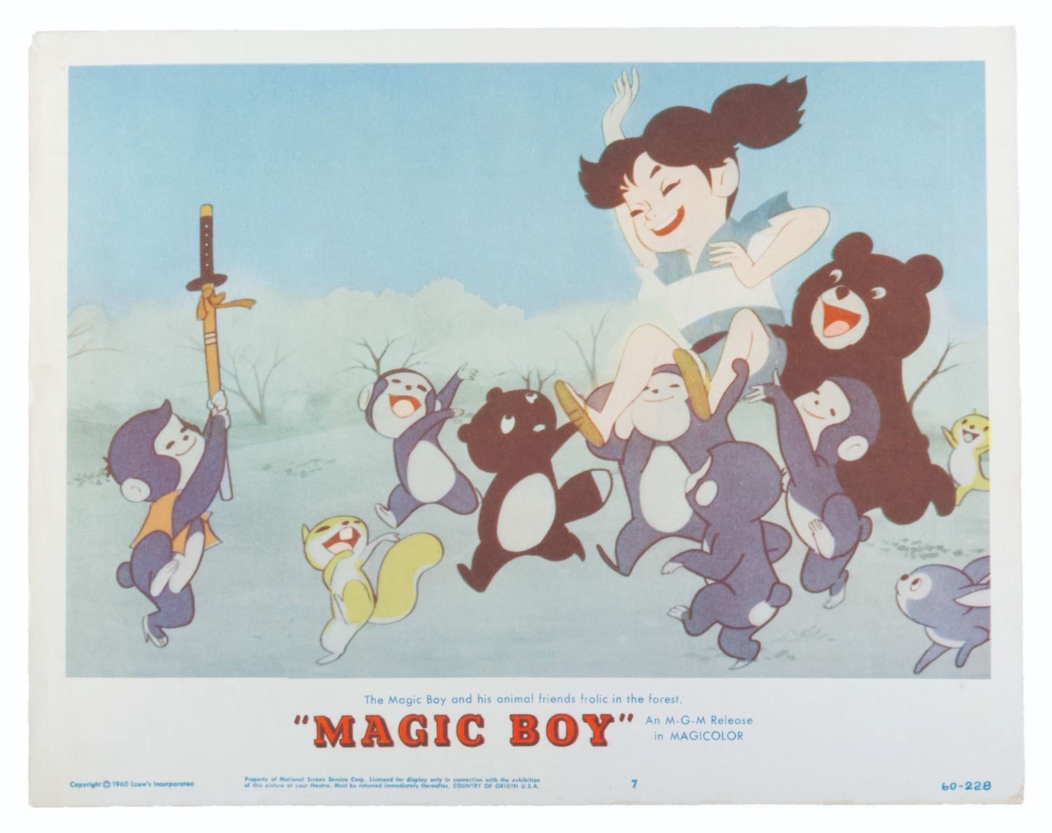 (MGM, 1959) A set of eight lobby cards for the Japanese film "Magic Boy, " the first anime to be released in the United States. Measuring 11 " x 14 " each, the cards are in good condition with discoloration, soiling, small tears, creasing, edge wear, pinholes, and adhesive residue.