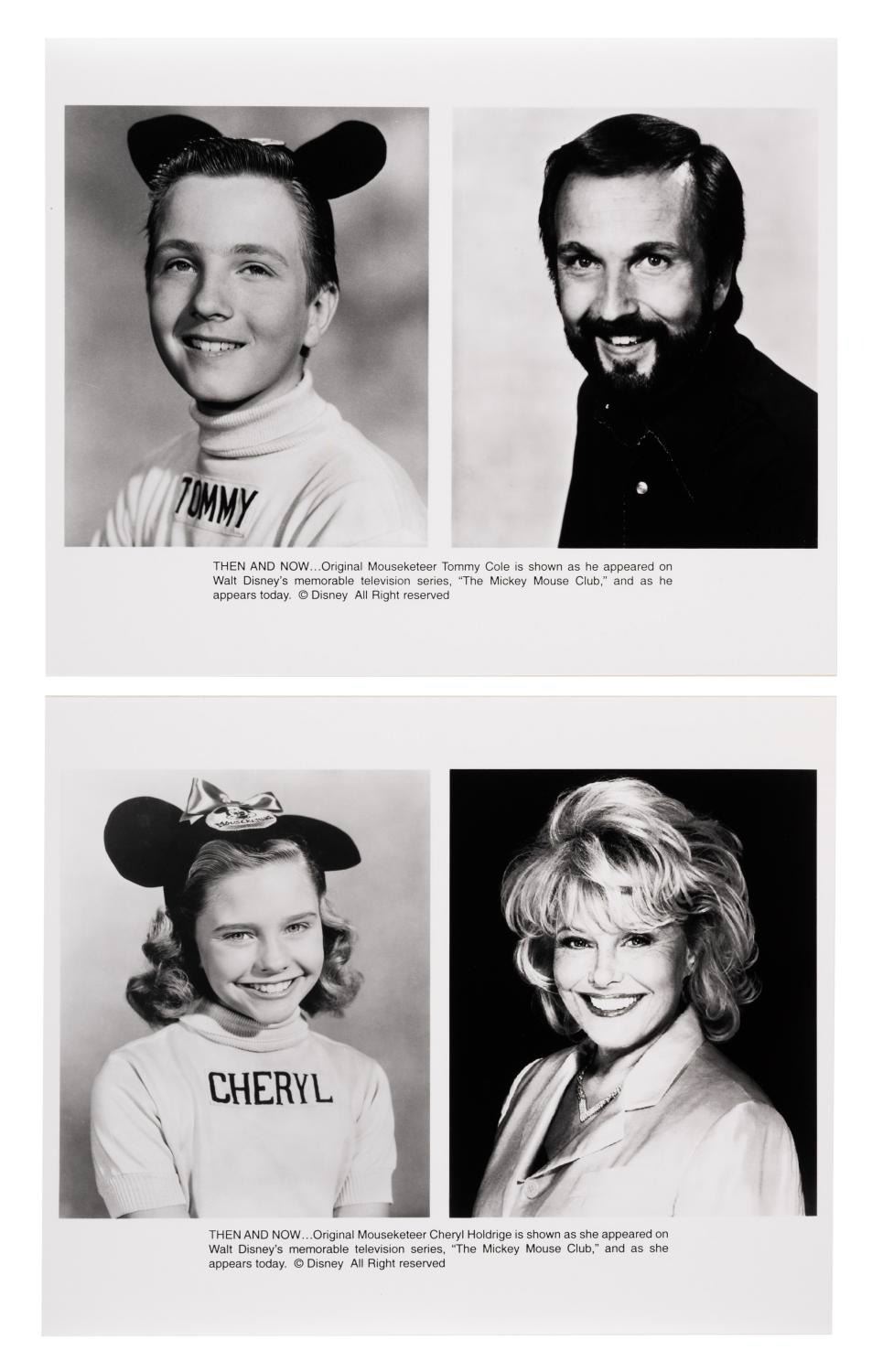 (Disney, 2005) A set of ten 50 Years of Mouseketeers photos. Each print shows an original Mouseketeer as they appeared on the show in 1955 and as an adult. The 8" x 10" glossy photos are in fine condition. The 9" x 12" logo envelope is in good condition with some handling wear and a 2.25" tear to the flap.