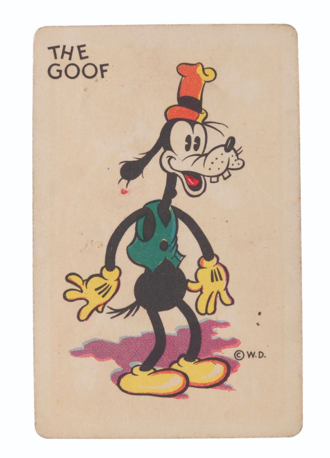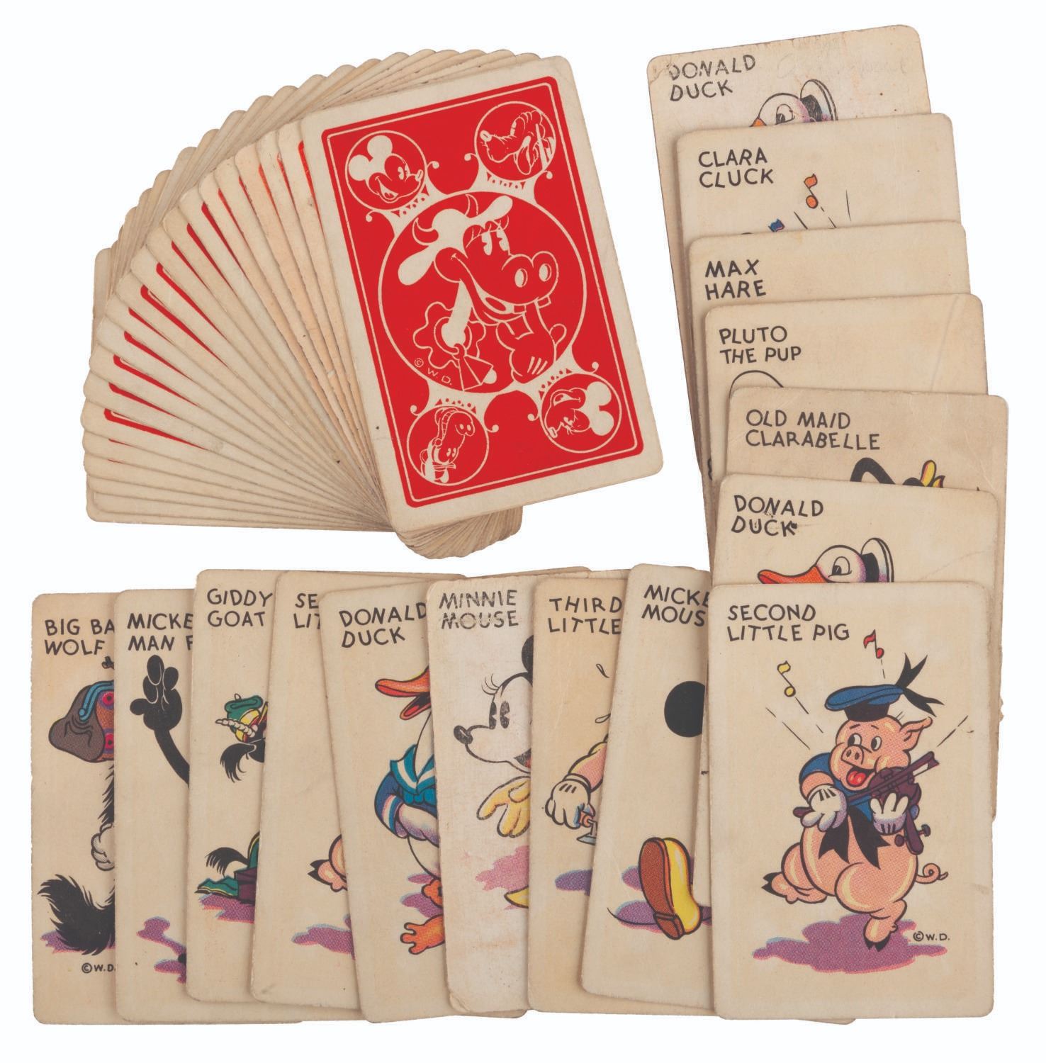 (Whitman, 1937) A set of 38 Mickey Mouse Old Maid cards featuring Mickey, Minnie, “The Goof,” Clara Cluck, and many other early Disney characters. Measuring 2.25” x 3.5”, the cards are in good to very good condition with stains, creases, and discoloration from age.