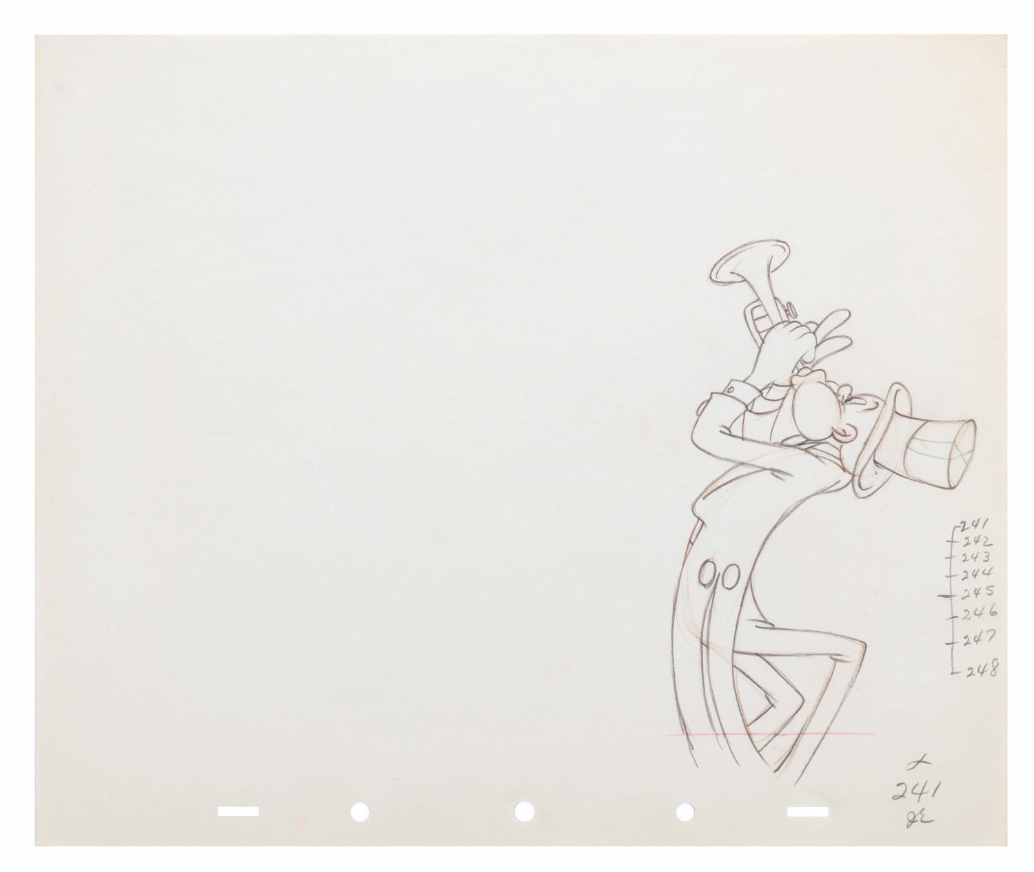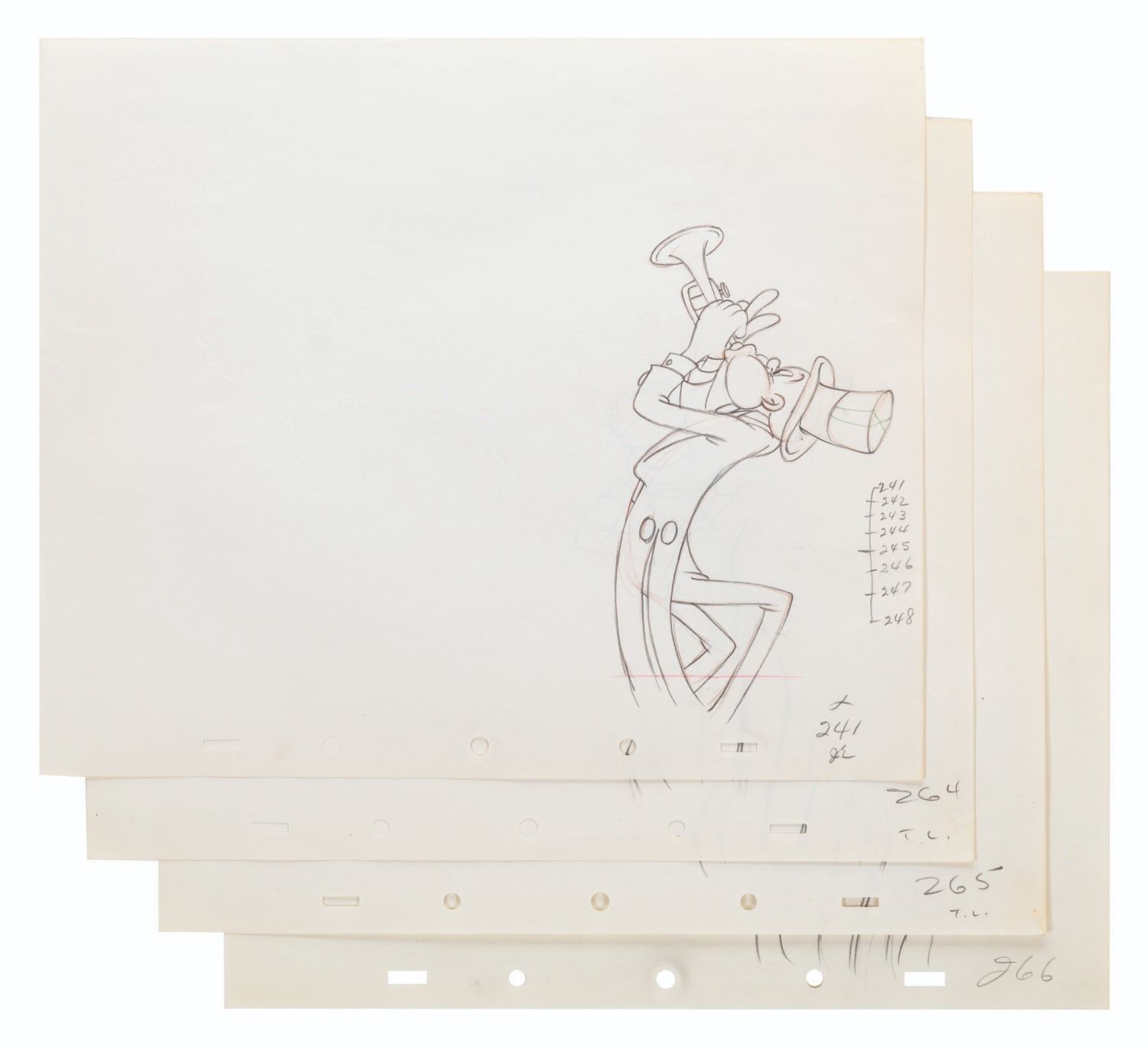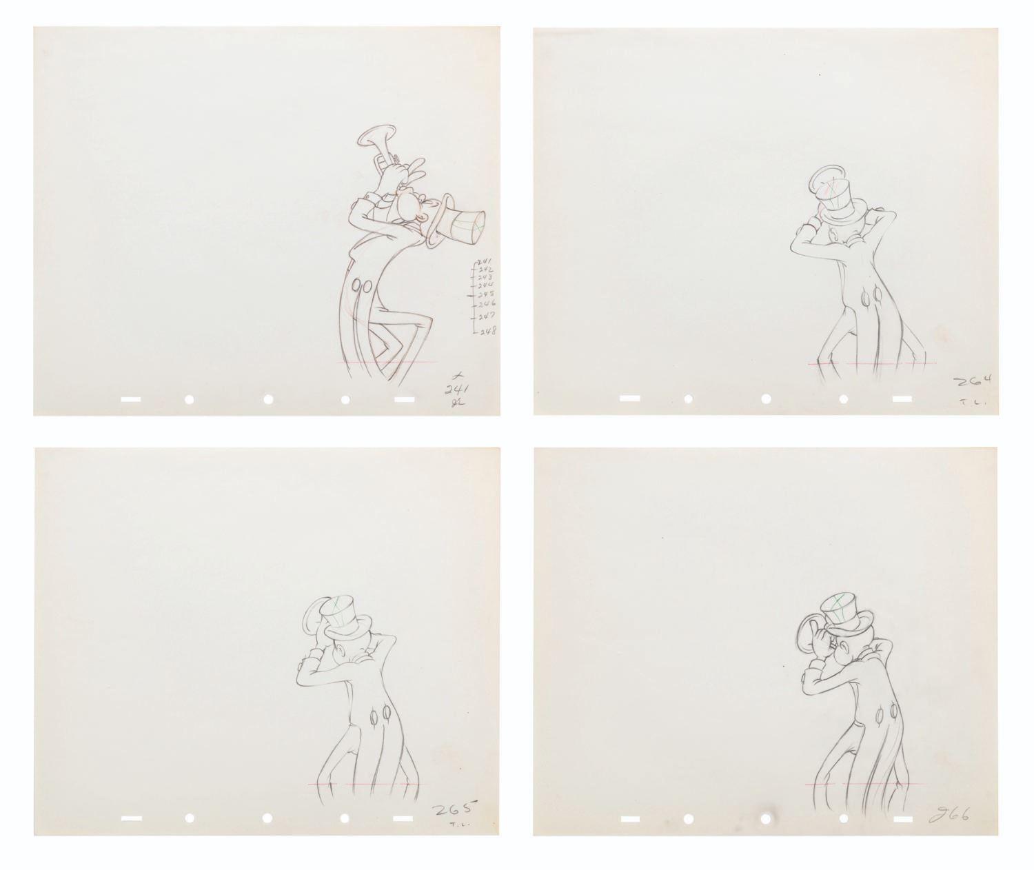 (Disney, 1938) A collection of four production drawings from the Silly Symphony short "Mother Goose Goes Hollywood." With image sizes ranging from 3.25" x 5.5" to 3.5" x 6.5" on 10" x 12" animation paper, the graphite and colored pencil drawings are in very good condition with light creases, minor edge wear, and spots of discoloration from age.
