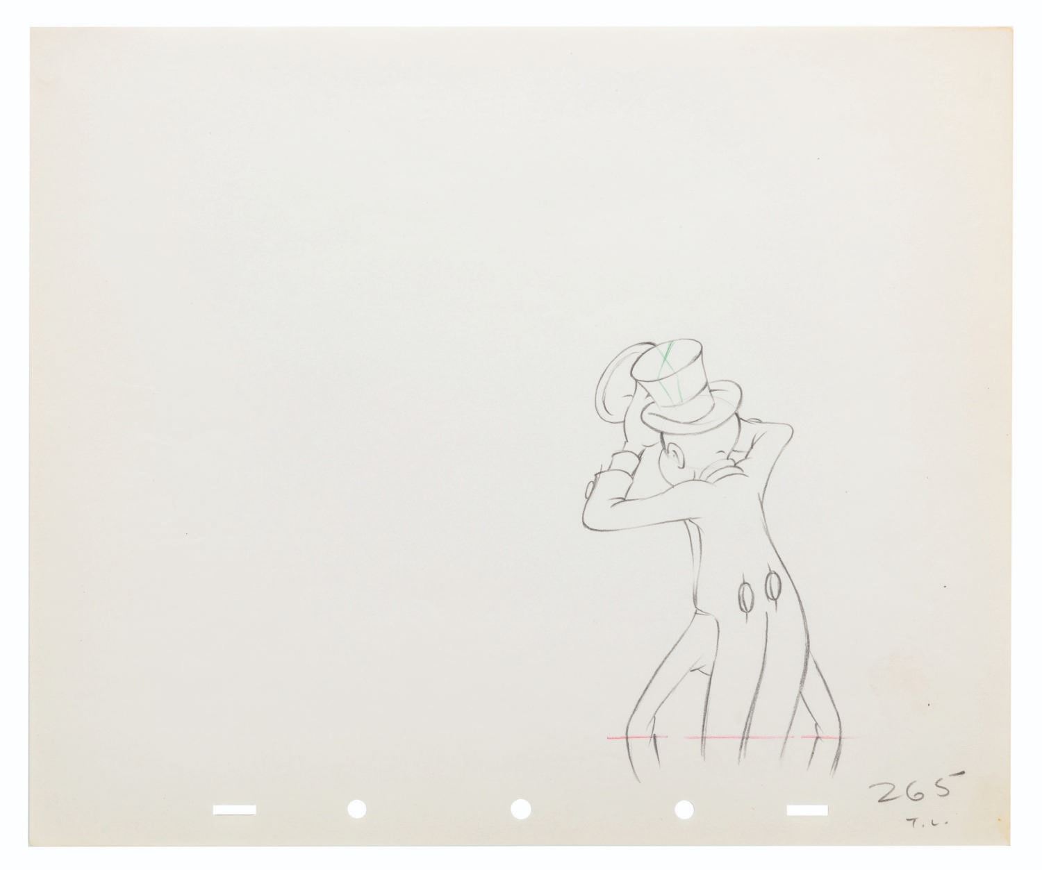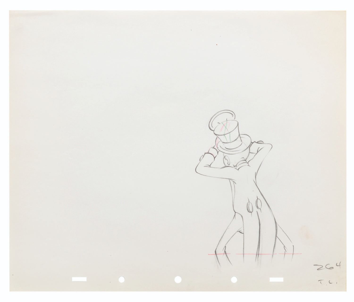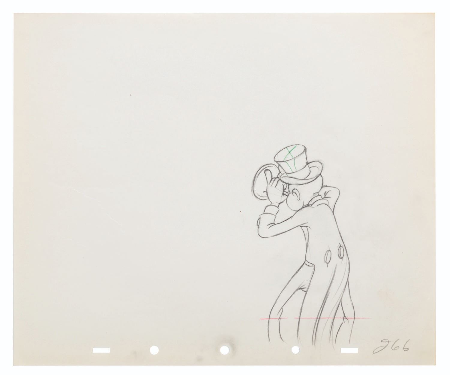 (Disney, 1938) A collection of four production drawings from the Silly Symphony short "Mother Goose Goes Hollywood." With image sizes ranging from 3.25" x 5.5" to 3.5" x 6.5" on 10" x 12" animation paper, the graphite and colored pencil drawings are in very good condition with light creases, minor edge wear, and spots of discoloration from age.