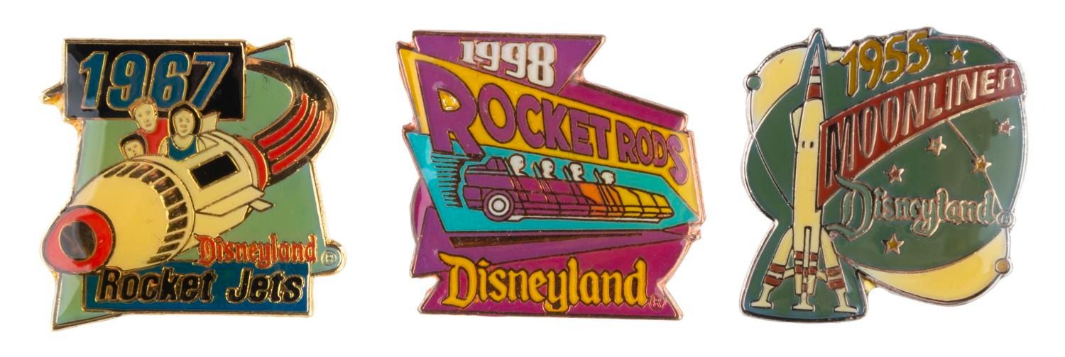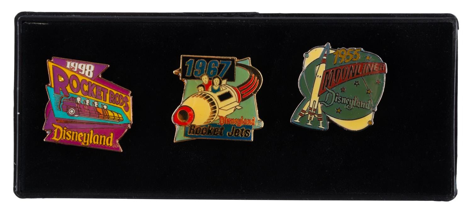 (Disneyland, 1998) A three-piece pin set given to select members of the press at the grand opening of the New Tomorrowland refurbishment in 1998. The set includes pins for Rocket Rods, Rocket Jets, and the Moonliner. The 1” x 1” pins are in fine condition and presented in the original 2” x 5” display box in fair condition with cracks and a chip.