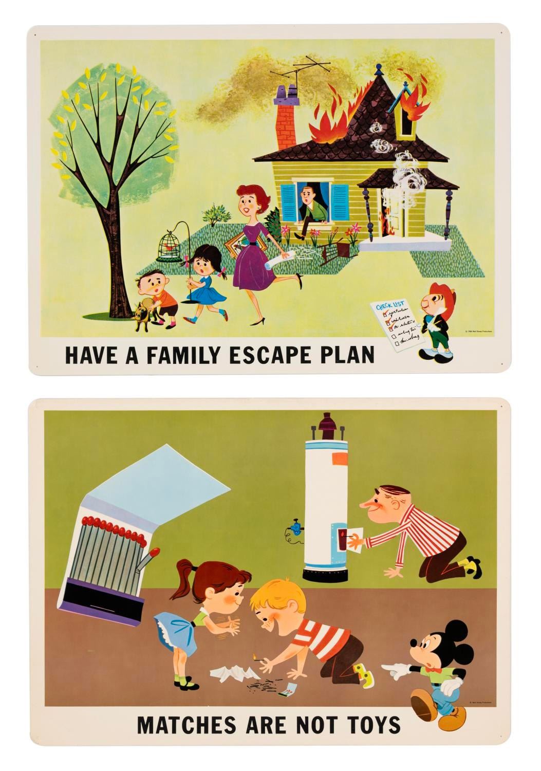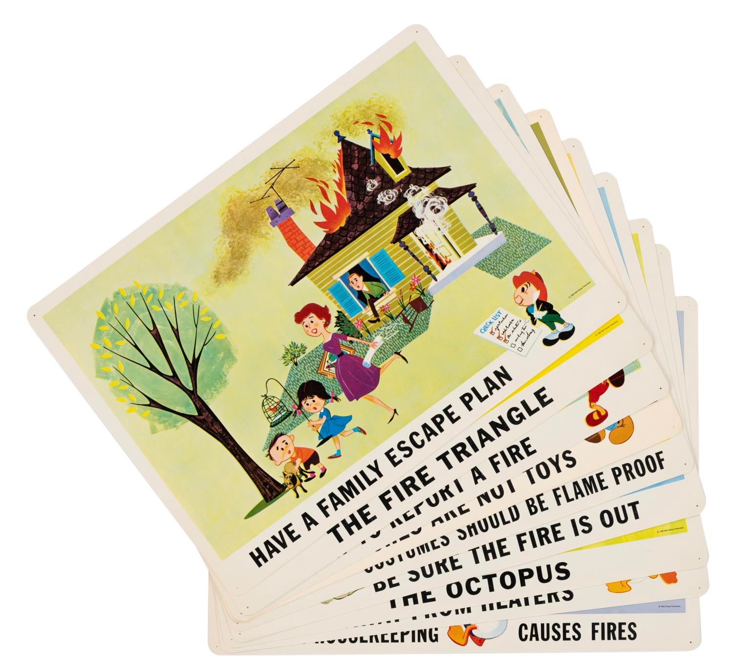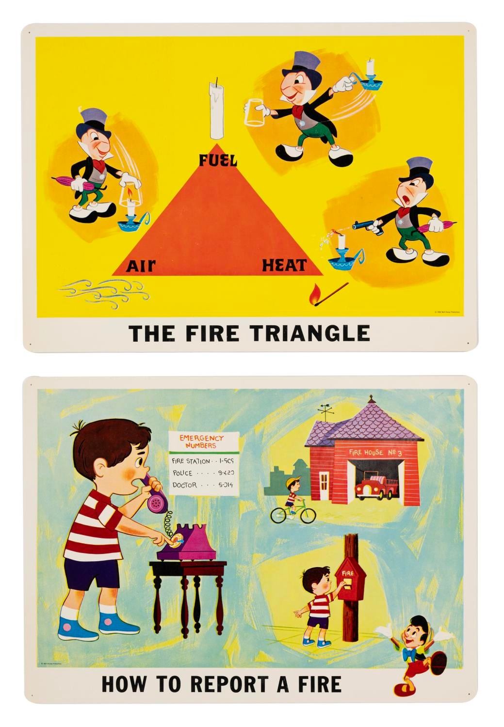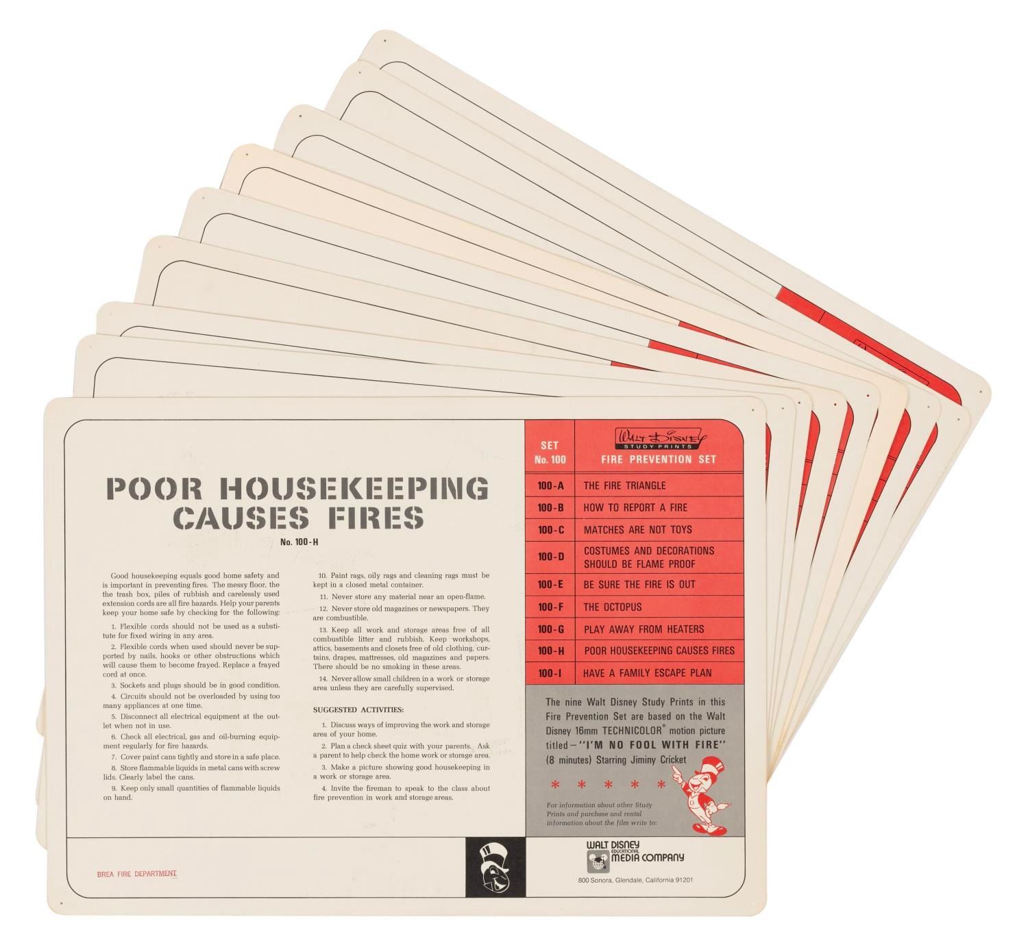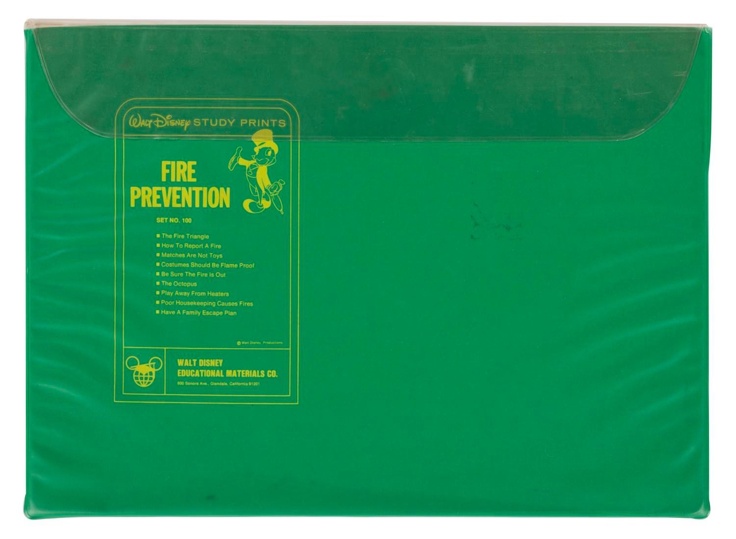 (Disney, 1960s) A complete set of nine Walt Disney No. 100 Fire Prevention Study prints in their original folder. In the 1960s Walt Disney Educational Materials Co. began producing a series of double-sided prints for study aids in elementary schools. Measuring 18" x 13", the prints are in very good condition with light smudging throughout and minimal discoloration from age. The exterior folder is in good condition with light wrinkling a tear along the edge and discoloration.