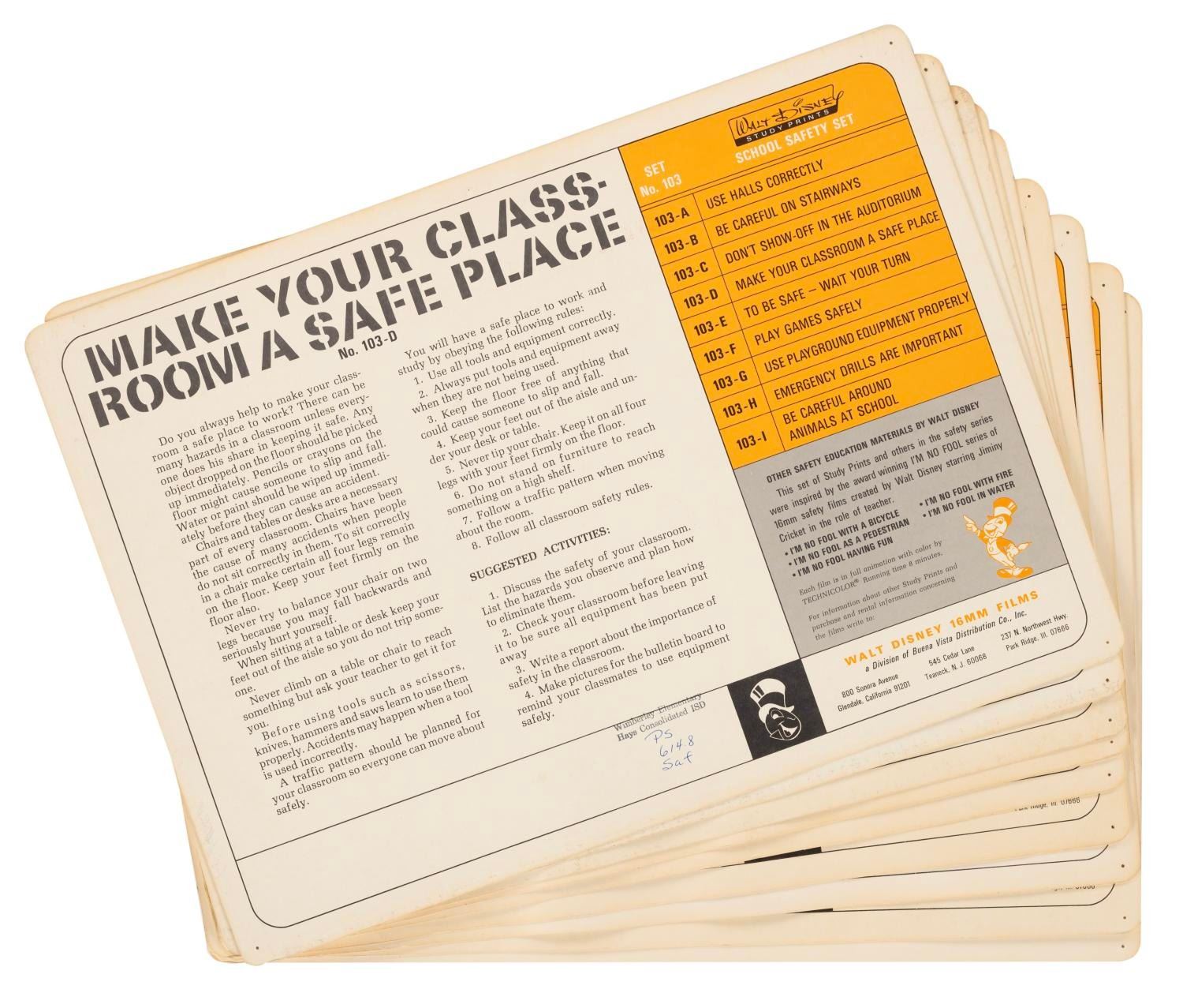 (Disney, 1966) A complete set of nine Walt Disney No. 103 School Safety Study prints in their original cardboard case which converts into an easel. In the 1960s Walt Disney Educational Materials Co. began producing a series of double-sided prints for study aids in elementary schools. Measuring 18" x 13" each, the prints are in good condition with handling wear, light warping along the bottom edge of all prints, staple and pin holes in the top corners and along the top edge, and library markings in pen ink. The case measures 22" x 15.5" and is in fair condition with water damage, edge wear, creasing, discoloration from age, as well as handwritten library markings and a card holder.