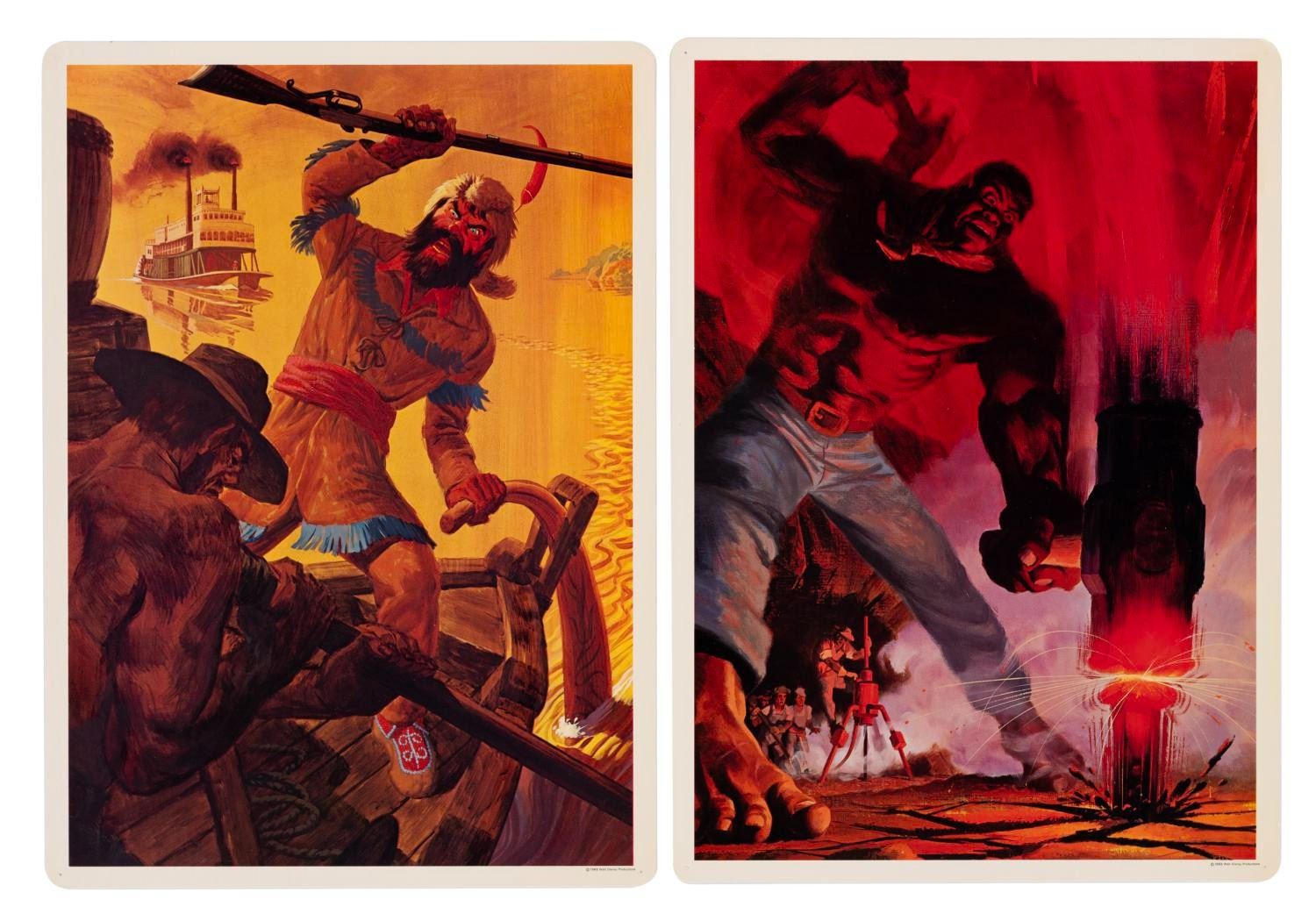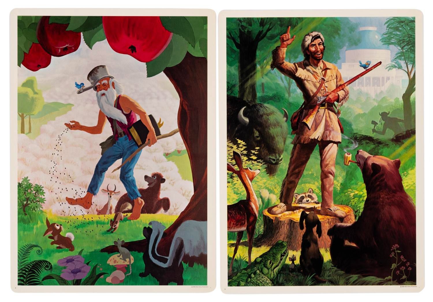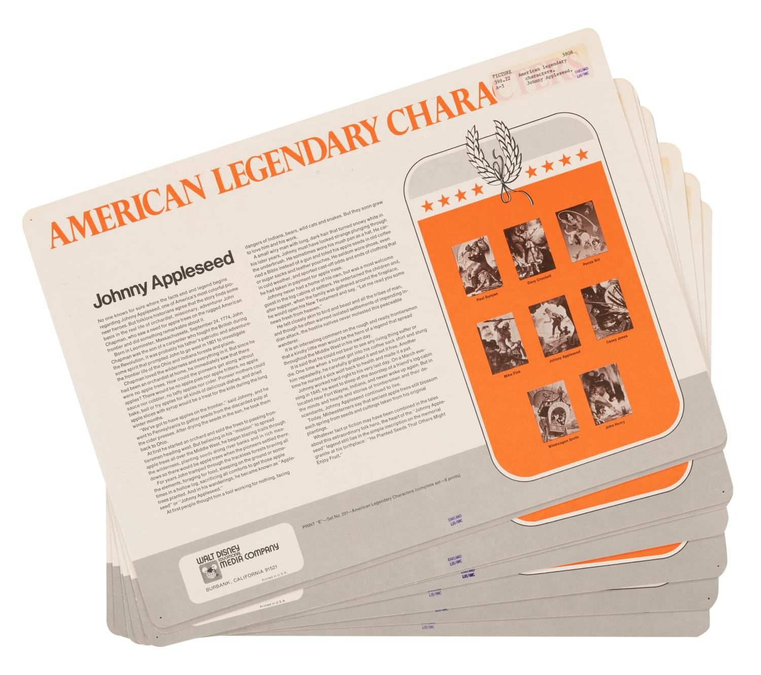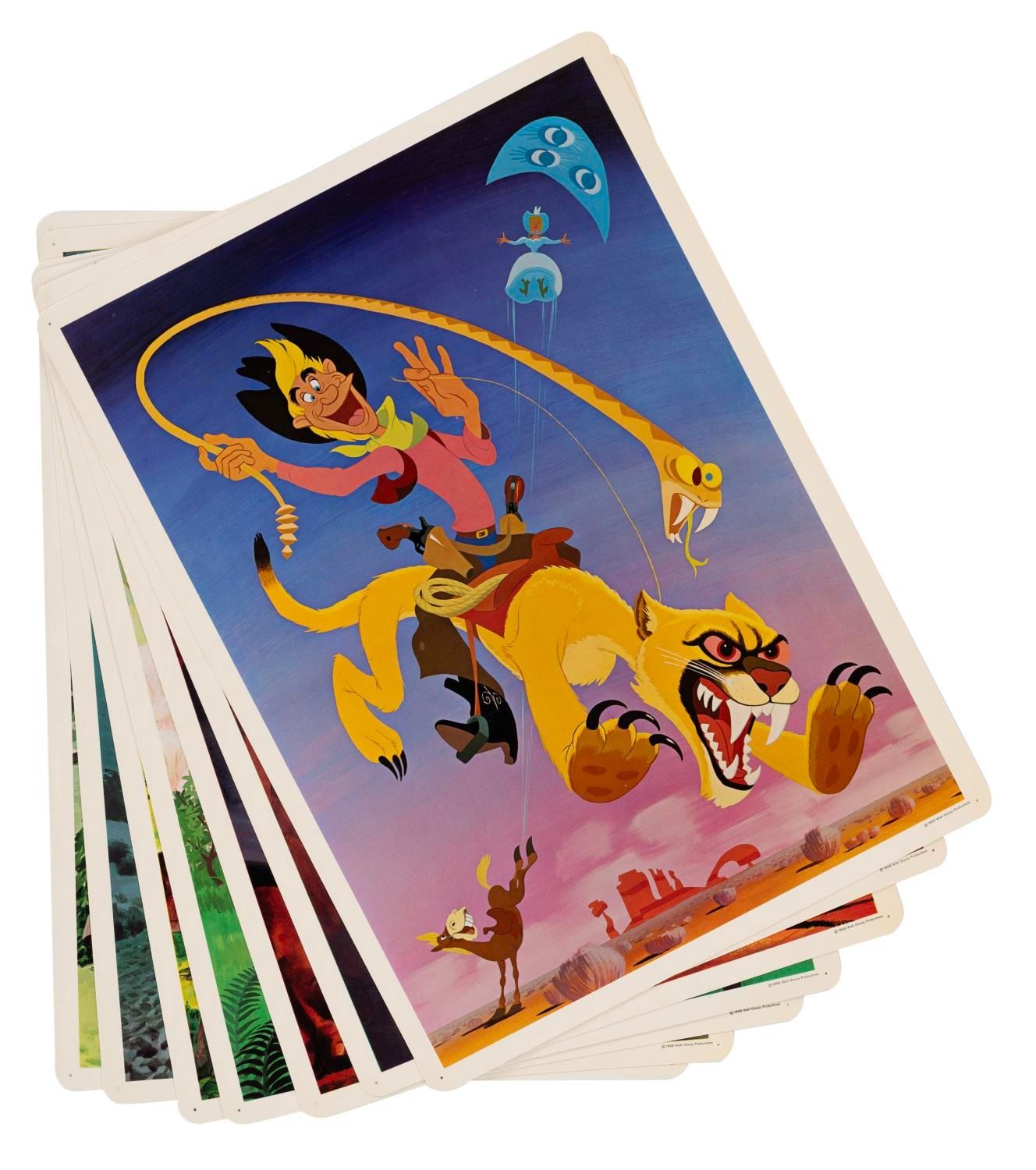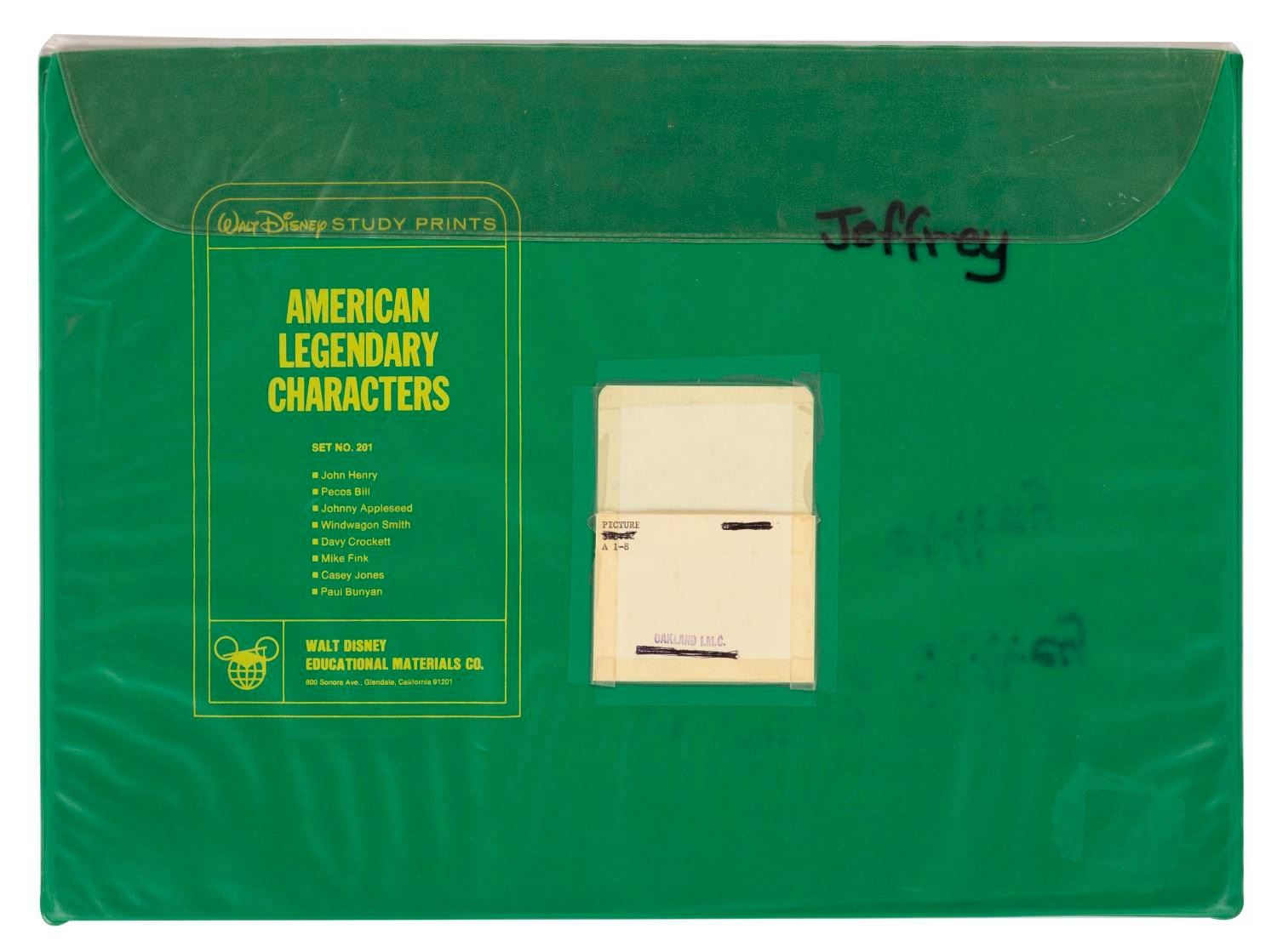 (Disney, 1968) A complete set of eight Walt Disney No. 201 Legendary Characters Study prints in their original vinyl folder. In the 1960s, Walt Disney Educational Materials Co. began producing a series of double-sided prints for study aids in elementary schools. Measuring 13" x 18" each, the prints are in very good condition with light edge wear and a library sticker affixed to the back top right corner. The exterior folder is in good condition with light rippling, a name written in Sharpie, and a library card holder taped to the front.