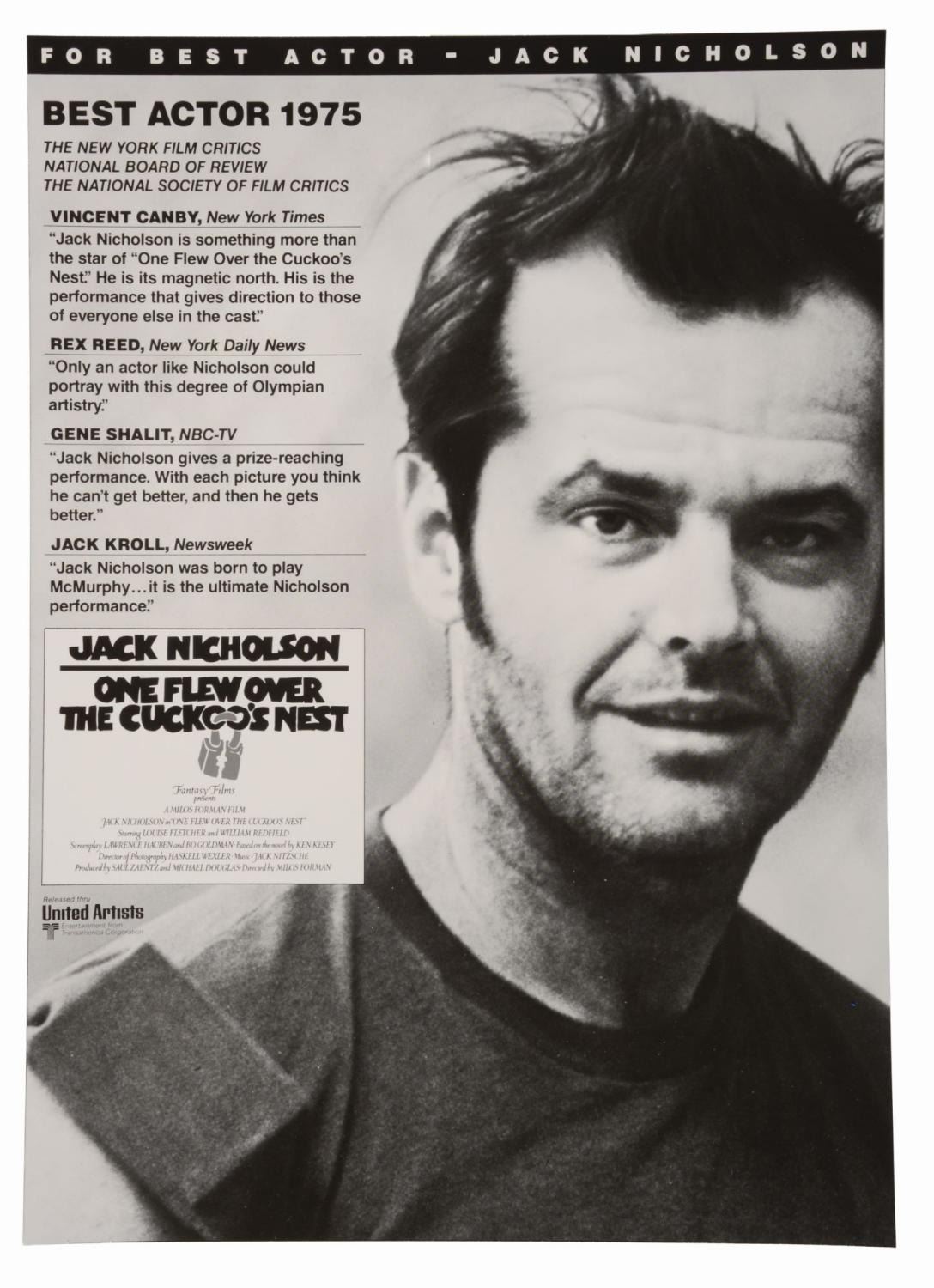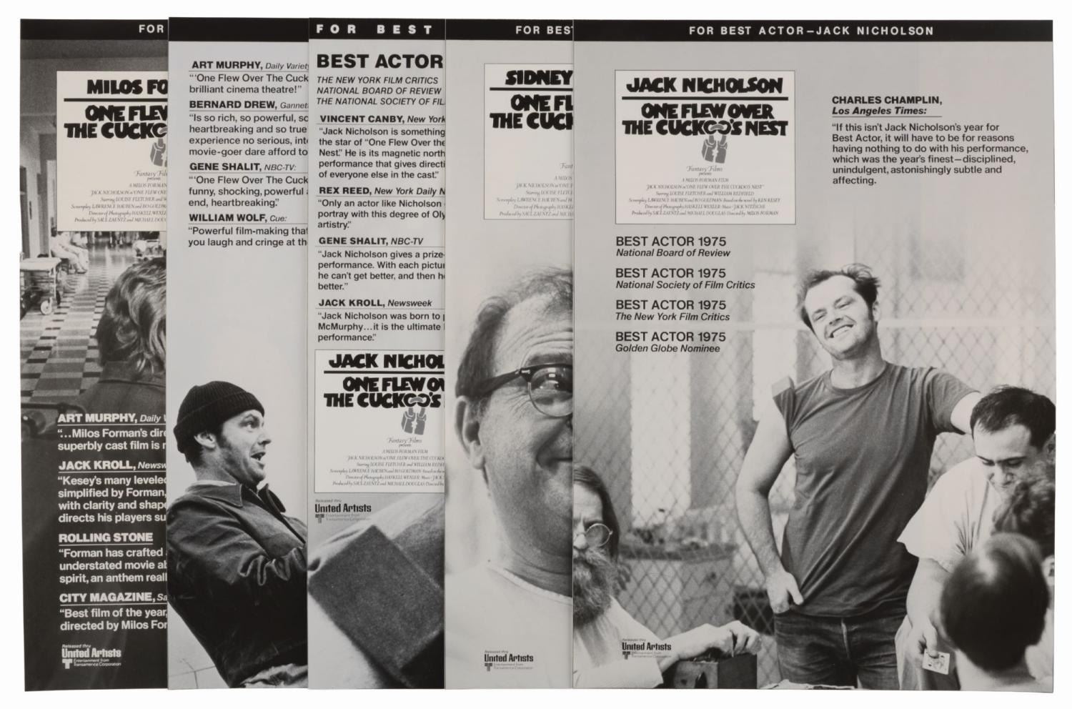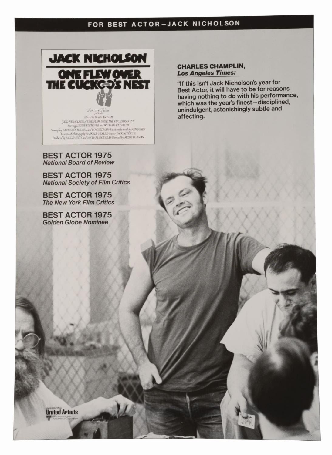 (United Artists, 1975) A set of five "One Flew Over the Cuckoo’s Nest" For Your Consideration ad layouts, including Best Picture, three for Best Actor - Jack Nicholson, and Best Supporting Actor - Sidney Lassick. Measuring 10" x 14", the ads are in very good condition with light creasing.