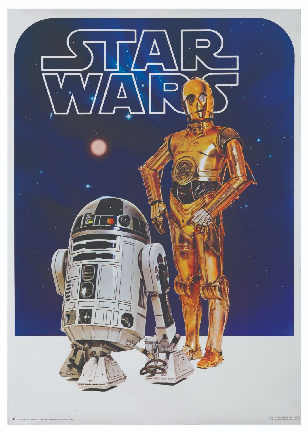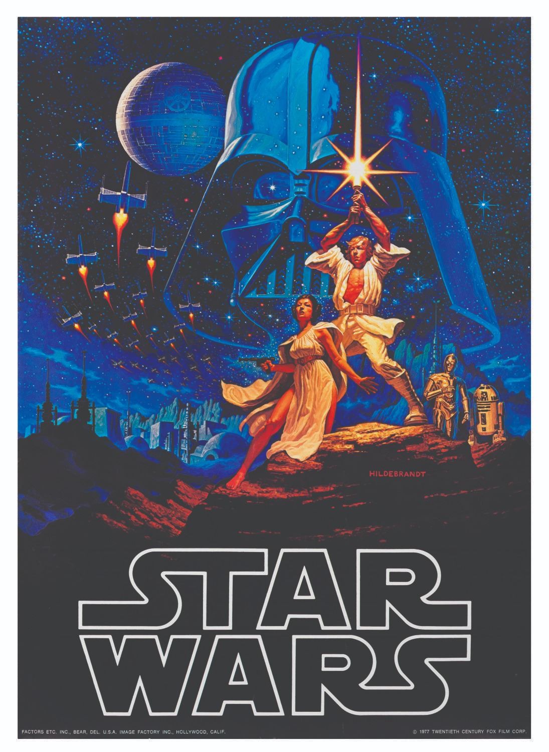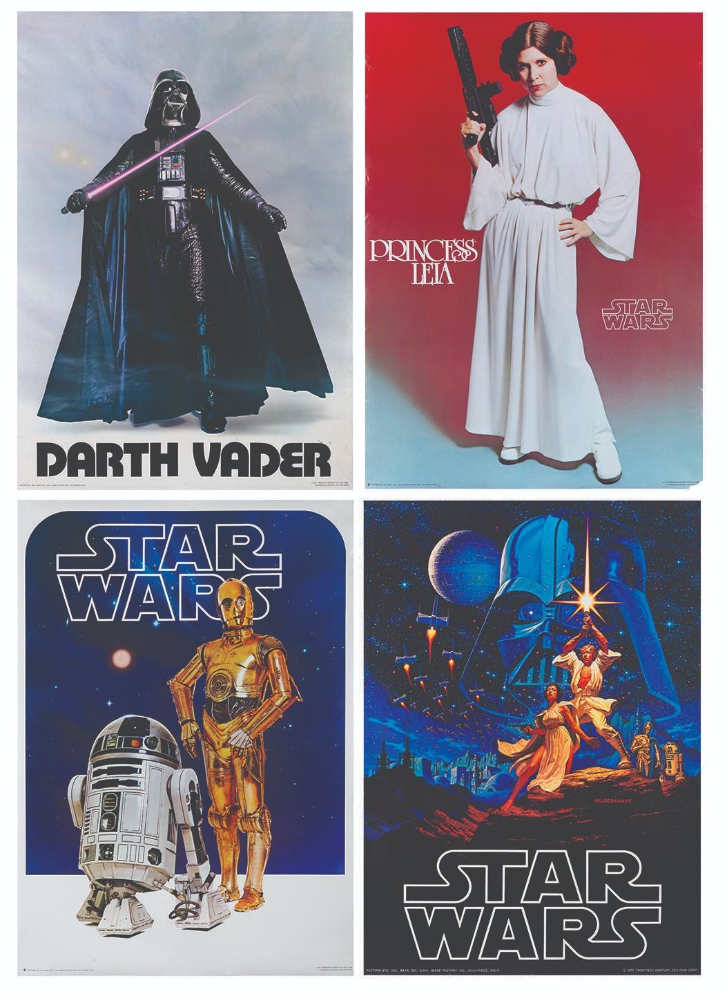 (Factors, 1977) A set of four posters from the original release of the first "Star Wars" film. The huge demand for “Star Wars” merchandise took retailers and manufacturers by surprise. These poster that usually sold at book or record stores were among the first available items. The set includes Princess Leia Organa, Darth Vader Lives!, C-3PO and R2-D2, and the Hildebrandt Brothers’ art for the film. Measuring 20" x 28" each, the posters are in very good condition with light edge and handling wear.