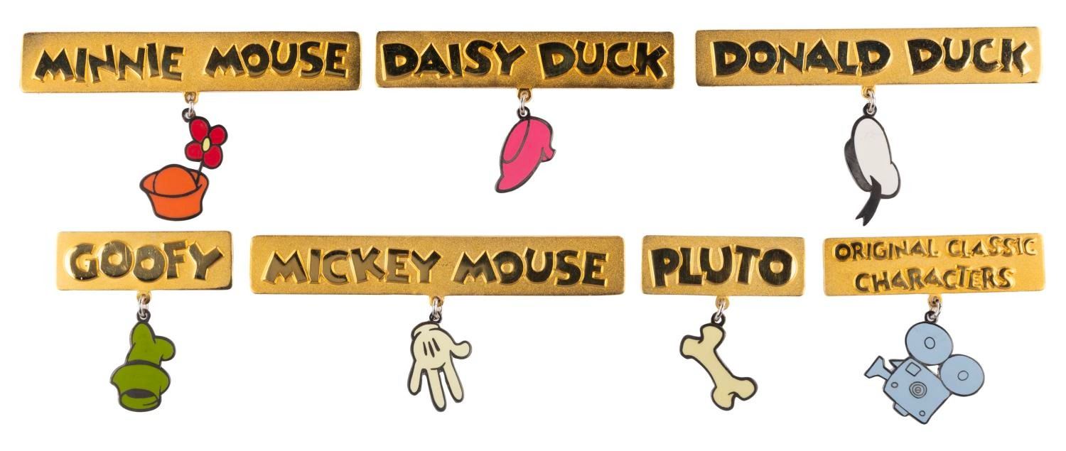 (Disney, 2002) A set of seven Original Classic Character pins sold exclusively through the Disney Catalog in 2002. Included are the title pin, Mickey Mouse, Minnie Mouse, Donald Duck, Daisy Duck, Goofy, and Pluto. Each pin has a dangle feature representing the character, with a movie camera on the title pin. Measuring up to 3” x 1.25”, the pins are in very good condition with some light handling wear including small scratches.