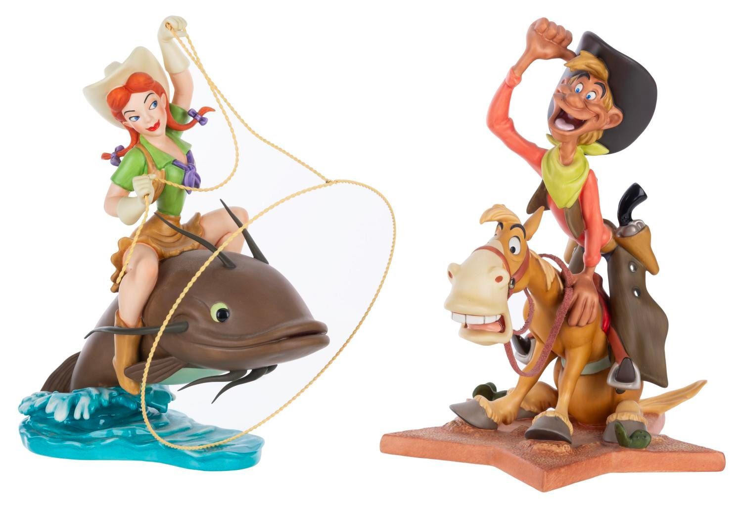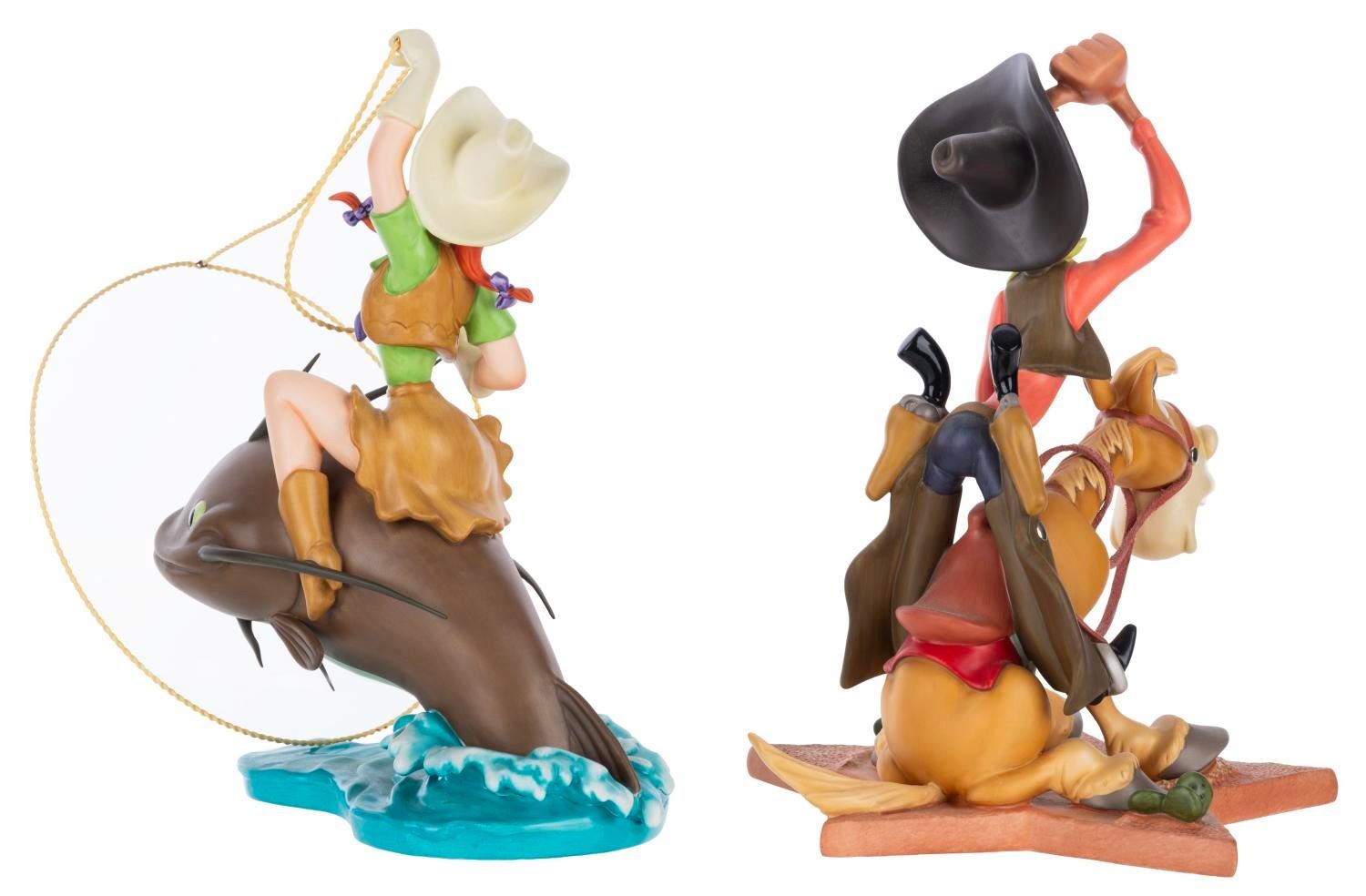 (Disney, 1990s) A pair of Walt Disney Classics Collection porcelain figurines inspired by the Disney film "Melody Time." Included are the first and second pieces from the "American Folk Heroes Collection," Pecos Bill astride Widowmaker, and Slue Foot Sue riding a catfish. Measuring 8.25" x 8.75" and 10" tall, and 10" x 10" and 7" tall respectively, the figurines are in fine condition. Pecos Bill has the original Certificate of Authenticity.