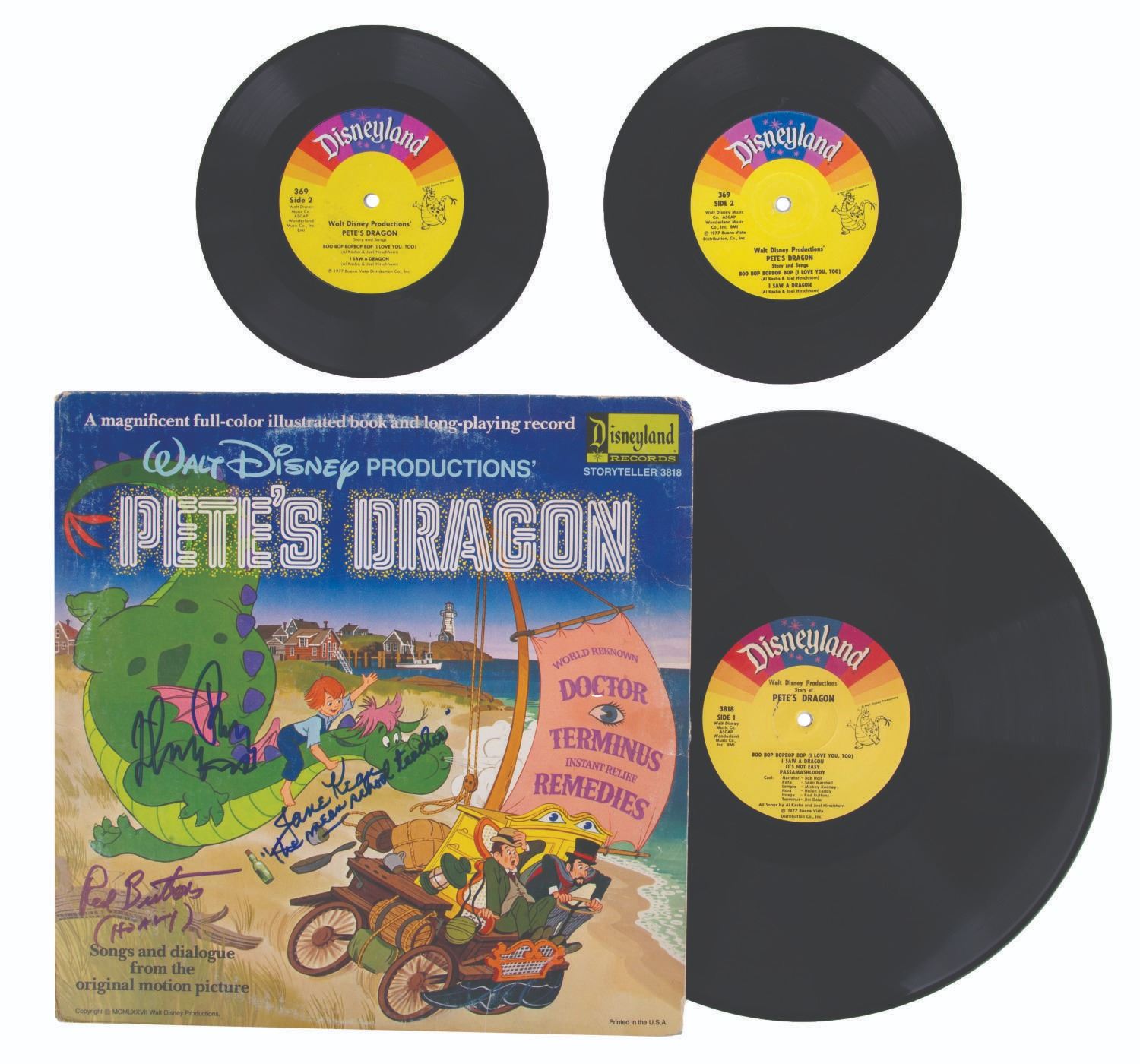(Disney, 1977) An LP album with illustrated book of Pete's Dragon, signed by three members of the film's cast. The signatures include Mickey Rooney (Lampie), Red Buttons (Hoagy), and Jane Kean (Miss Taylor). Also included are two loose 45 rpm singles of the story and songs of Pete's Dragon. The records are all in very good condition, with the 12.25"x12.25" signed sleeve and book are in good condition, with wear typical of handling and age, including scuffing to the cover and edges.
