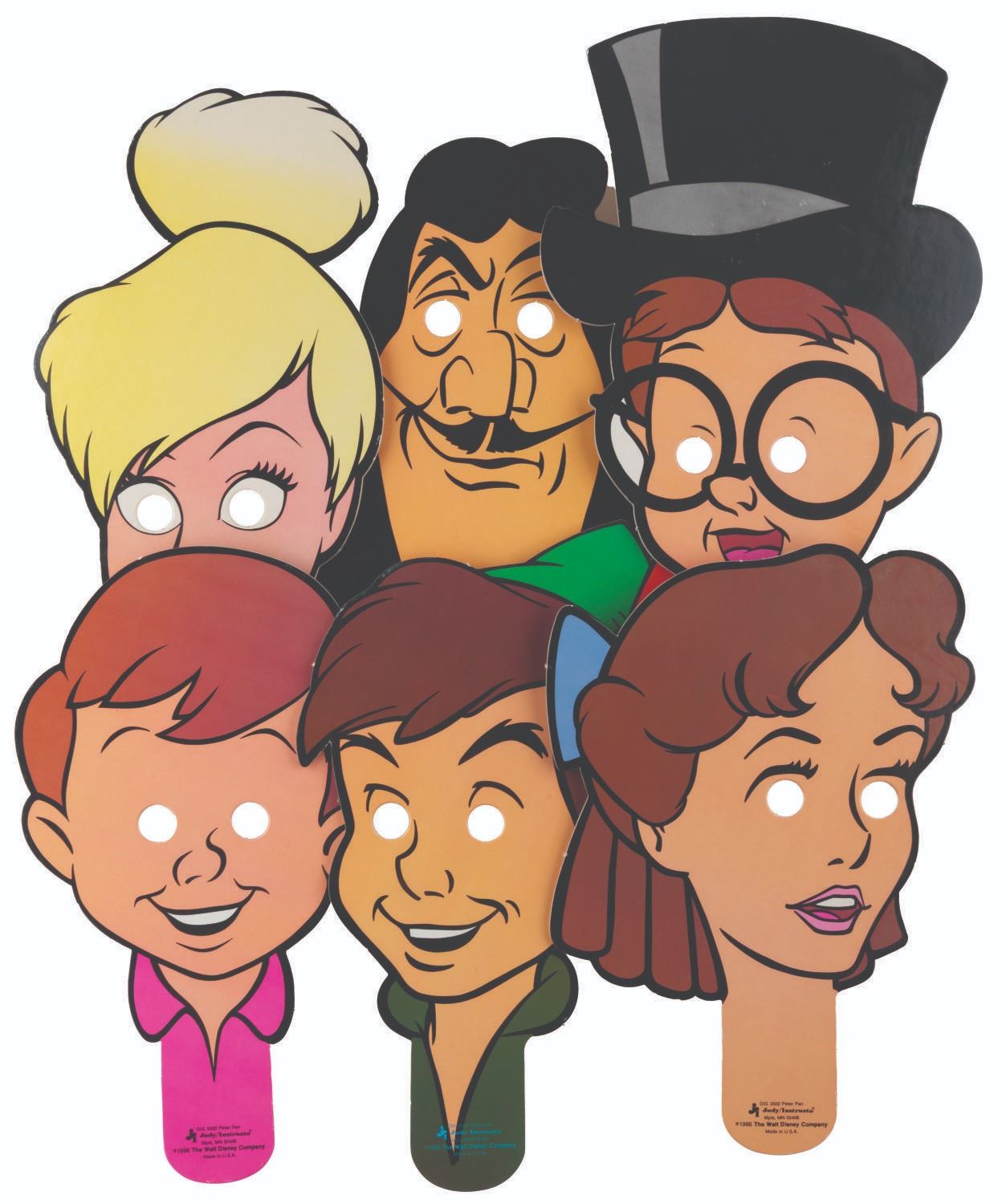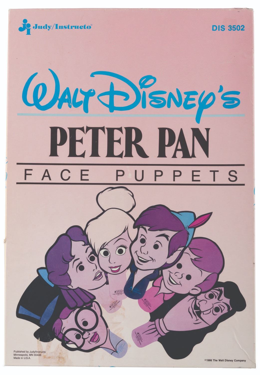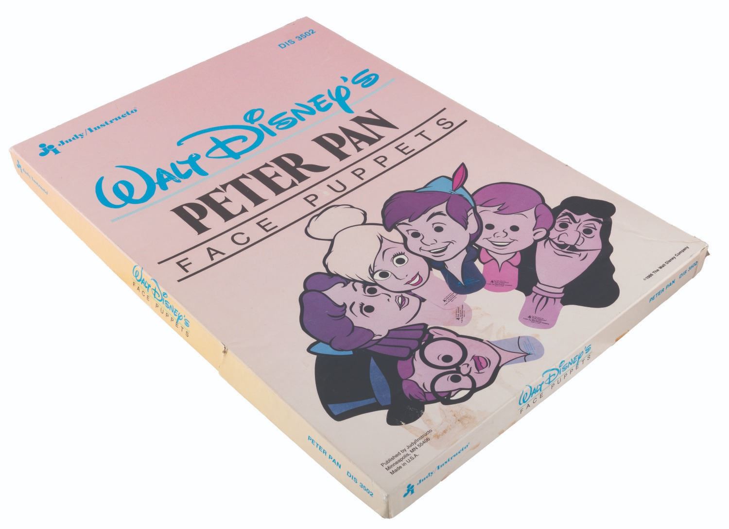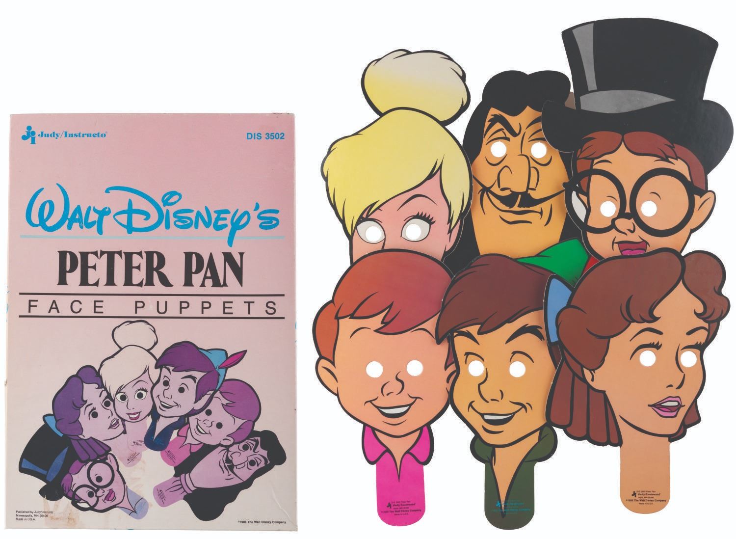 (Judy/Instructo, 1986) A set of Walt Disney's Peter Pan Face Puppets, including cardboard masks of Peter, Tinker Bell, Hook, and the Darling Children. Each measuring up to 11.5" x 18", the hand-held "face puppets" are in good condition with small scuffs and scratches from use. The 13.5" x 19.5" x 1" box is in fair condition with colorfading, handling wear, and stains.