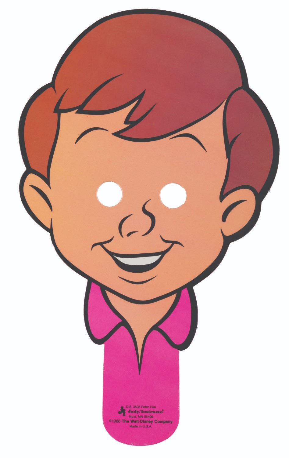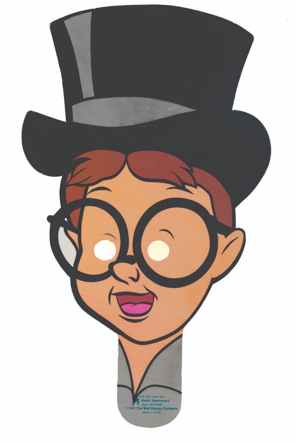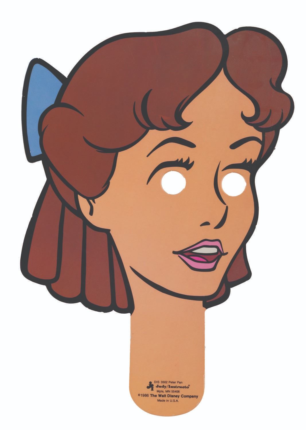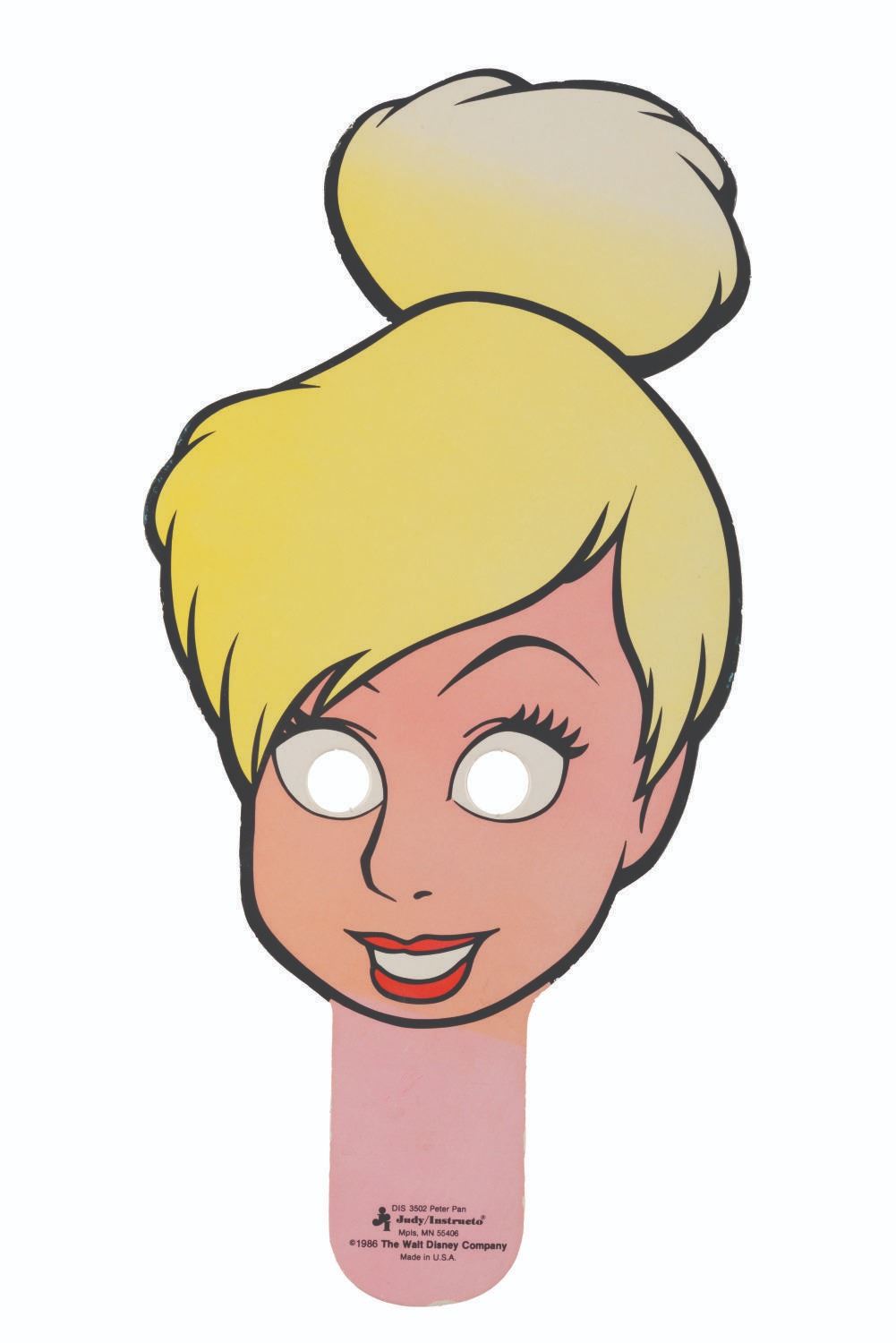 (Judy/Instructo, 1986) A set of Walt Disney's Peter Pan Face Puppets, including cardboard masks of Peter, Tinker Bell, Hook, and the Darling Children. Each measuring up to 11.5" x 18", the hand-held "face puppets" are in good condition with small scuffs and scratches from use. The 13.5" x 19.5" x 1" box is in fair condition with colorfading, handling wear, and stains.