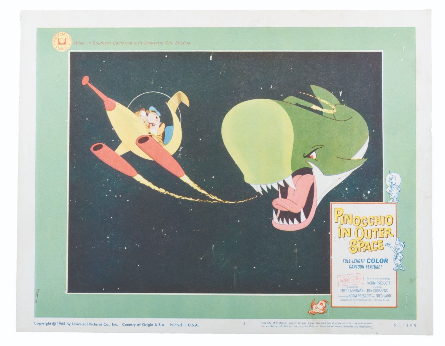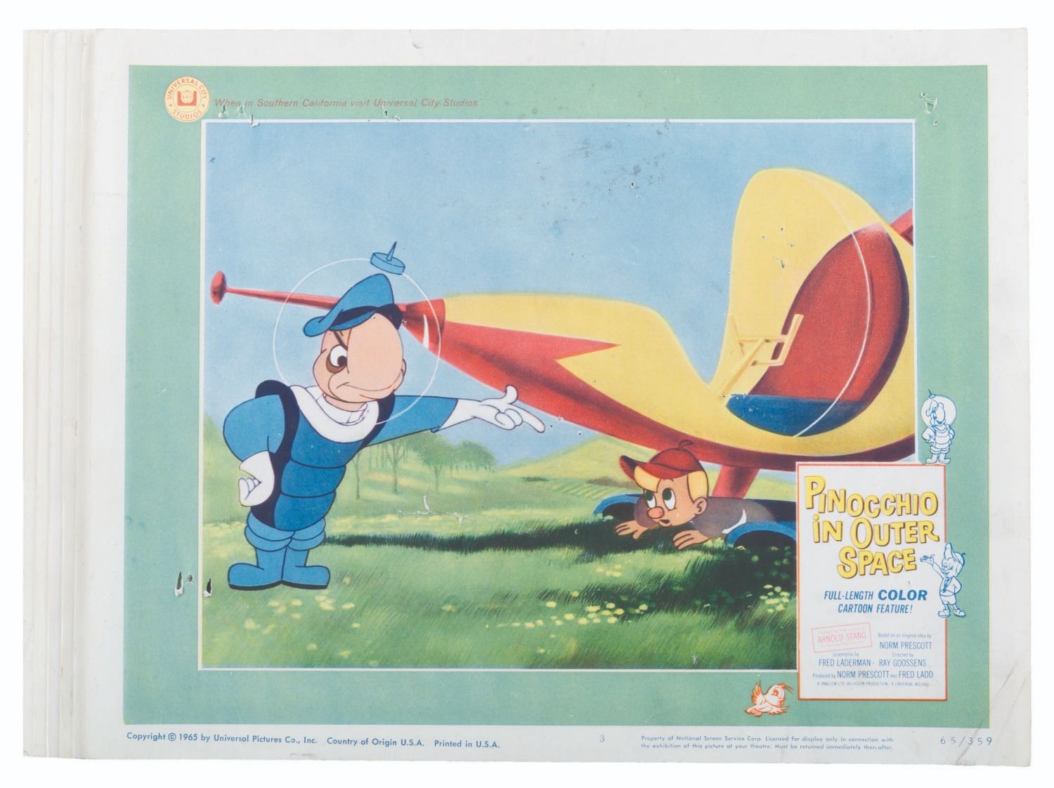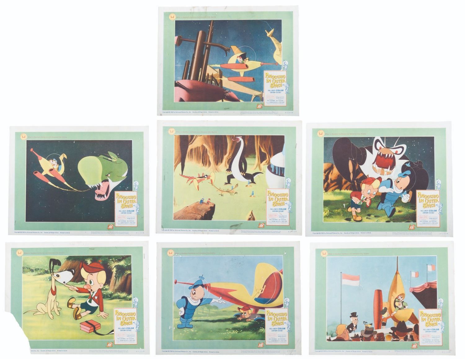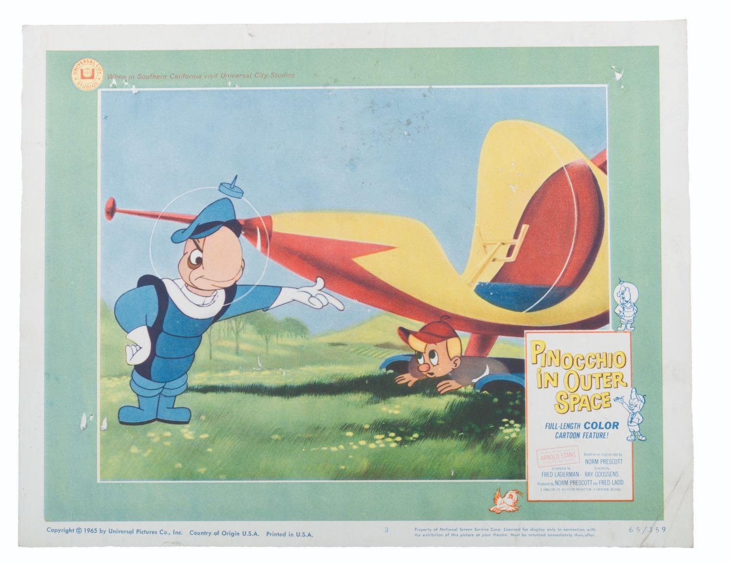 (Universal, 1965) A set of seven lobby cards from "Pinocchio in Outer Space, " produced by Belvision Studios and Norm Prescott of Filmation. Measuring 11 " x 14 " each, the lobby cards are in fair condition with pinholes throughout, soiling, scratches, staples, tears up to 1.25 ", and one card missing its entire lower left side.