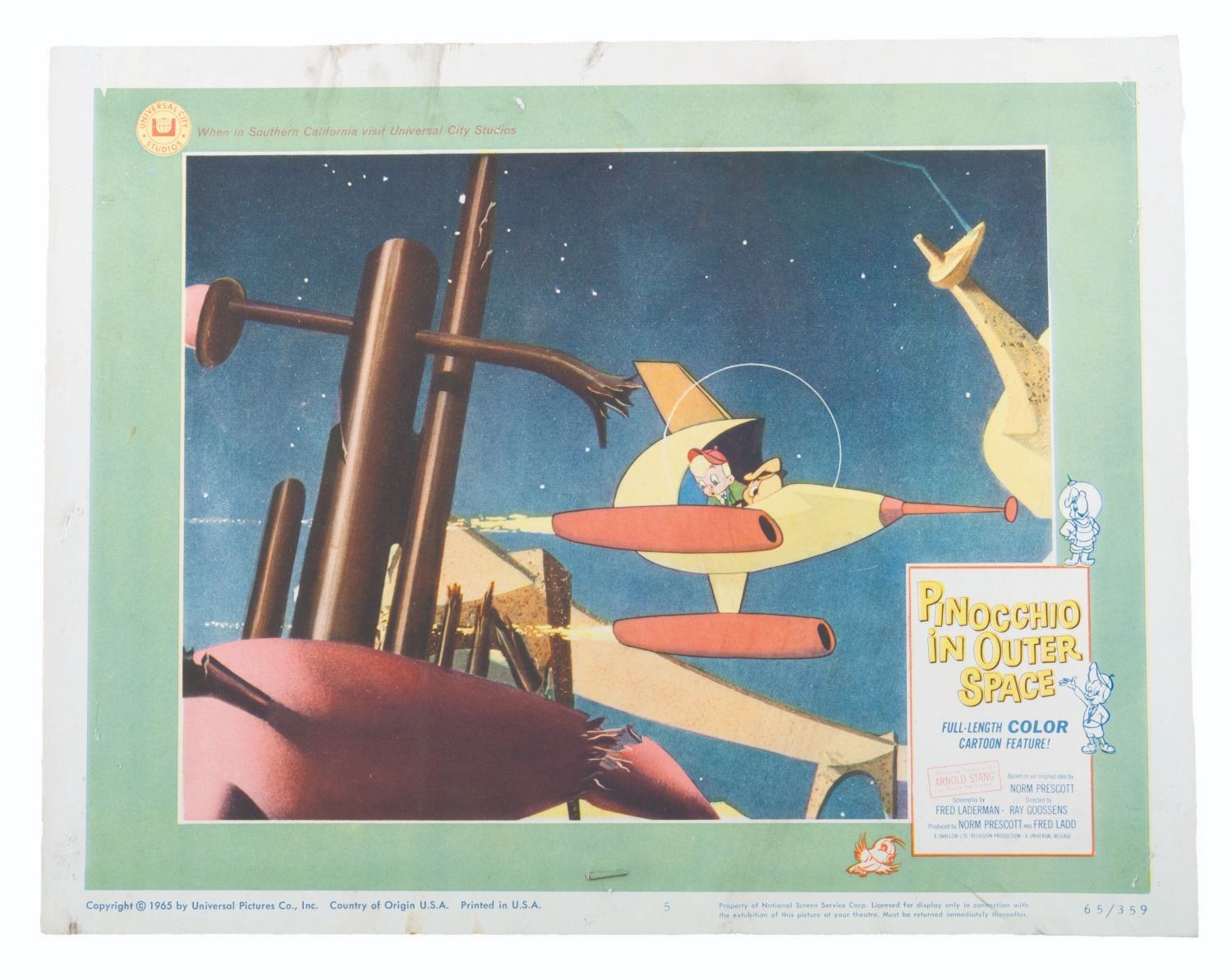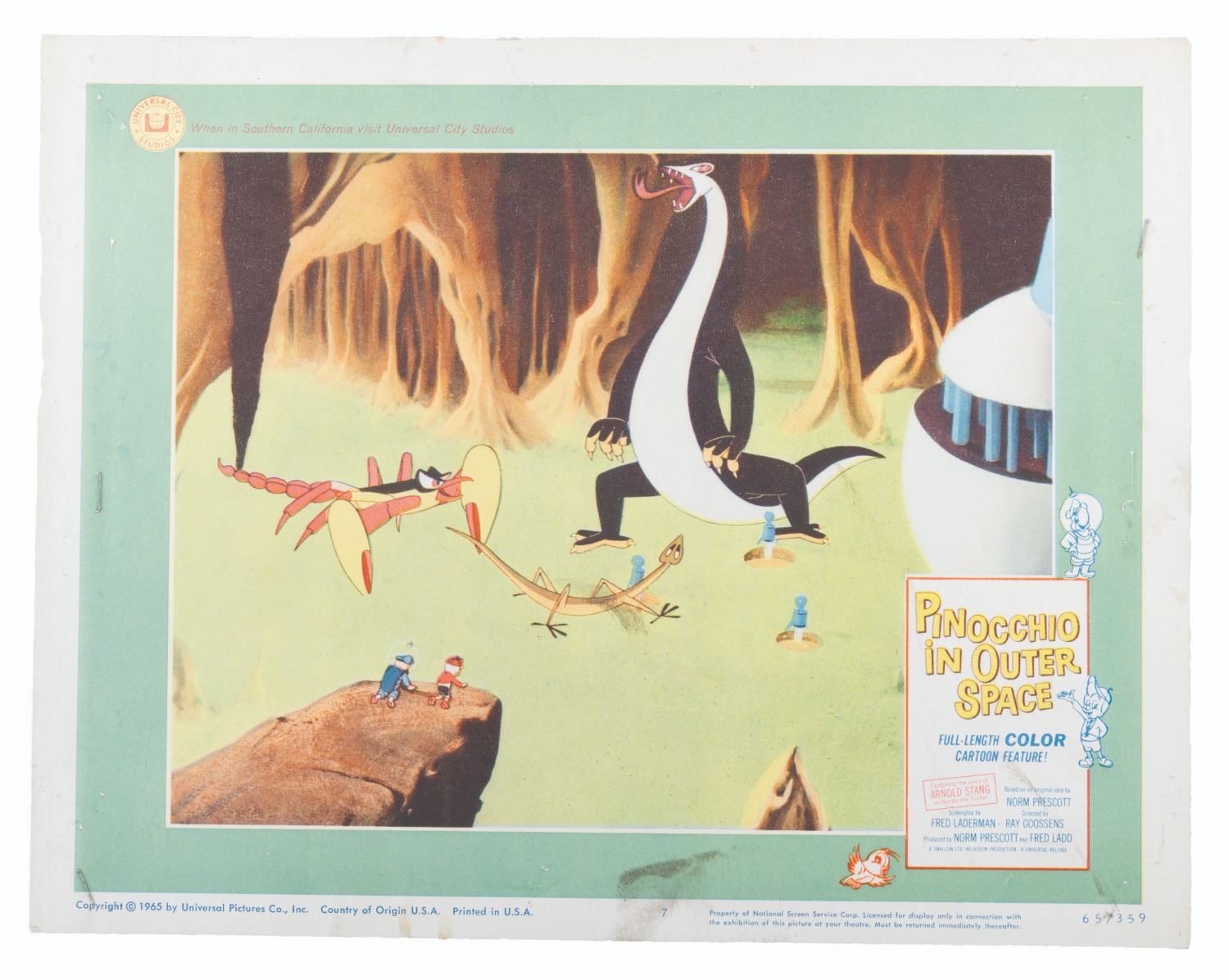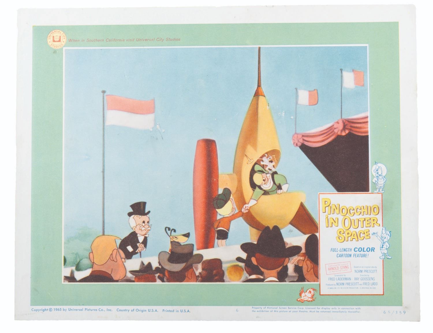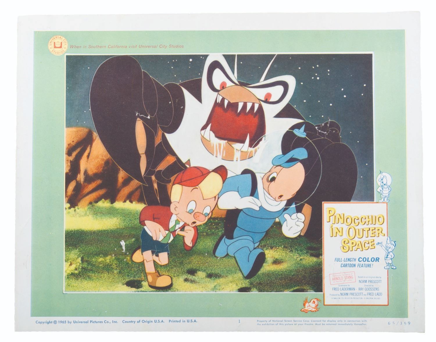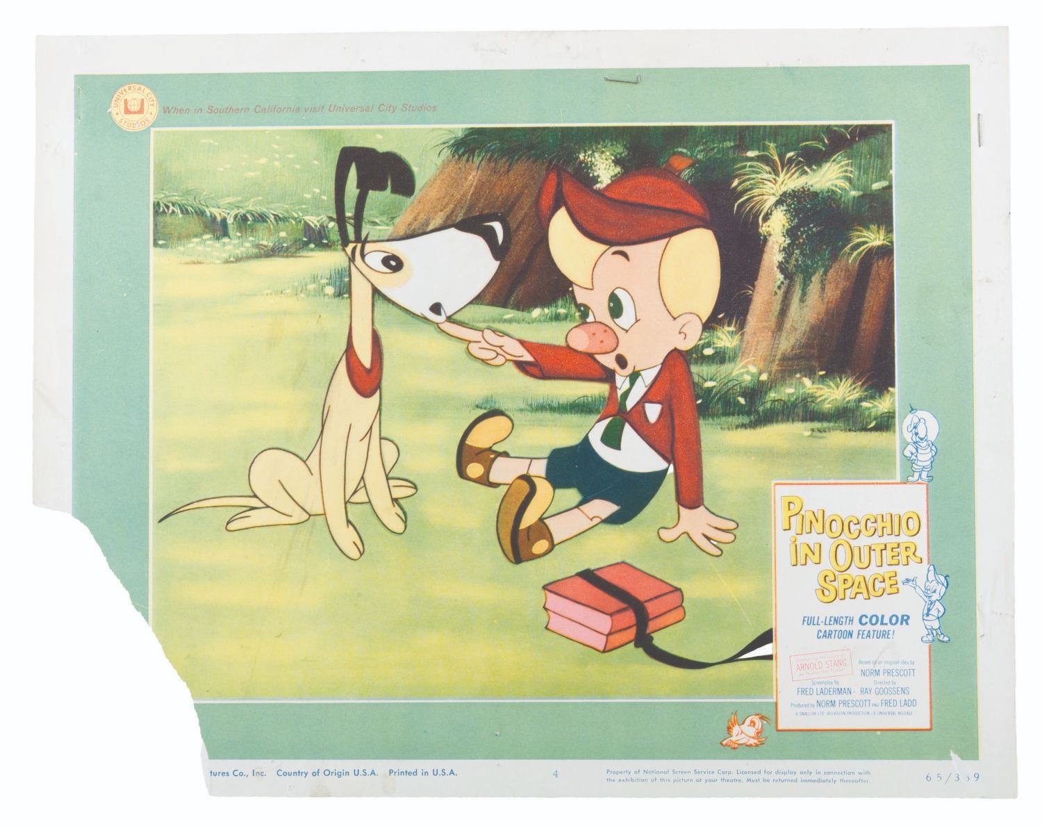 (Universal, 1965) A set of seven lobby cards from "Pinocchio in Outer Space, " produced by Belvision Studios and Norm Prescott of Filmation. Measuring 11 " x 14 " each, the lobby cards are in fair condition with pinholes throughout, soiling, scratches, staples, tears up to 1.25 ", and one card missing its entire lower left side.