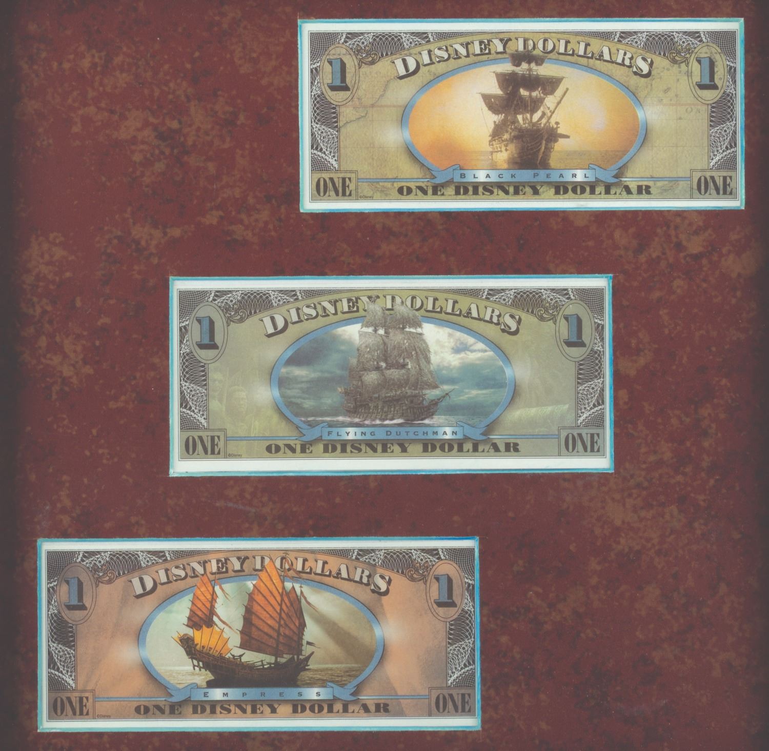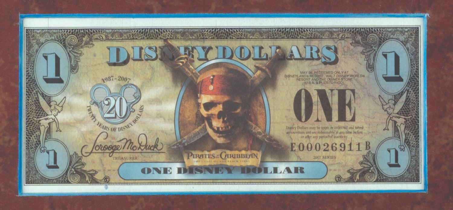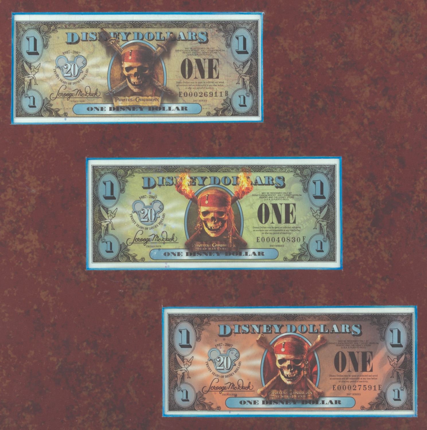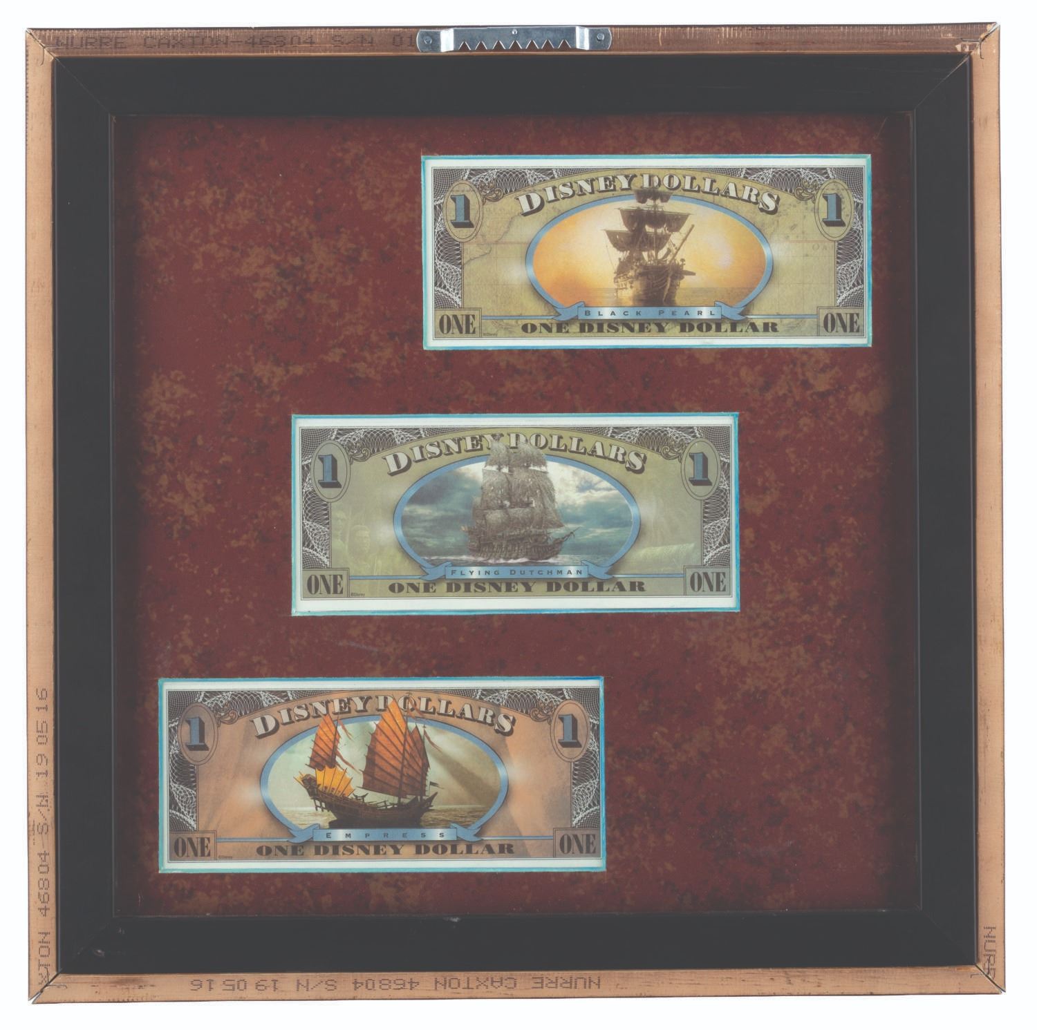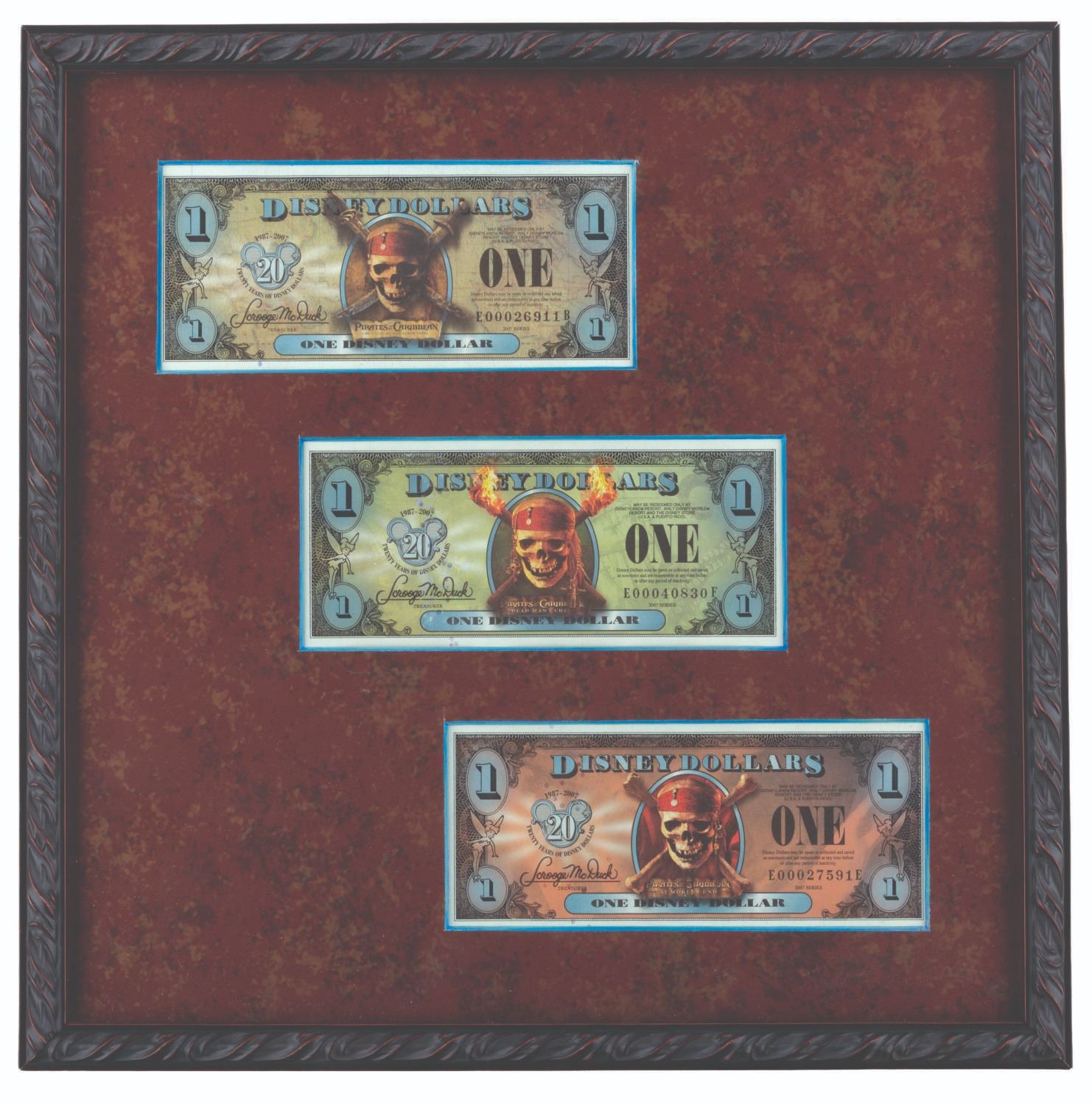 (Disneyland, 2007) A framed set of three Disney Dollars celebrating their 20th anniversary and the three"Pirates of the Caribbean" movies. Each dollar features a skull and crossbones motif in the portrait area, and one of the film titles beneath. The bills are numbered E00026911B, E00040830F, and E00027591E from top to bottom. On the reverse, each dollar features an iconic ship from its respective film: the Black Pearl, the Flying Dutchman, and the Empress. The frame is double-sided, revealing the front and back of the bills. Measuring 13.5" x 13.5" overall, the set is in very good condition with minor wear to the frame, and slight rippling to the dollars from age.