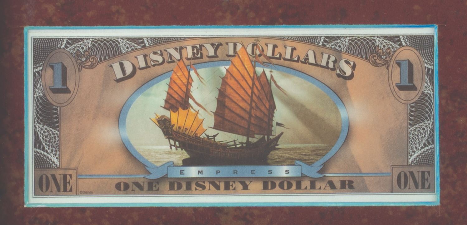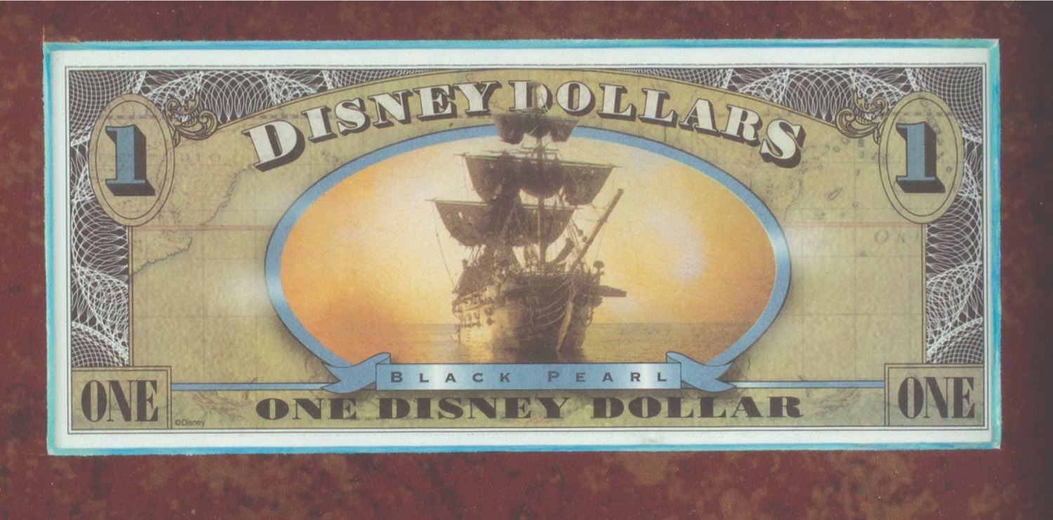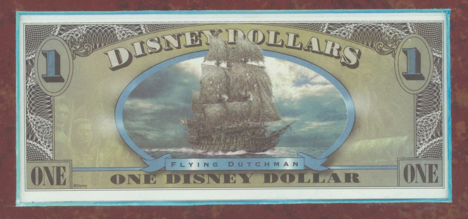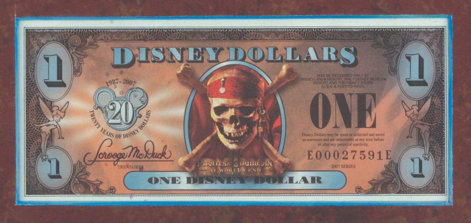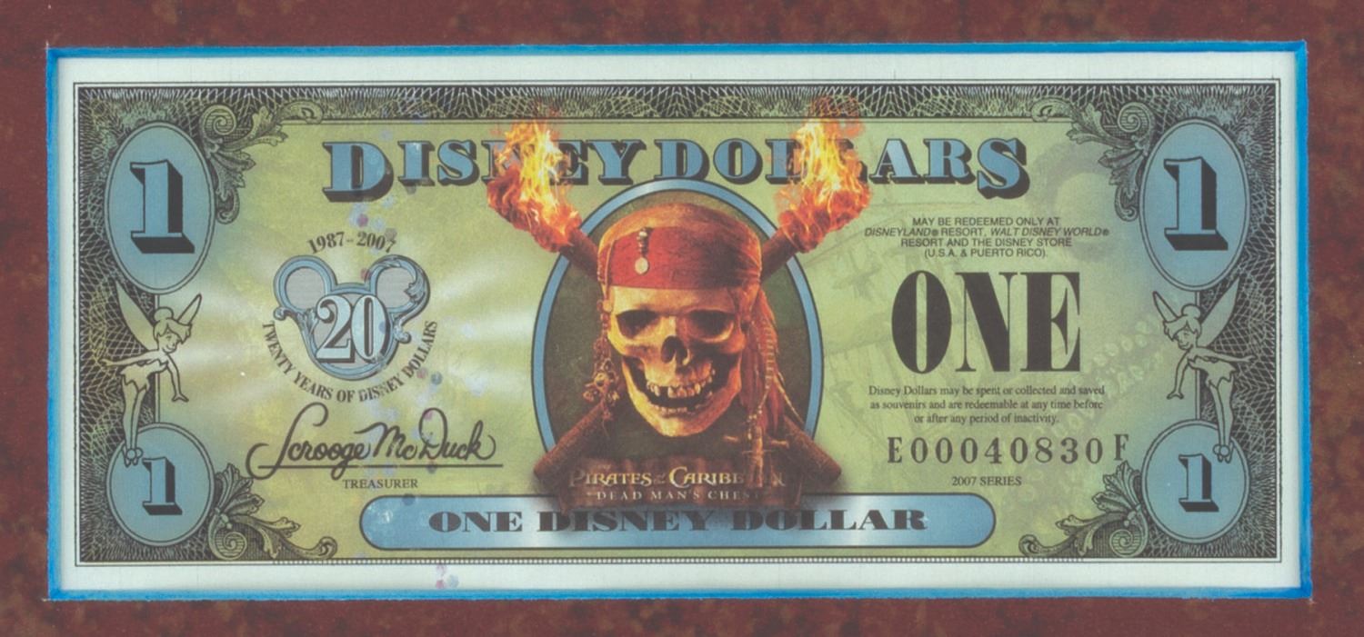 (Disneyland, 2007) A framed set of three Disney Dollars celebrating their 20th anniversary and the three"Pirates of the Caribbean" movies. Each dollar features a skull and crossbones motif in the portrait area, and one of the film titles beneath. The bills are numbered E00026911B, E00040830F, and E00027591E from top to bottom. On the reverse, each dollar features an iconic ship from its respective film: the Black Pearl, the Flying Dutchman, and the Empress. The frame is double-sided, revealing the front and back of the bills. Measuring 13.5" x 13.5" overall, the set is in very good condition with minor wear to the frame, and slight rippling to the dollars from age.
