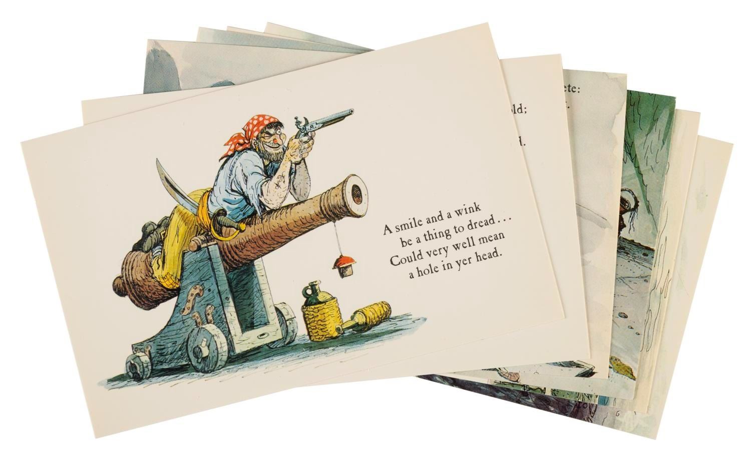 (Disneyland, 1967) A set of six Pirates of the Caribbean souvenir postcards from Disneyland with concept artwork by Disney Legend Marc Davis. Measuring 3.5" x 5.5", the postcards are in very good-to-fine condition with faint scuffs on the back of one card.