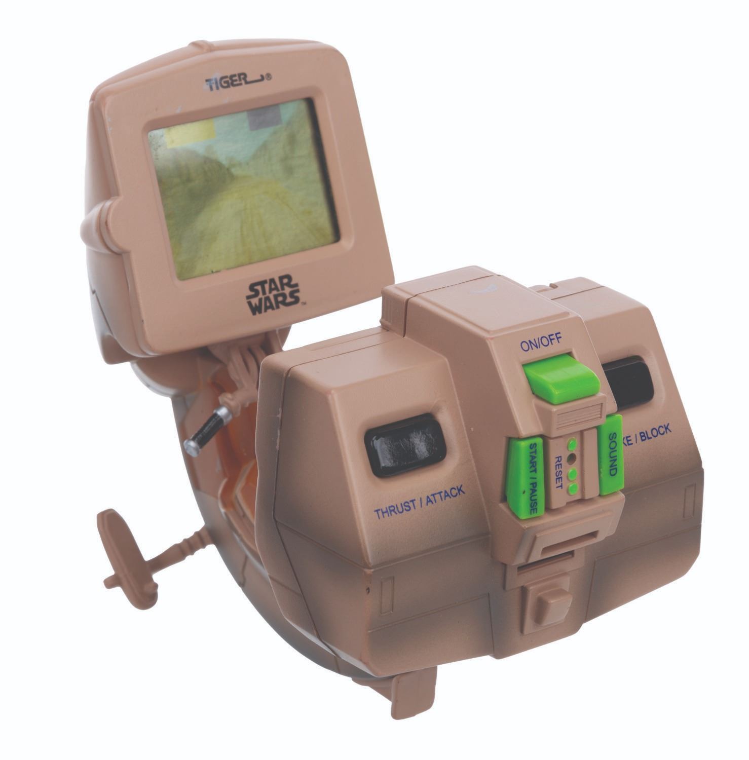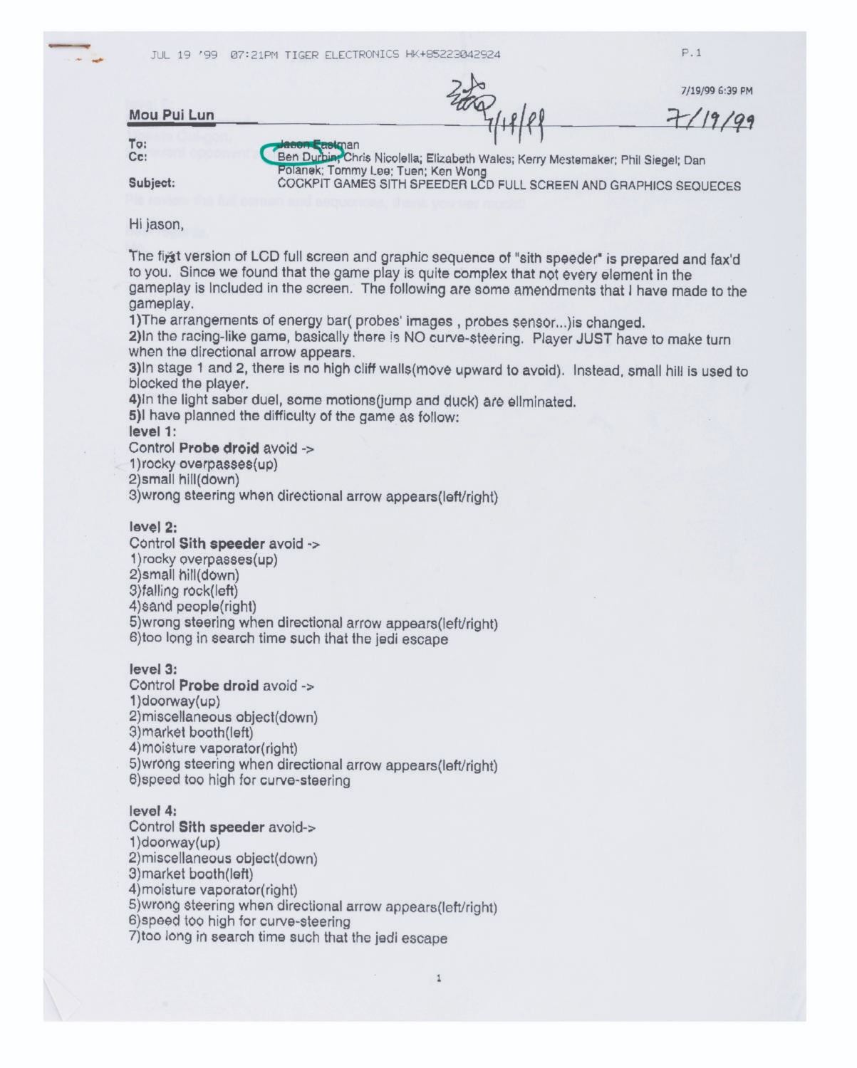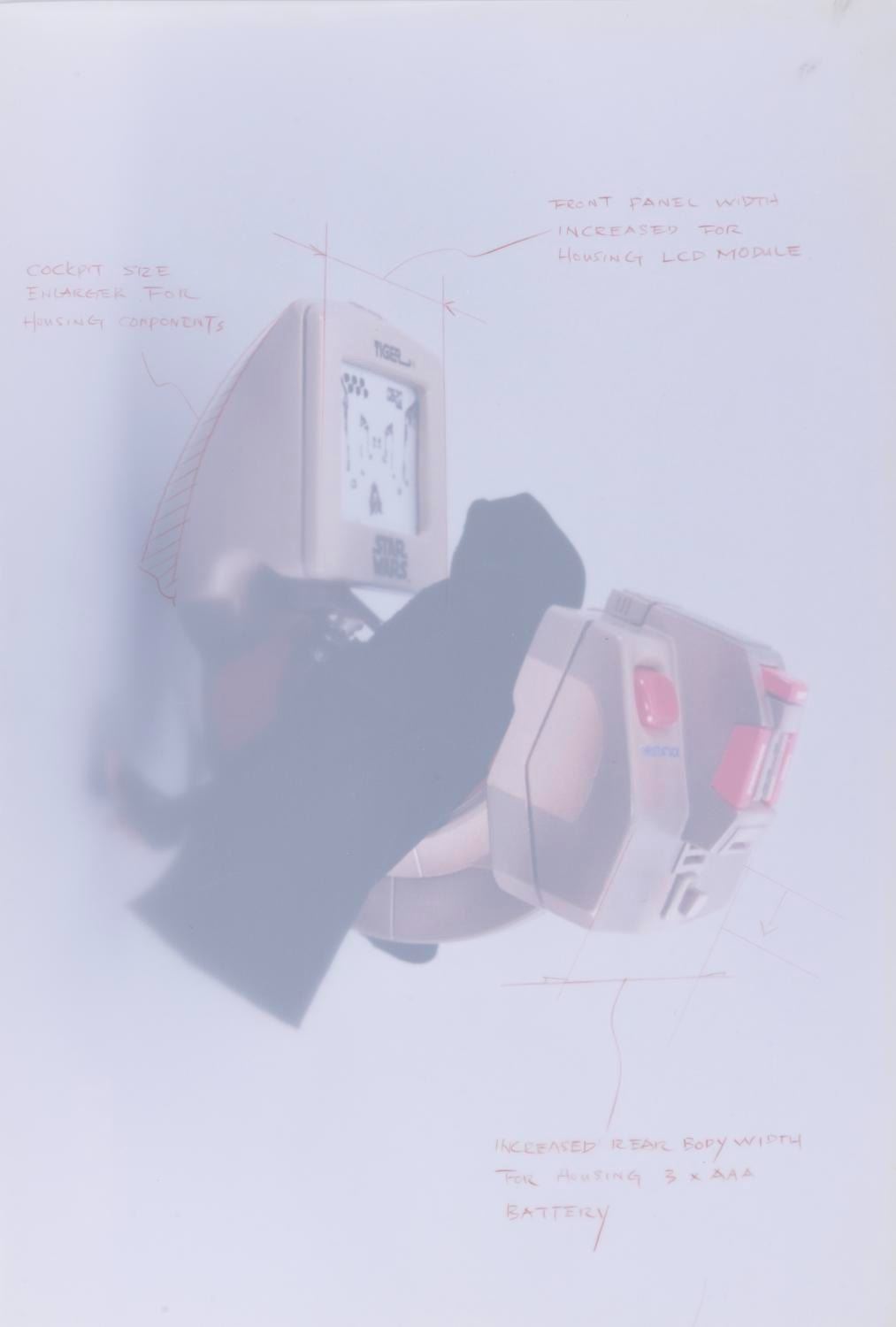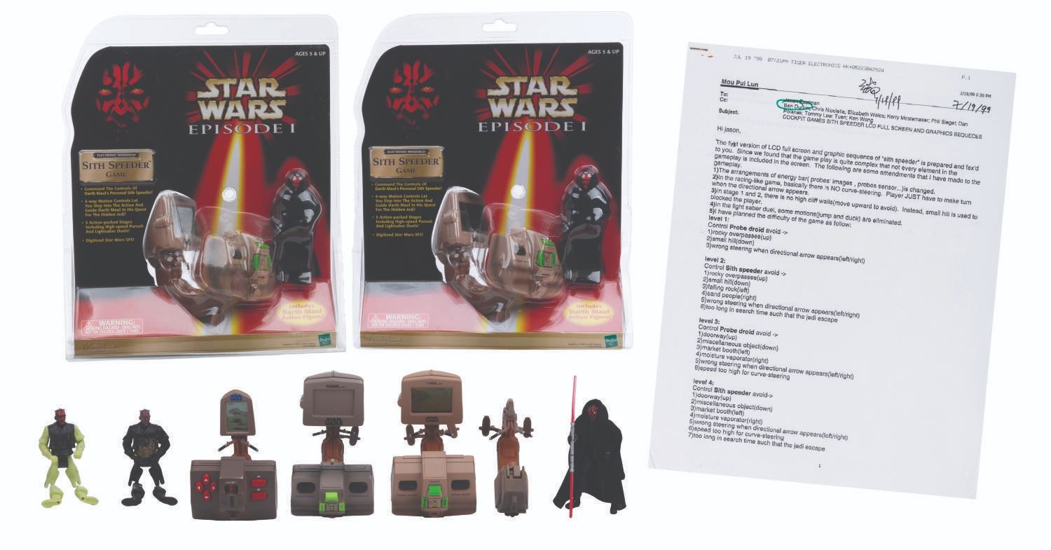 (Hasbro, 1999-2000) A unique collection of early Sith Speeder LCD game prototypes with their development file. The game prototypes consist of an early configuration different from the final release, a second one closely resembling the final product, and two unassembled Darth Maul action figure prototypes. One of the figures is without the face deco, and one is with light green limbs. The file consists of notes, emails, revisions, designs, and photos of the toy during the R&D phase of production. Included in the lot are three final product "Star Wars Episode I" electronic hand-held Sith Speeder Games, one loose and two unopened, and the action figure Speeder that the game's exterior is based on. Measuring up to 3" x 4.25" x 5", the game prototypes, and the 4” unassembled Darth Maul figures, are in good condition with a broken Speeder handle and on/off button. Measuring up to 8" x 12", the R&D folder items are in good to fine condition with light wear to the folder. Measuring 5.25" x 9.75" x 11.75" unopened in their original packaging, the final product games, which each include a 4" Darth Maul action figure as well, are in fine condition.