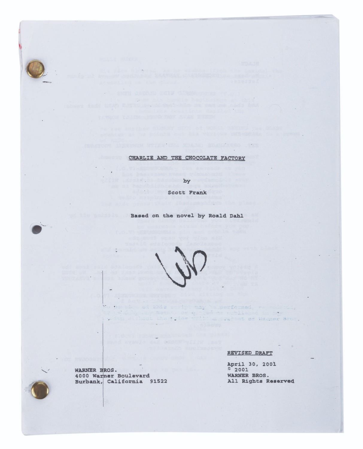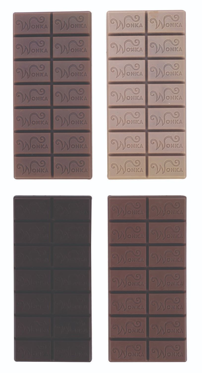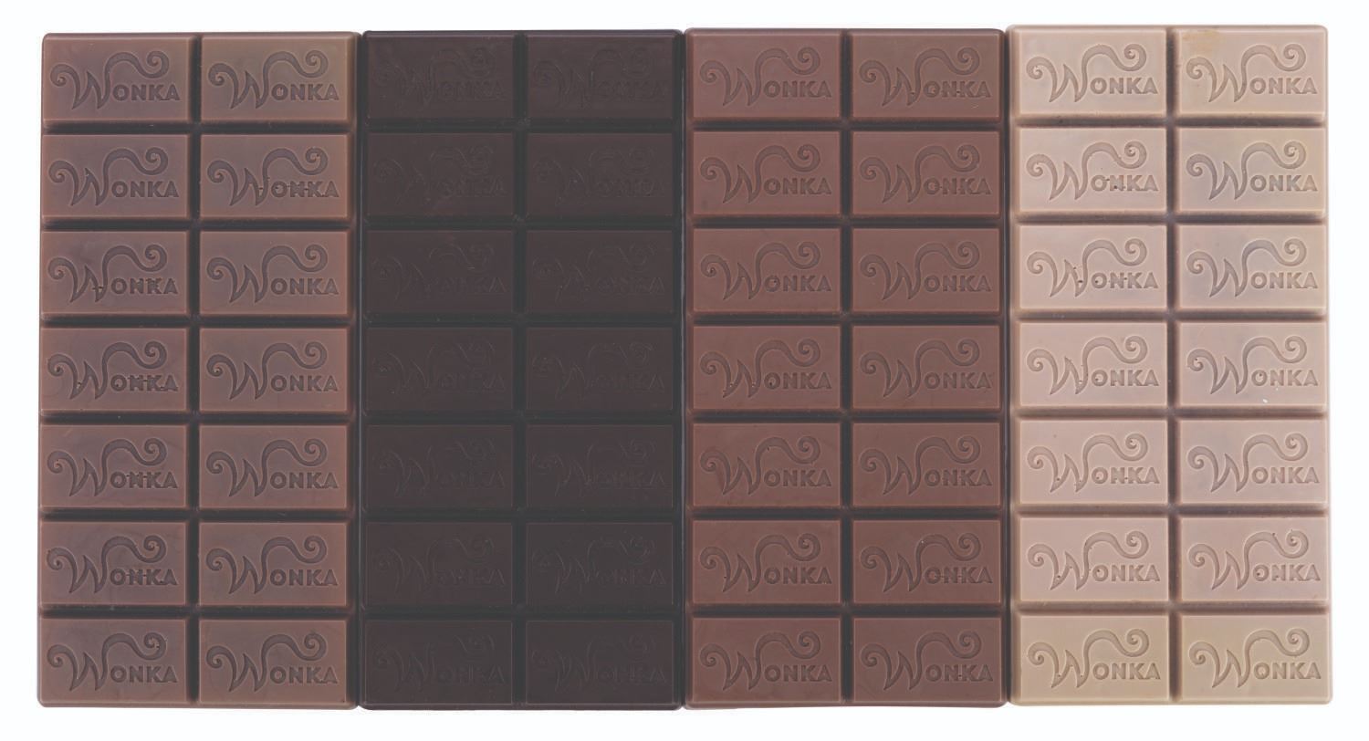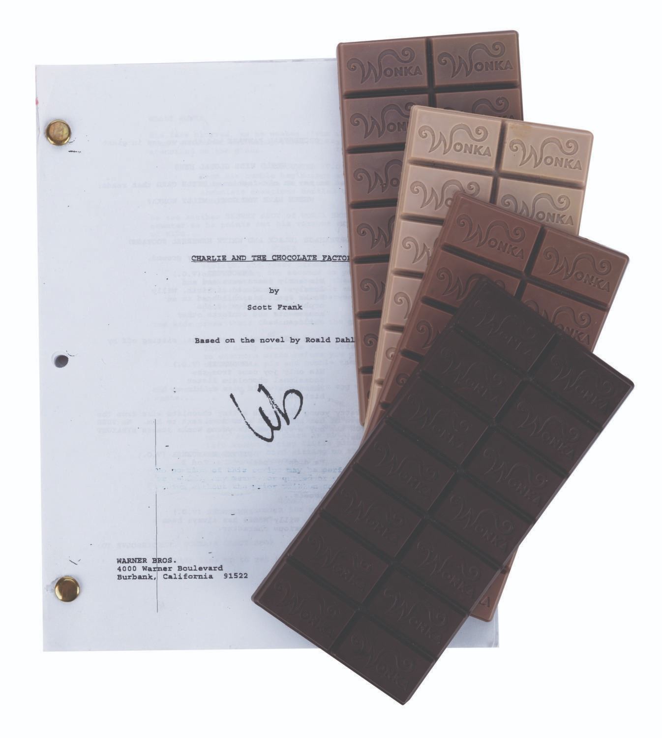 (Warner Bros., 2005) A set of four prototype Wonka Chocolate bars for Charlie and the Chocolate Factory, with an early draft of the script. These plastic Wonka bars are each a different shade of brown, with a different number written on the back of each, as tests for the appearance of prop chocolate bars produced in the hundreds or even thousands for use in the chocolate factory sets from the film. The script is dated April 2001, four years before the film's release. Credited to Scott Frank instead of John August, who has screenplay credit for the movie, it is likely very different from the final film. The bars each measuring 3.25"x7.75"x.33" are in very good condition. The 8.5"x11" script is in good condition with typical wear from handling.