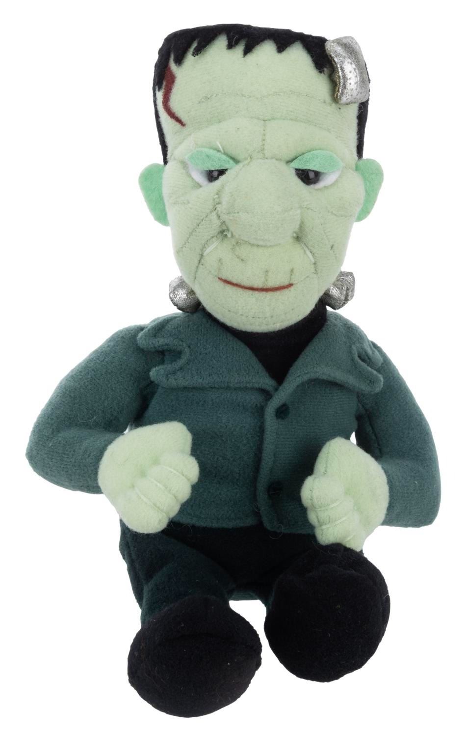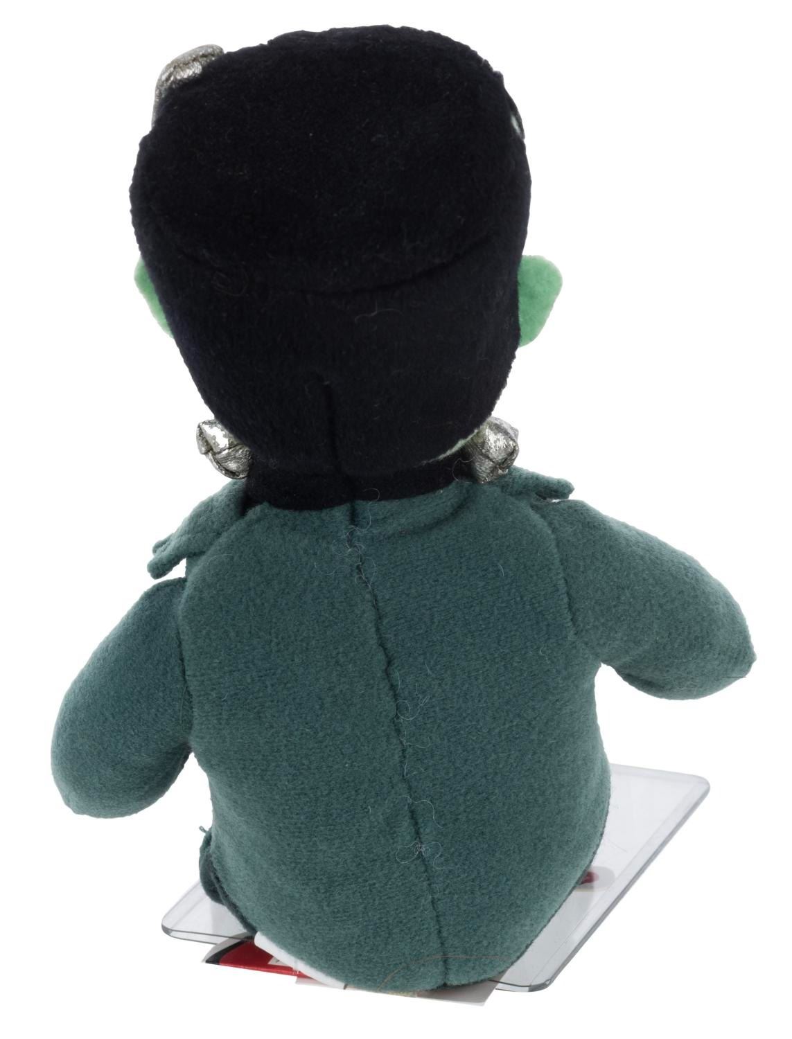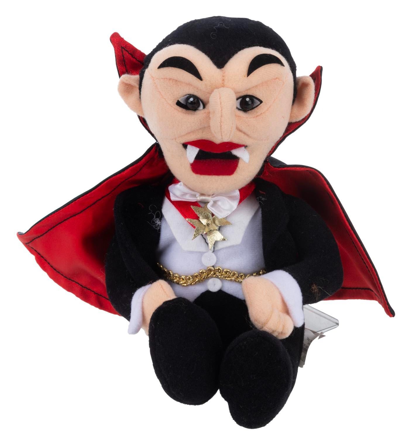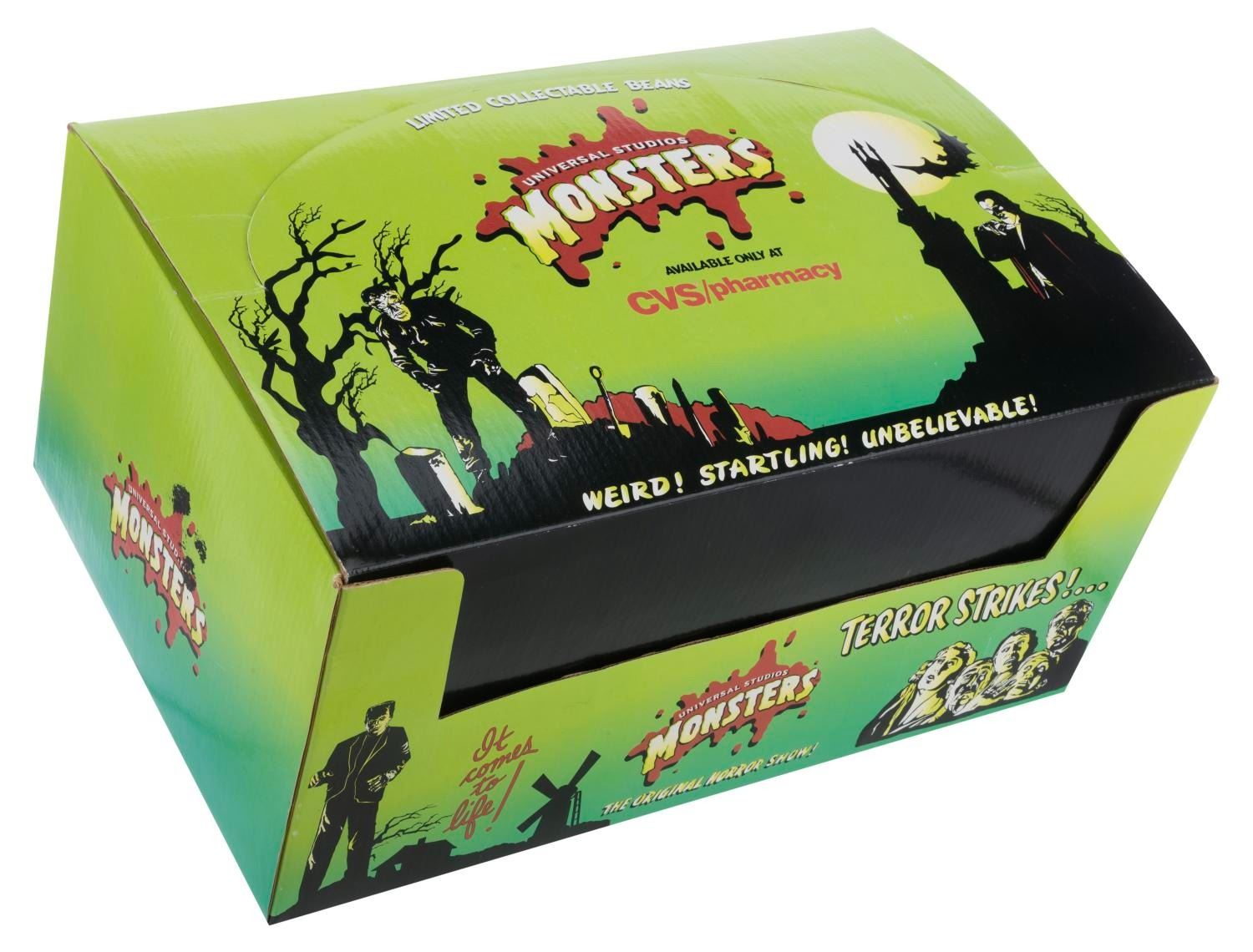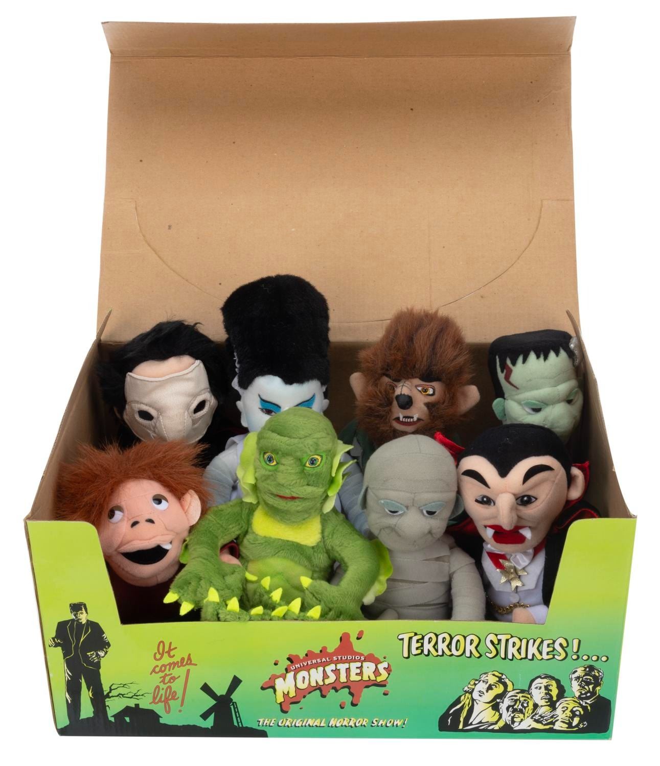 (CVS, 1999) A complete set of eight rare Universal Monsters "beanie" plush characters with the in-store display box. Included are Frankenstein, Wolfman, the Mummy, The Hunchback, the Phantom of the Opera, the Bride of Frankenstein, the Creature From the Black Lagoon, and Dracula. Each measuring approximately 8" tall, the dolls are in fine condition, with the very good condition 6.5" x 8.5" x 14.5" box.