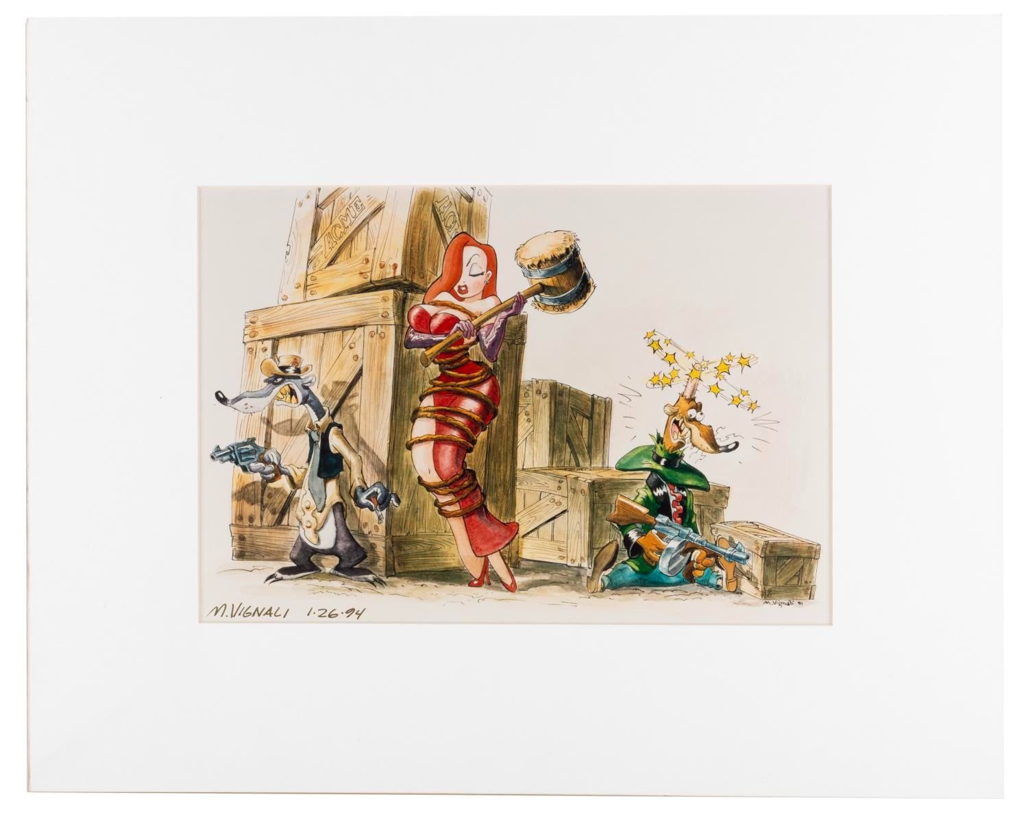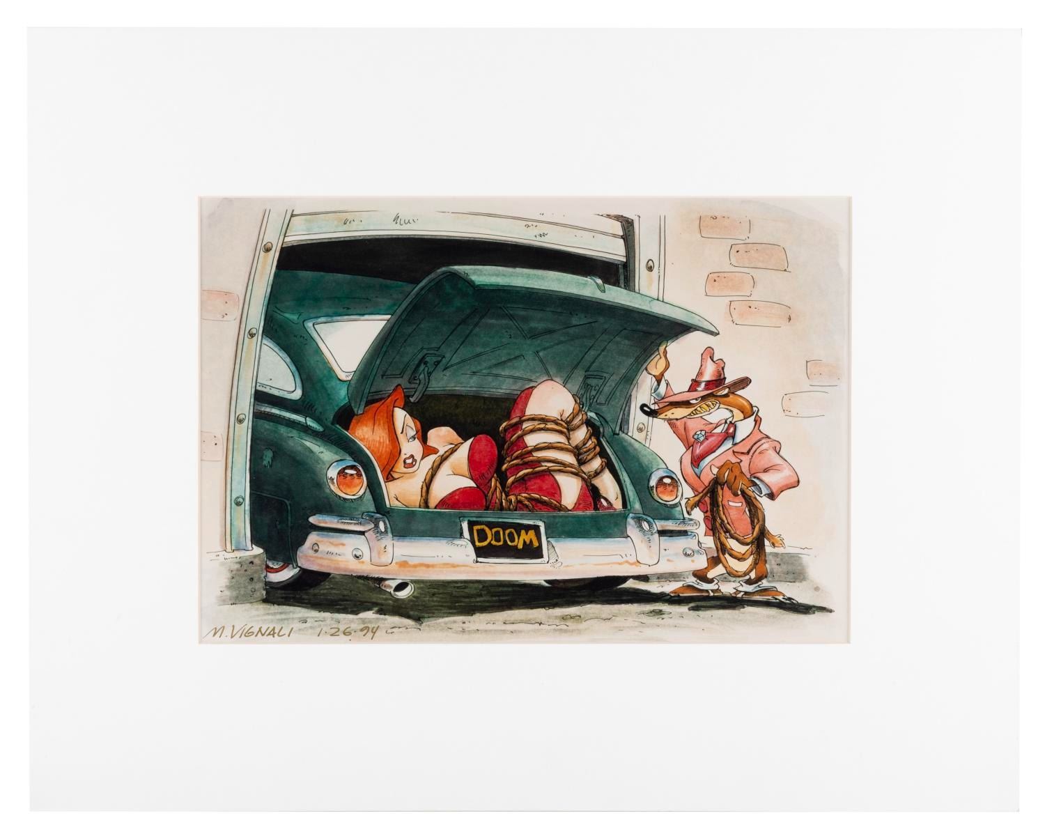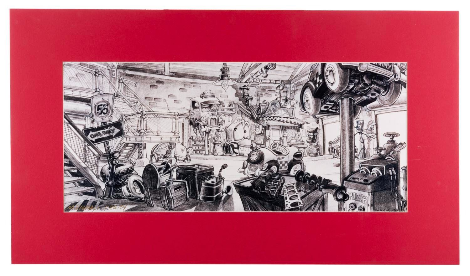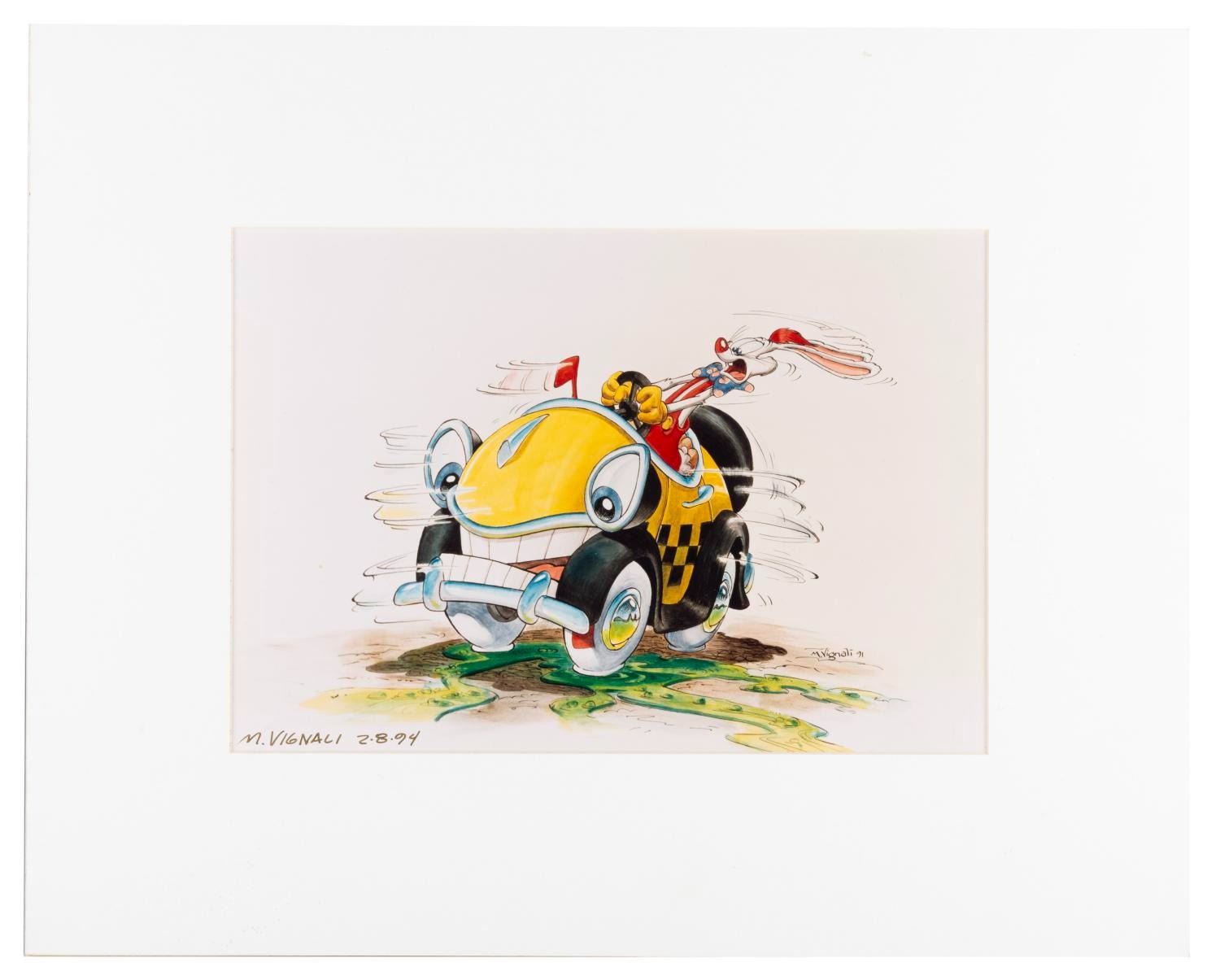 (Disneyland, 1991-94) A set of four concept prints for Roger Rabbit's Car Toon Spin in Mickey's Toontown. The pieces are signed and dated by the artist Marcelo Vignali. With image sizes ranging from 9" x 13" to 8.5" x 19.5" in 16" x 20" to 14.5" x 25.5" mattes, the prints are in good to very good condition with scratches and light wear to the mattes.