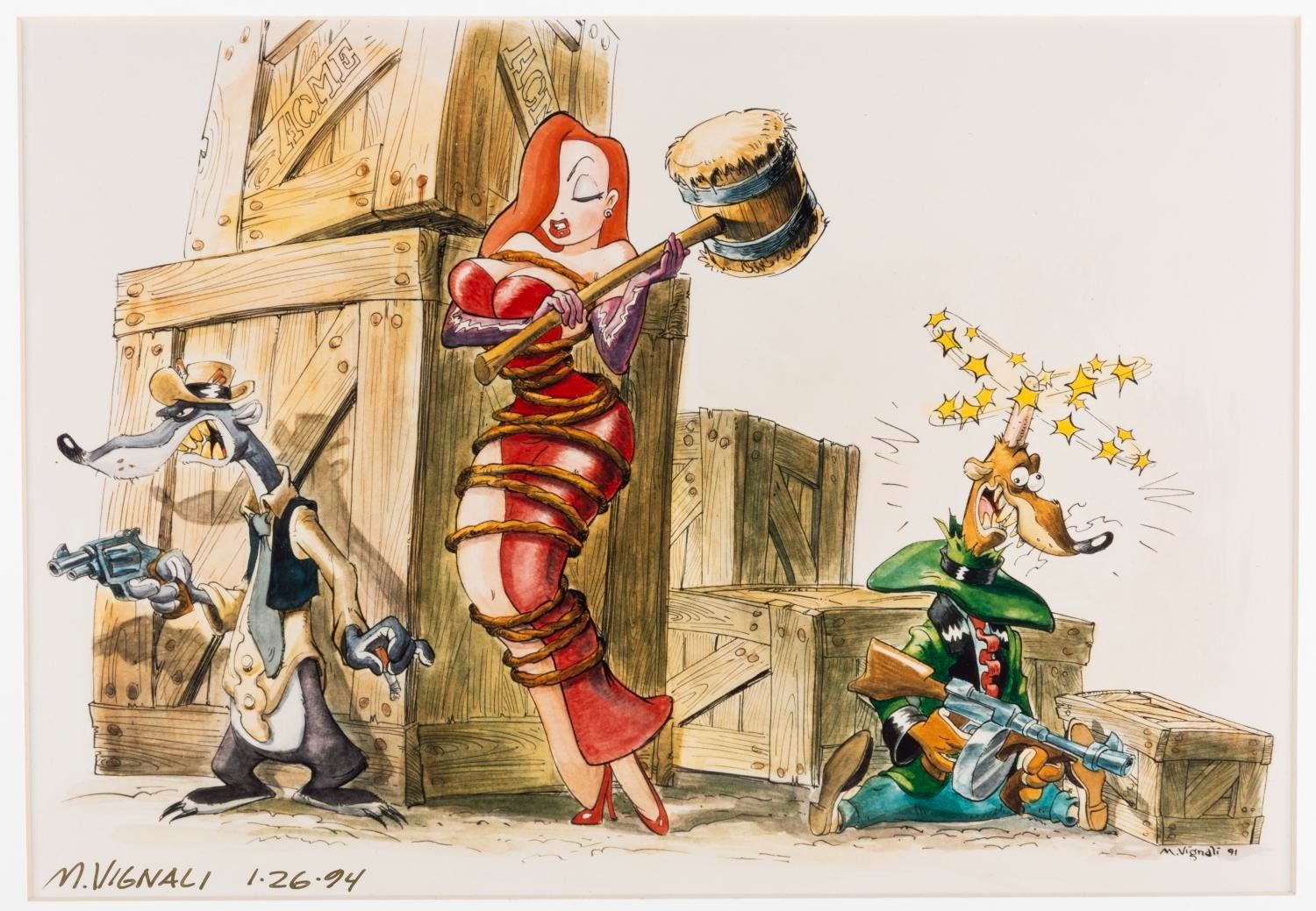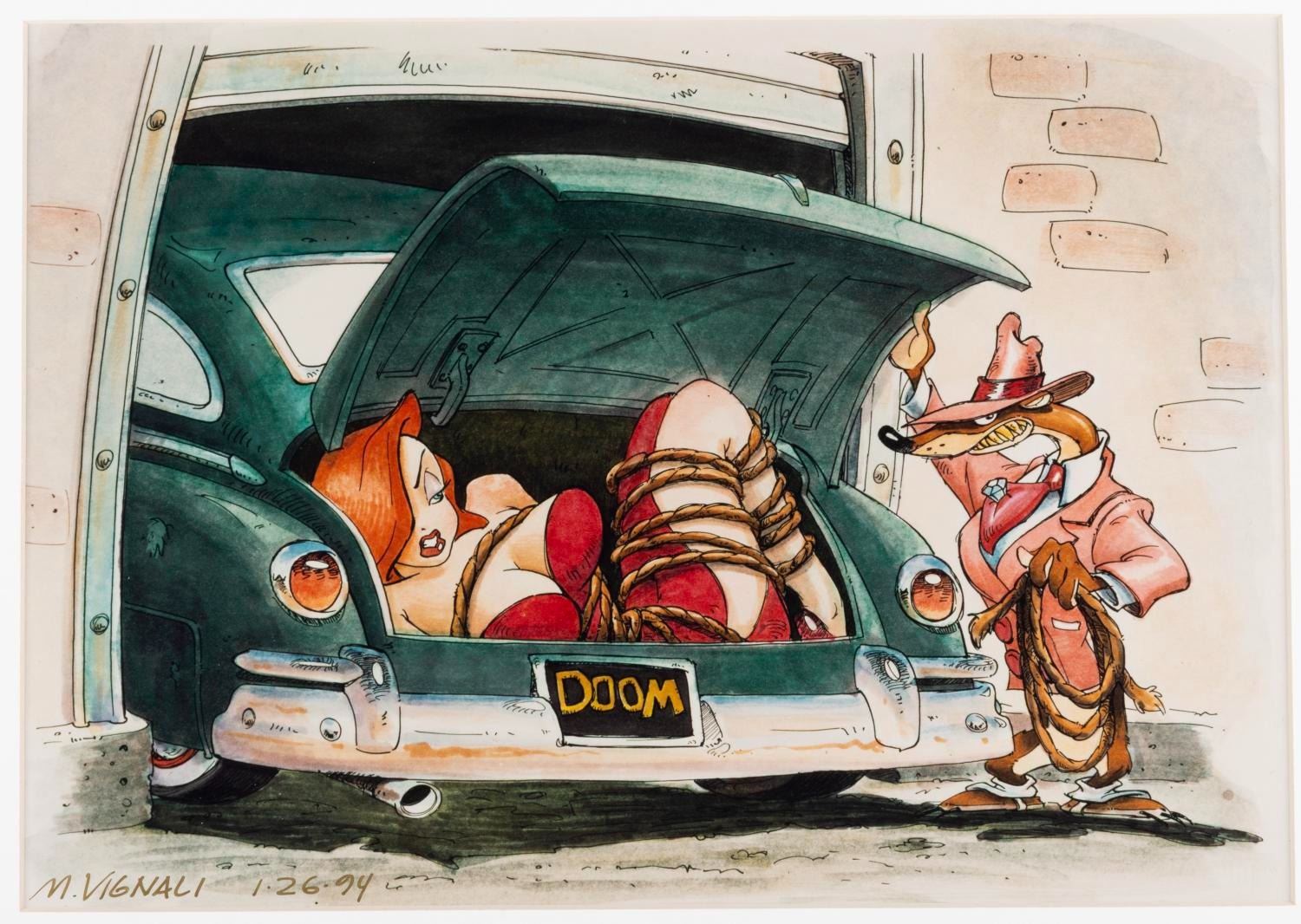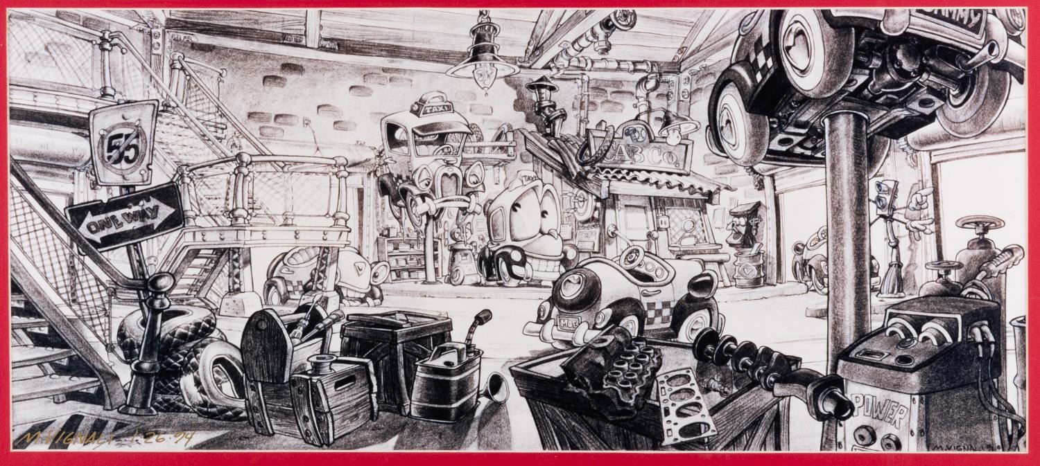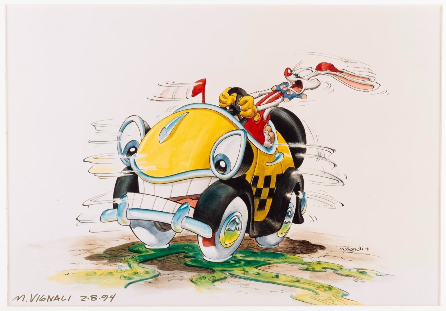 (Disneyland, 1991-94) A set of four concept prints for Roger Rabbit's Car Toon Spin in Mickey's Toontown. The pieces are signed and dated by the artist Marcelo Vignali. With image sizes ranging from 9" x 13" to 8.5" x 19.5" in 16" x 20" to 14.5" x 25.5" mattes, the prints are in good to very good condition with scratches and light wear to the mattes.