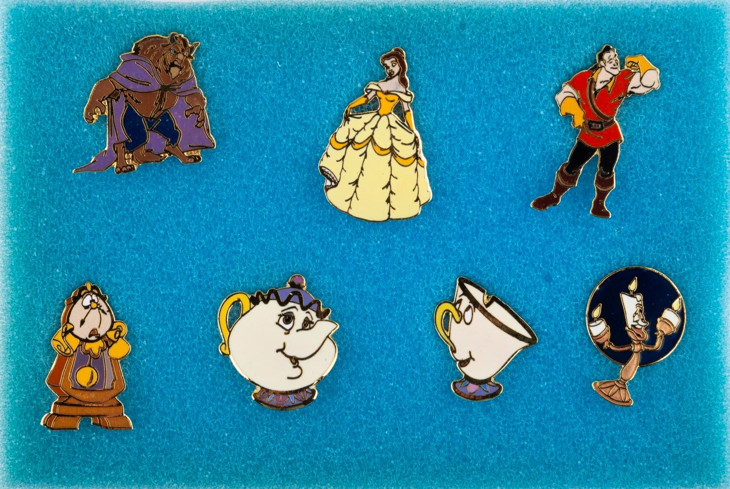 (Disney, 1991) A set of seven “Beauty and The Beast” enamel pins in the original box. This set was given to the animation crew on the film, but may also have been sold in different packaging. The set is in fine condition.