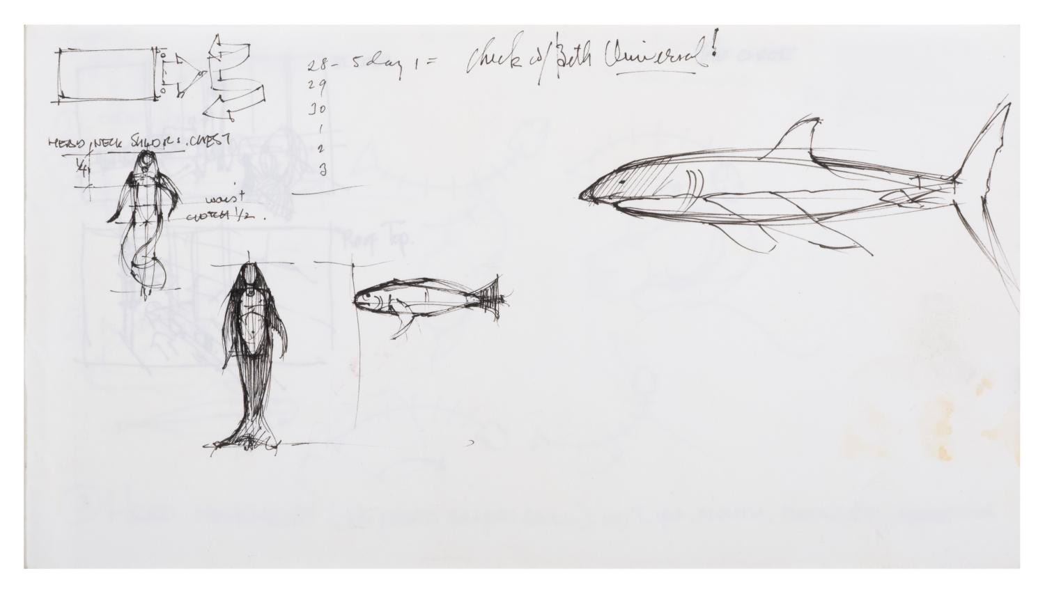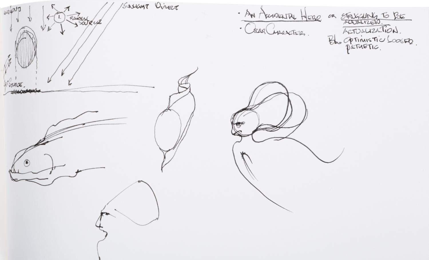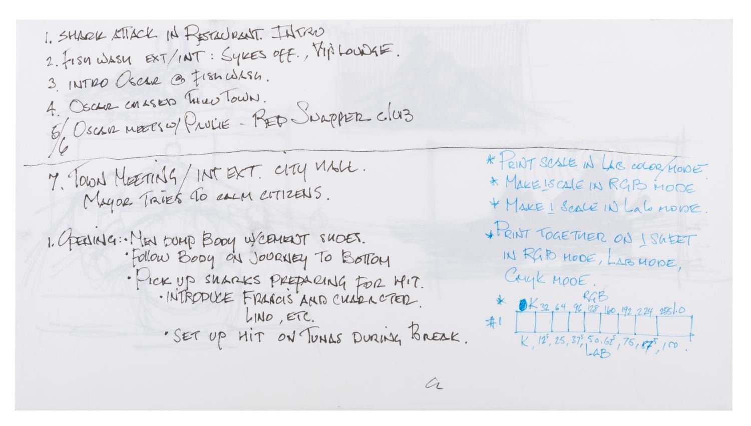 (Dreamworks, 2004) Seven notebook pages of concept drawings for the CGI animated film "Shark Tale." Drawn by artist Jim Hegedus, the sketches include notes on shark anatomy and movement, storyboard thumbnails, and layouts for the Southside Reef underwater city setting of the film. With each page measuring 5.5" x 10", the developmental art is in very good condition with slight wear, including staining from original use.