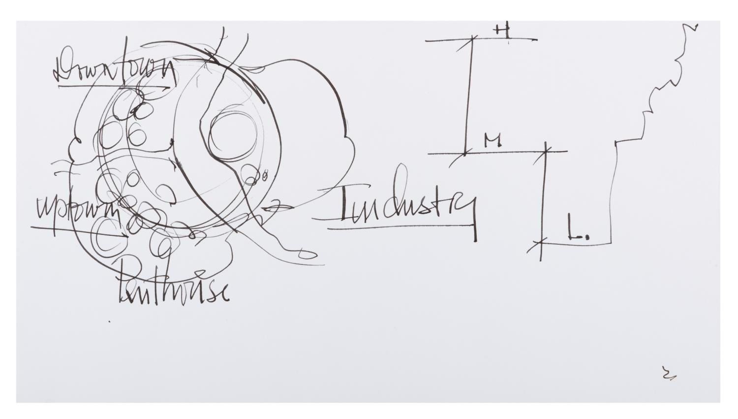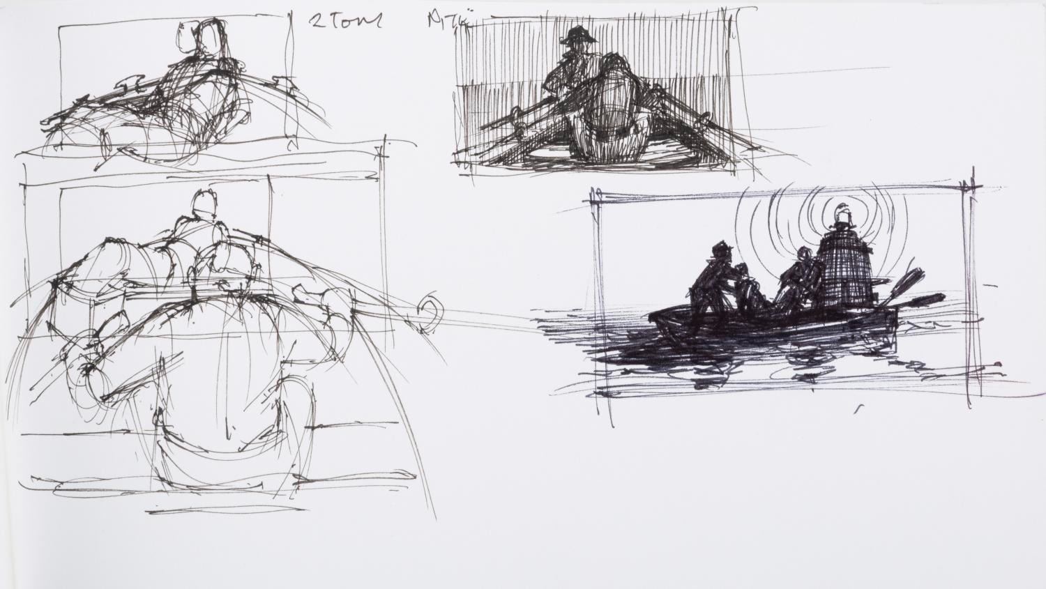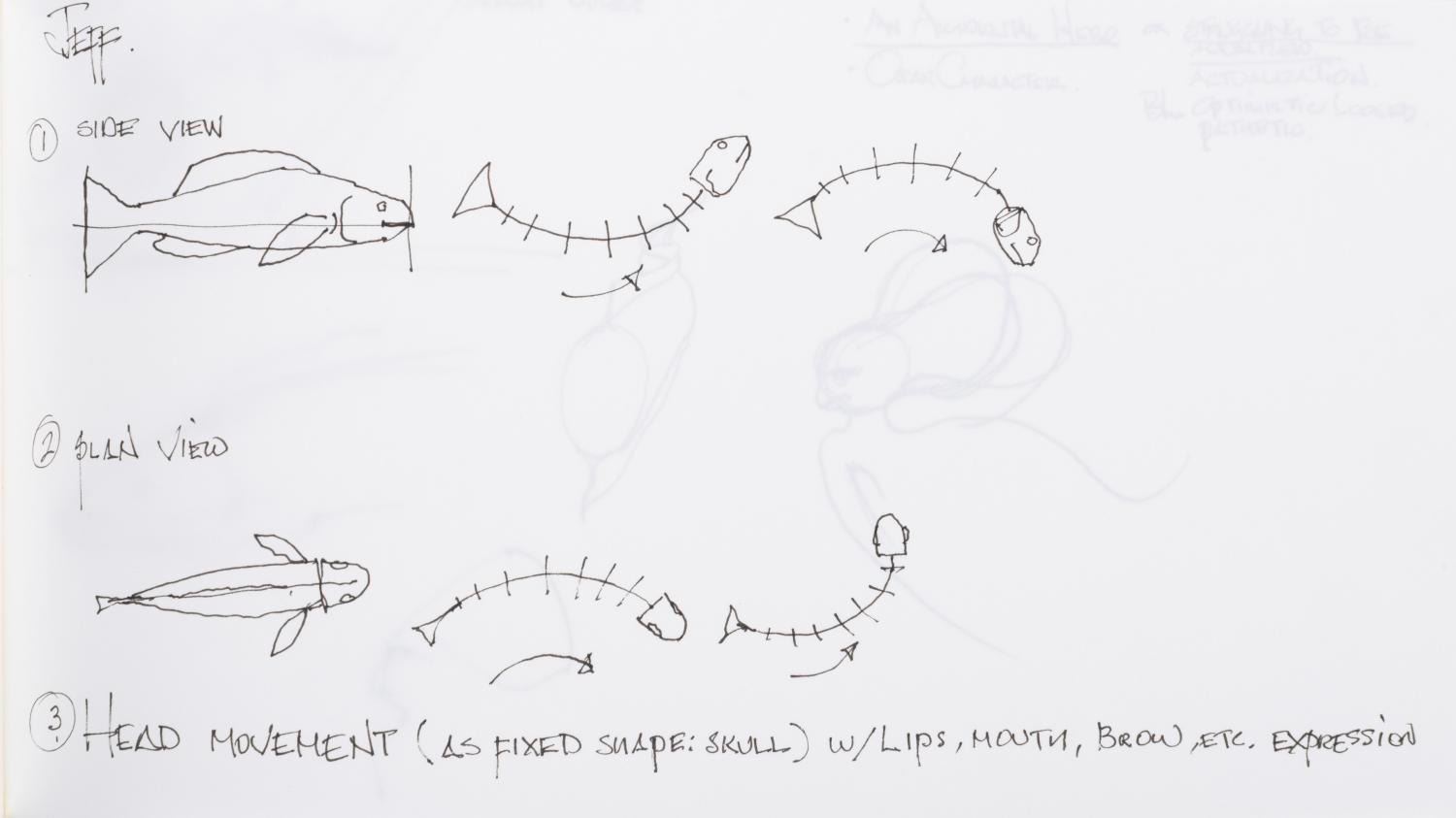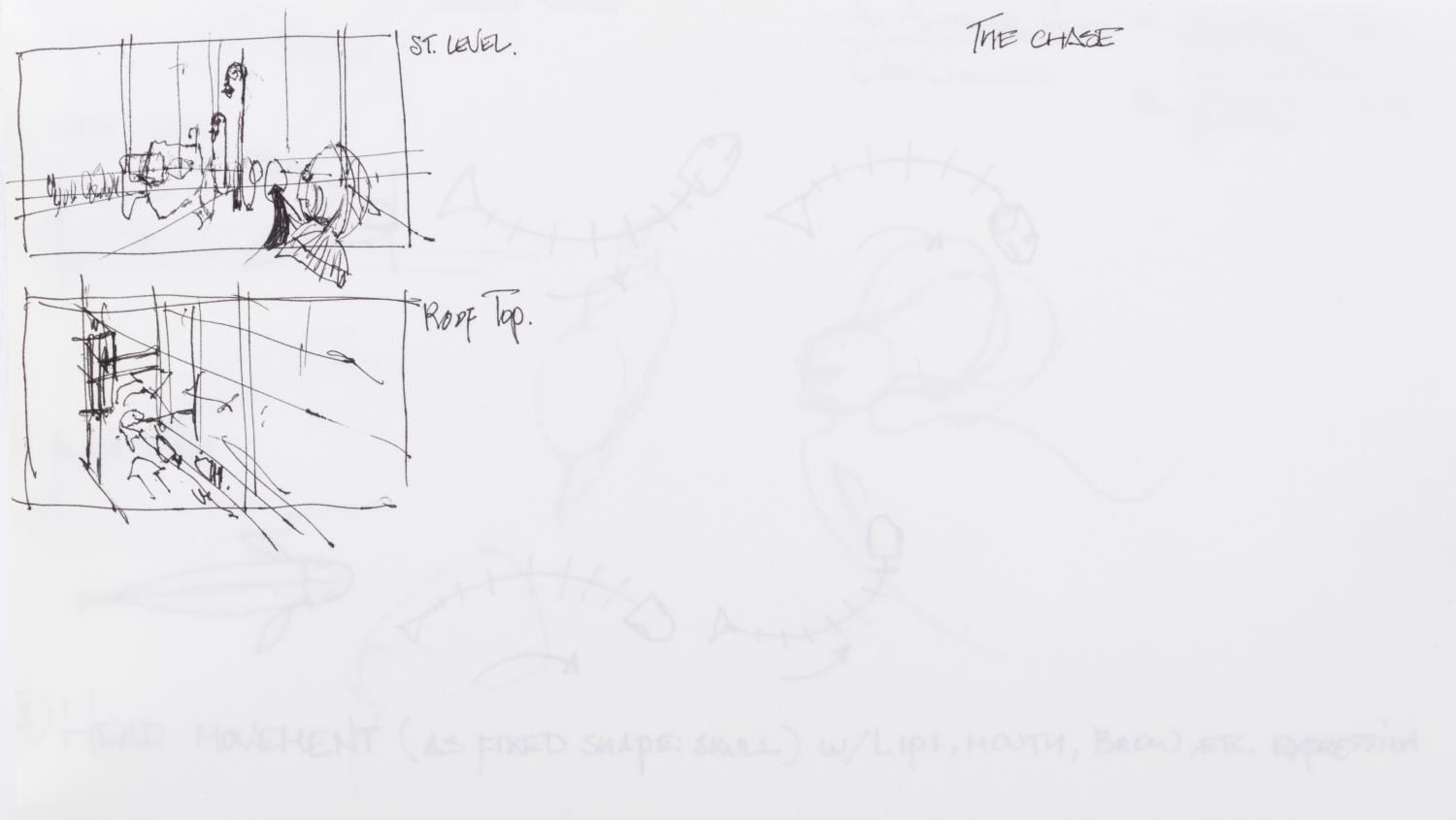 (Dreamworks, 2004) Seven notebook pages of concept drawings for the CGI animated film "Shark Tale." Drawn by artist Jim Hegedus, the sketches include notes on shark anatomy and movement, storyboard thumbnails, and layouts for the Southside Reef underwater city setting of the film. With each page measuring 5.5" x 10", the developmental art is in very good condition with slight wear, including staining from original use.