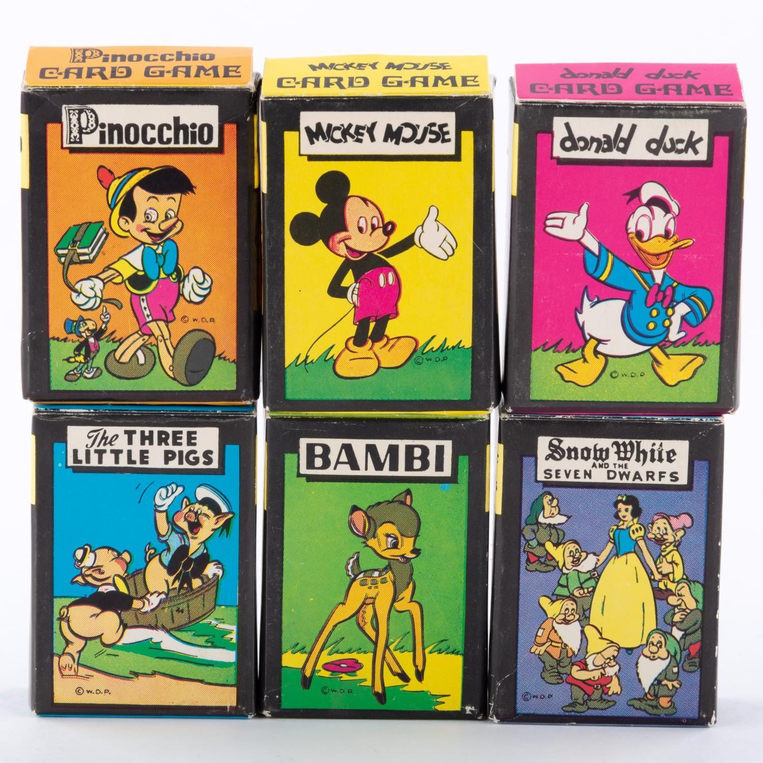 (Russel's, 1946) A set of six card games from the Mickey Mouse Library of Games. Featuring Mickey Mouse, Donald Duck, Bambi, the Three Little Pigs, Pinocchio, and Snow White and the Seven Dwarfs, each complete game deck of 48 cards is housed in its own box. The set is missing the original library cardboard case. The cards measure 2" x 2.5" and are in fine condition in the original 1.75" x 0.75" x 2.5" boxes in very good condition with light wear and creasing.