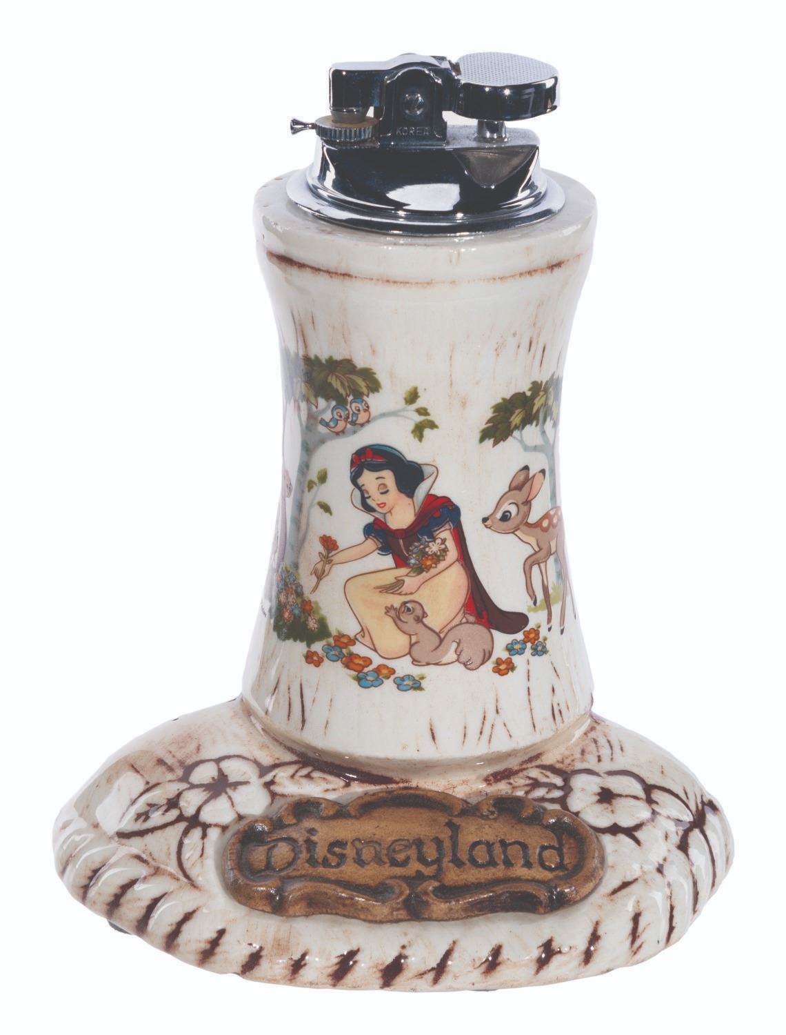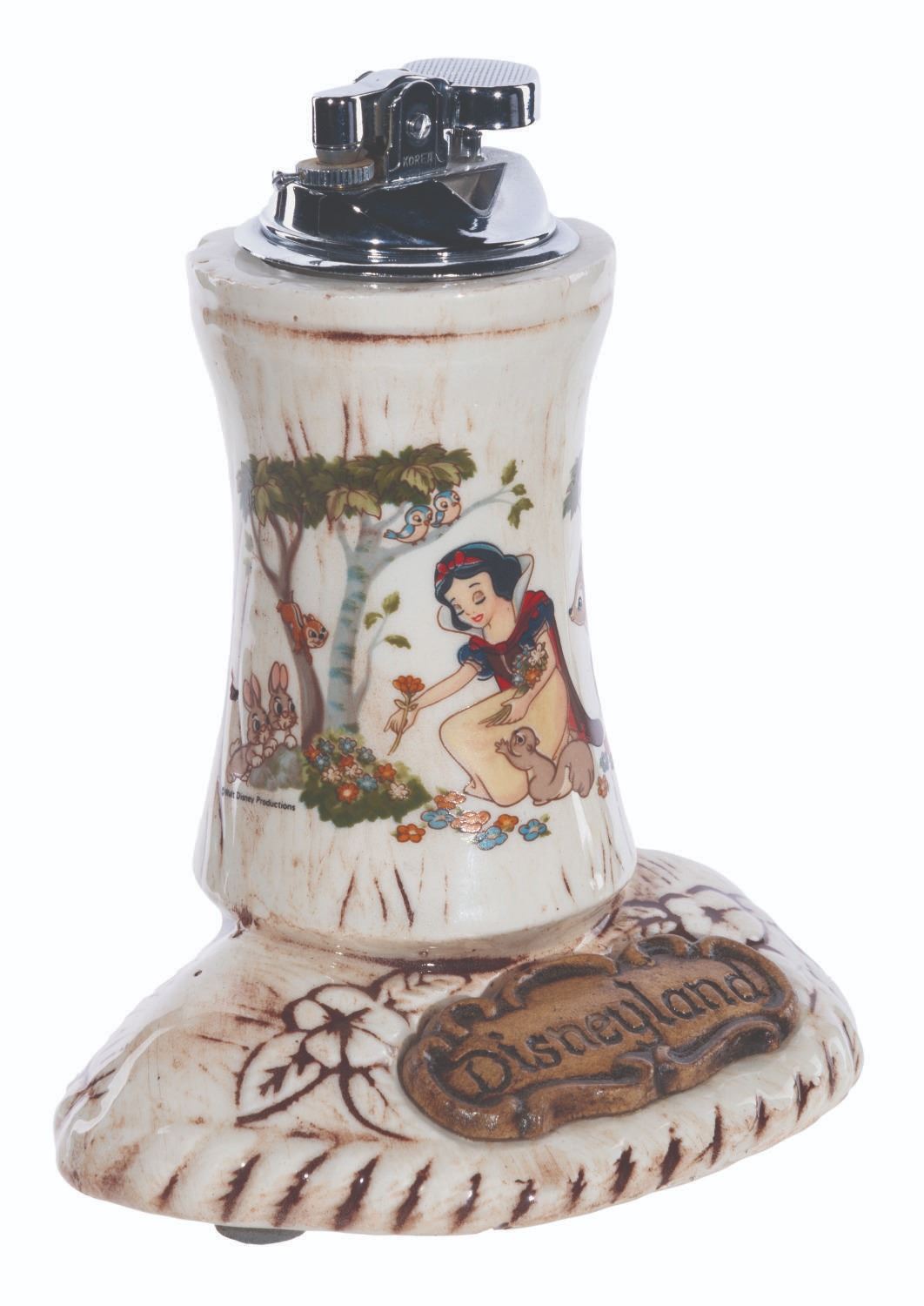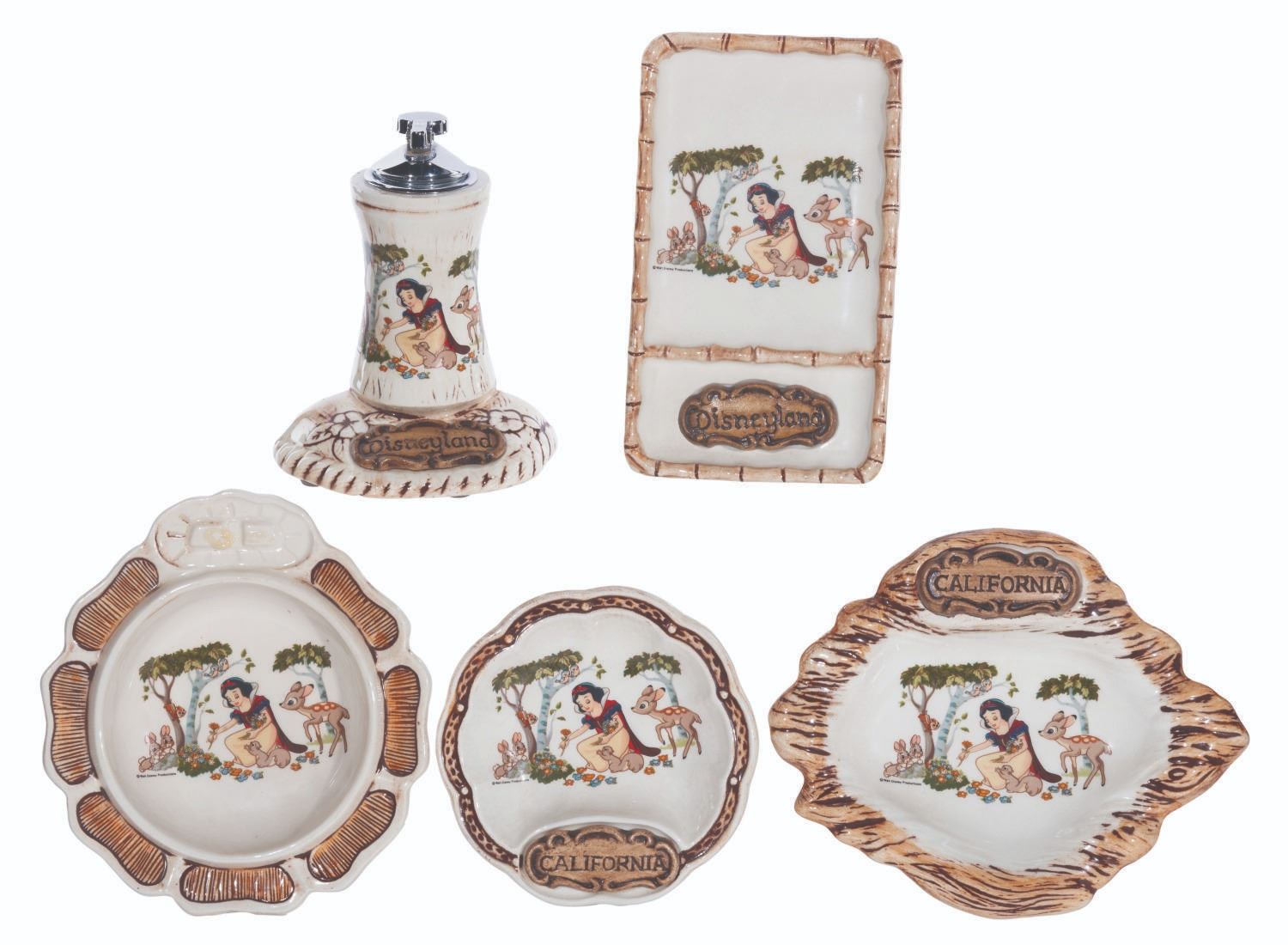 (Treasurecraft, 1980s) A rare set of four China ashtrays and a Kingstar table lighter themed after Snow White and the Seven Dwarfs. The lighter is in fine working condition. Measuring 4.25"x7.25", 7.5"x6", and 5" and 6.75" in diameter, each China piece is in either good or fine condition, some pieces retaining their original Disneyland price label, and one piece missing its "California" plaque.