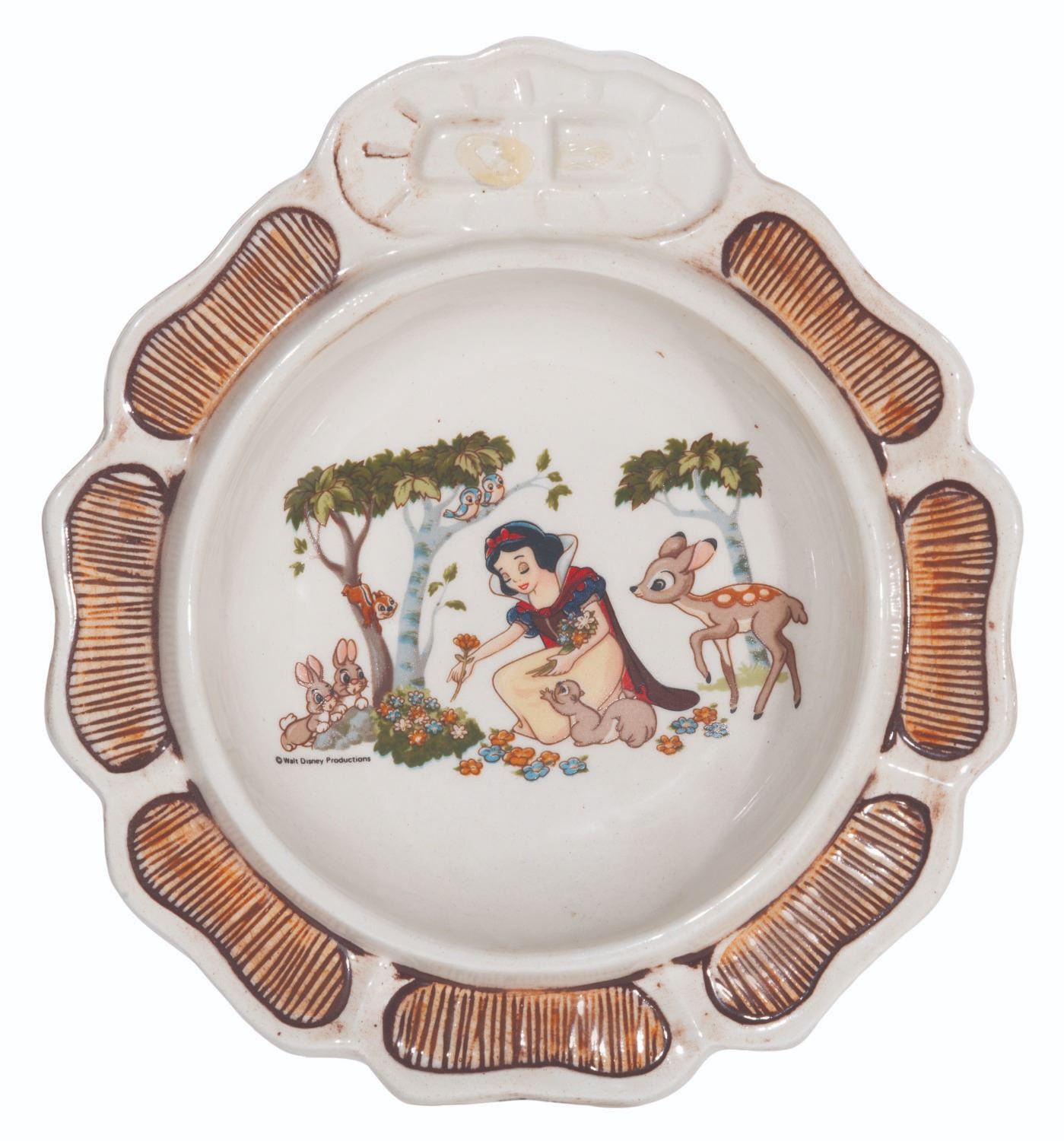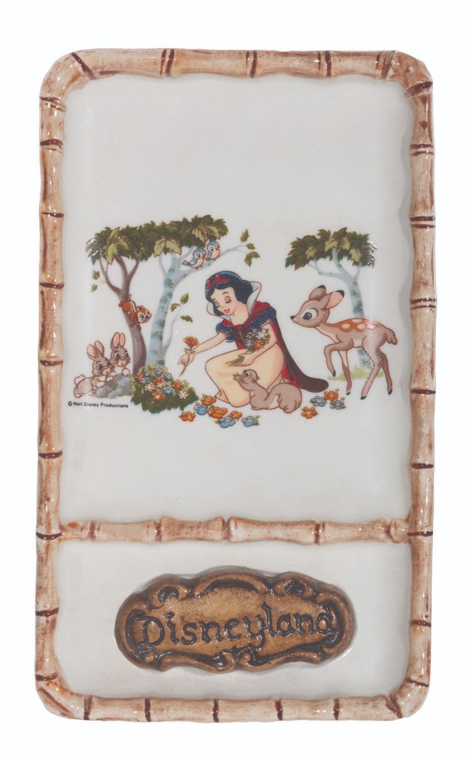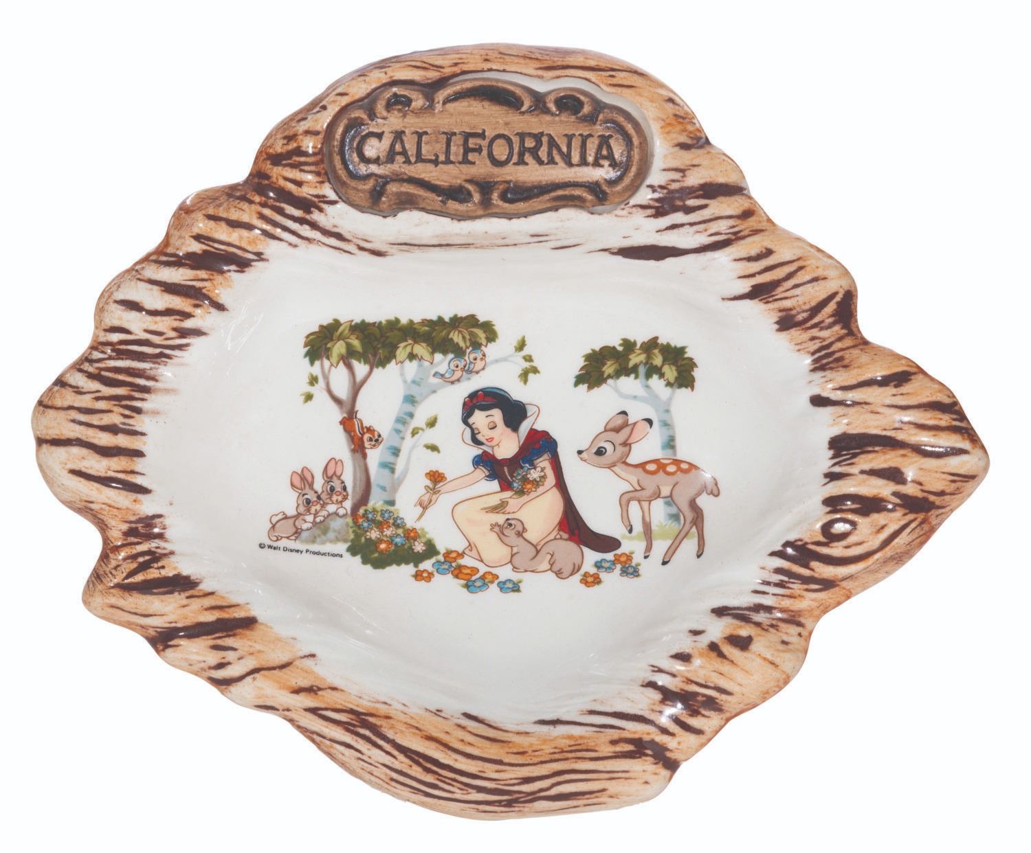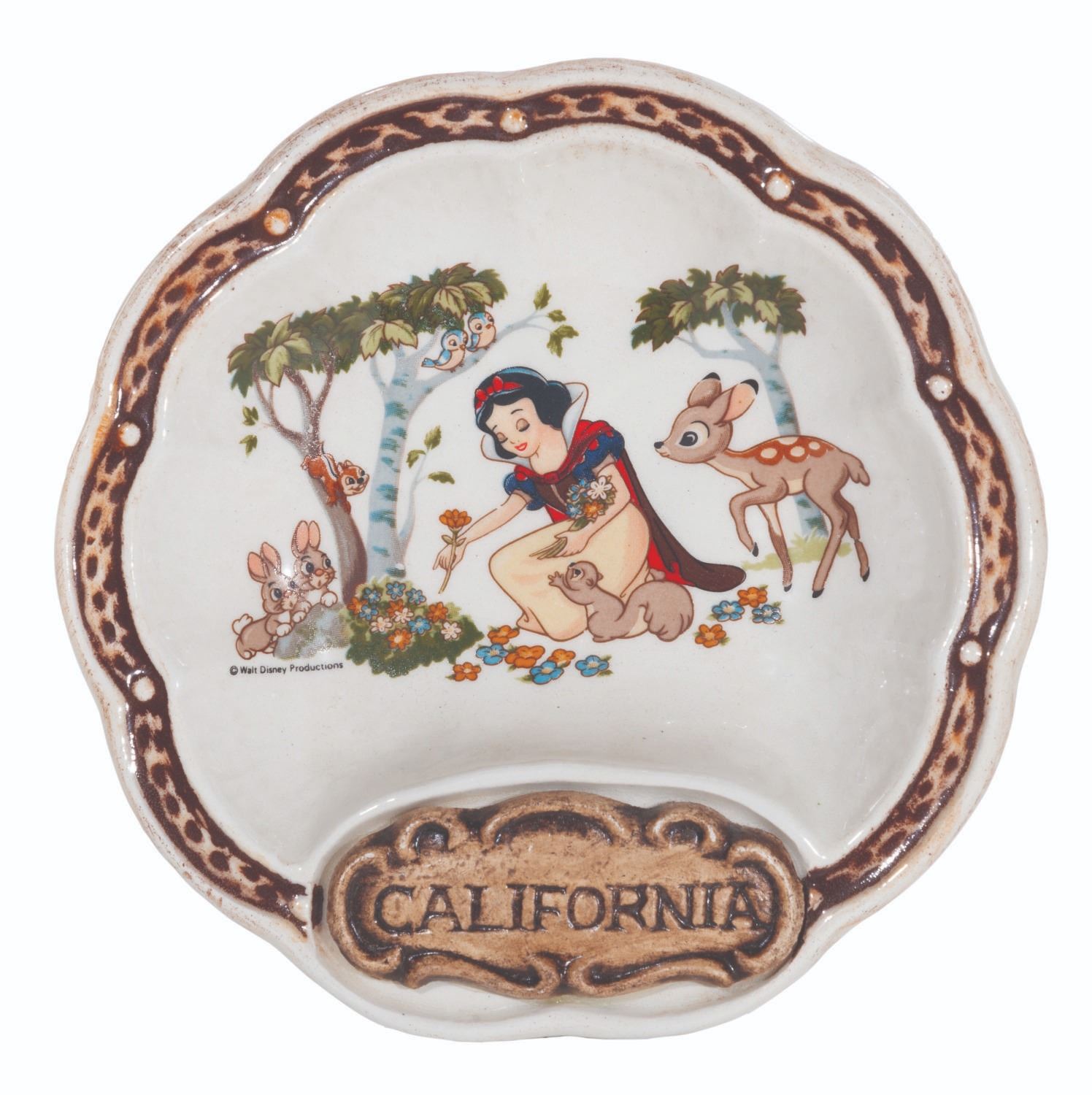 (Treasurecraft, 1980s) A rare set of four China ashtrays and a Kingstar table lighter themed after Snow White and the Seven Dwarfs. The lighter is in fine working condition. Measuring 4.25"x7.25", 7.5"x6", and 5" and 6.75" in diameter, each China piece is in either good or fine condition, some pieces retaining their original Disneyland price label, and one piece missing its "California" plaque.