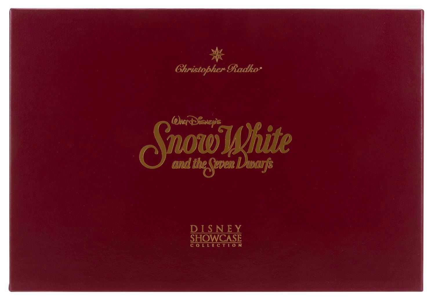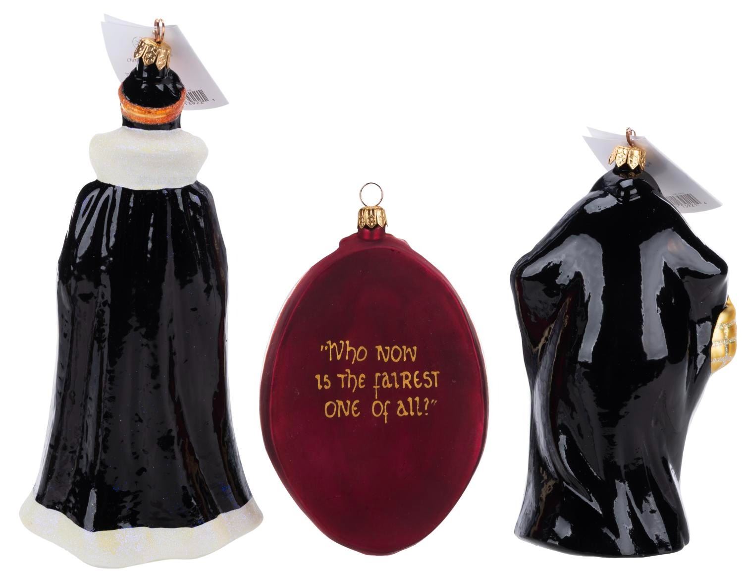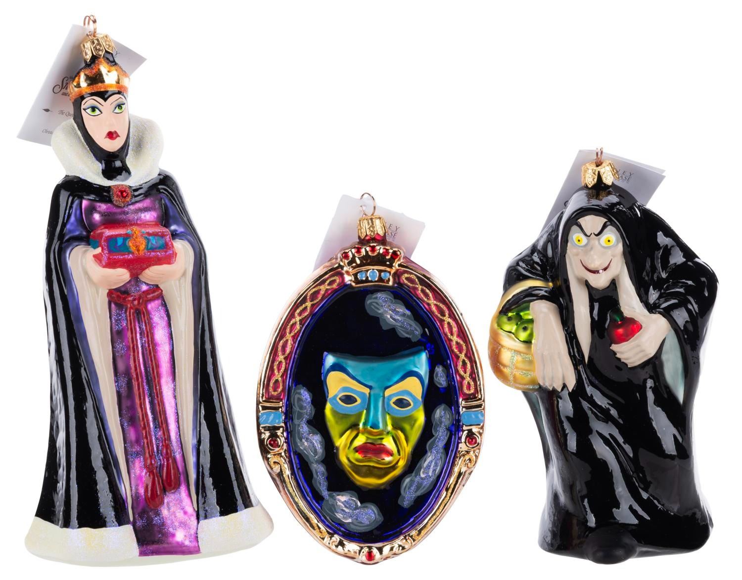 (Radko, 1999) A set of three blown glass "Snow White and the Seven Dwarfs" Christmas ornaments by Christopher Radko. Included are the Evil Queen, the Magic Mirror, and the Evil Queen in disguise as the Old Hag. The set was released by the Disney Showcase Collection and is numbered 353 in a limited edition of 5000. Measuring 3.75" x 6" to 4.25" x 8.75", the set is in fine condition in the original box.