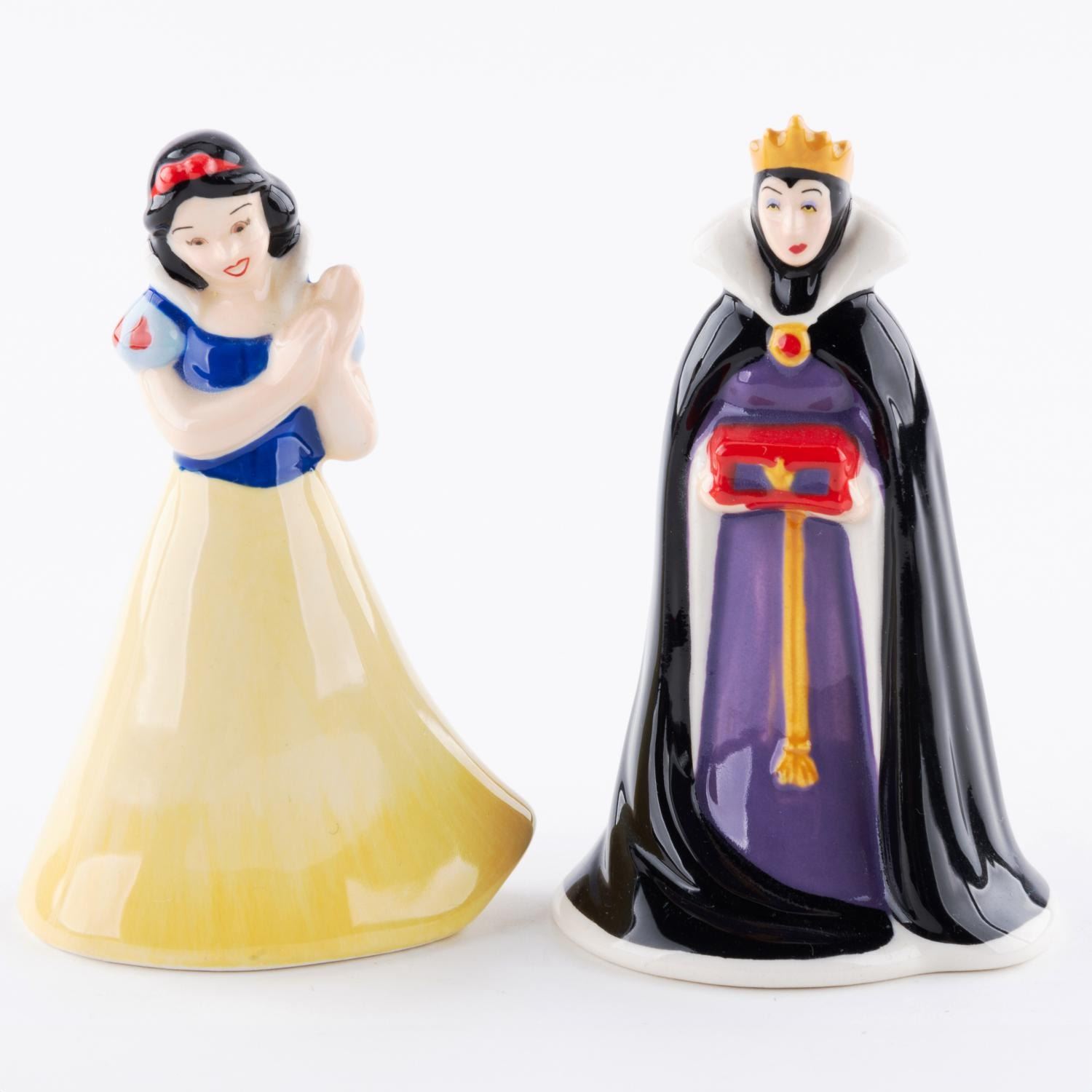 (Disney, 1980s-2000s) Ceramic salt and pepper shakers of Snow White and the Evil Queen from "Snow White and the Seven Dwarfs.” Each measuring 2.25” x 2” and 3.5” tall, the shakers are in very good condition, with one of the rubber stoppers missing.