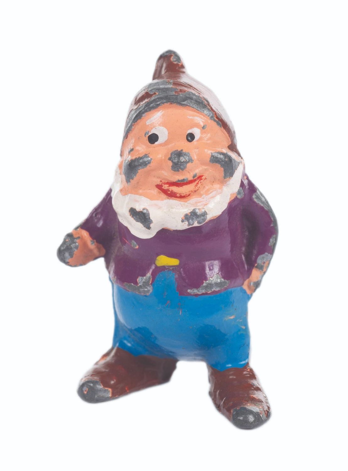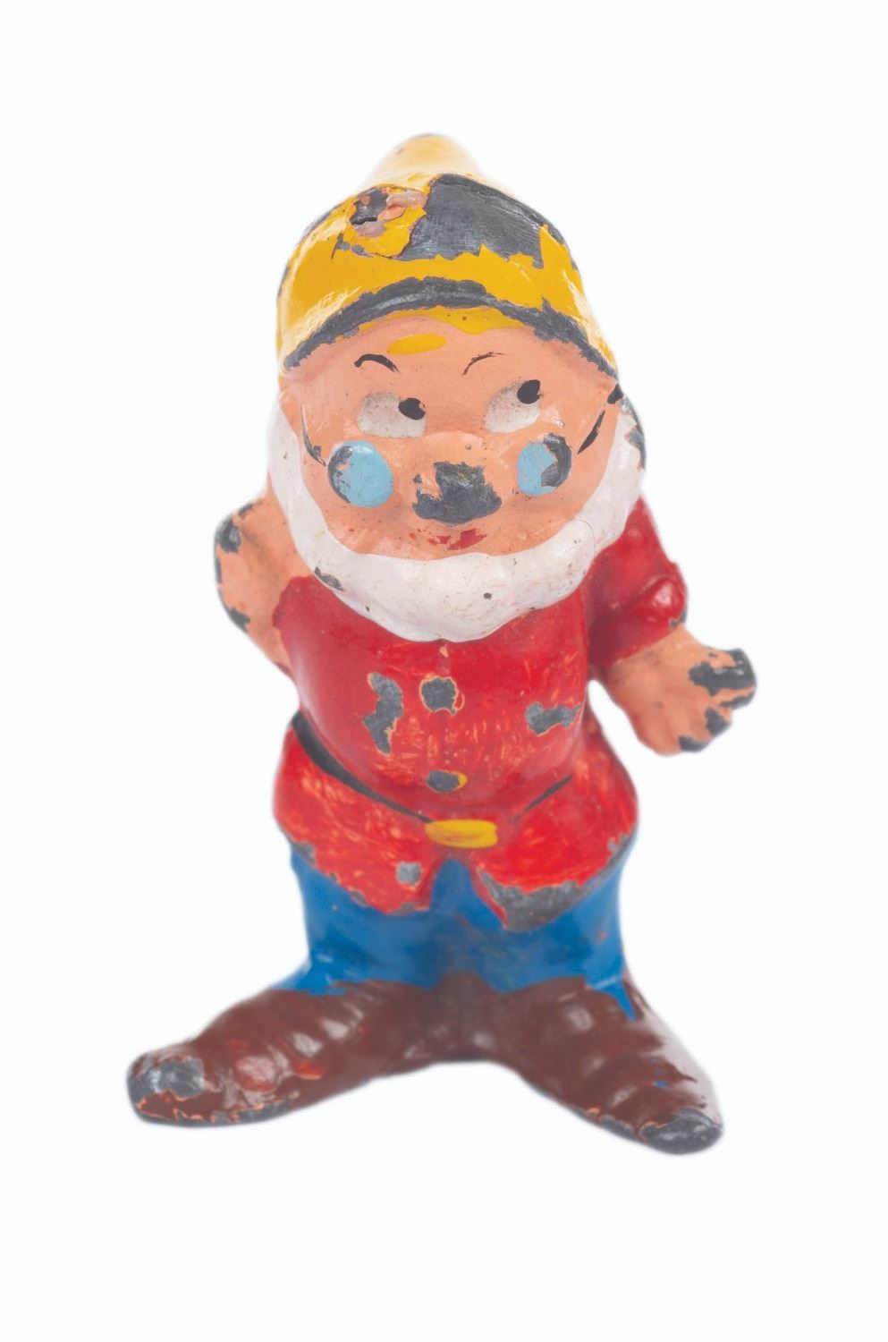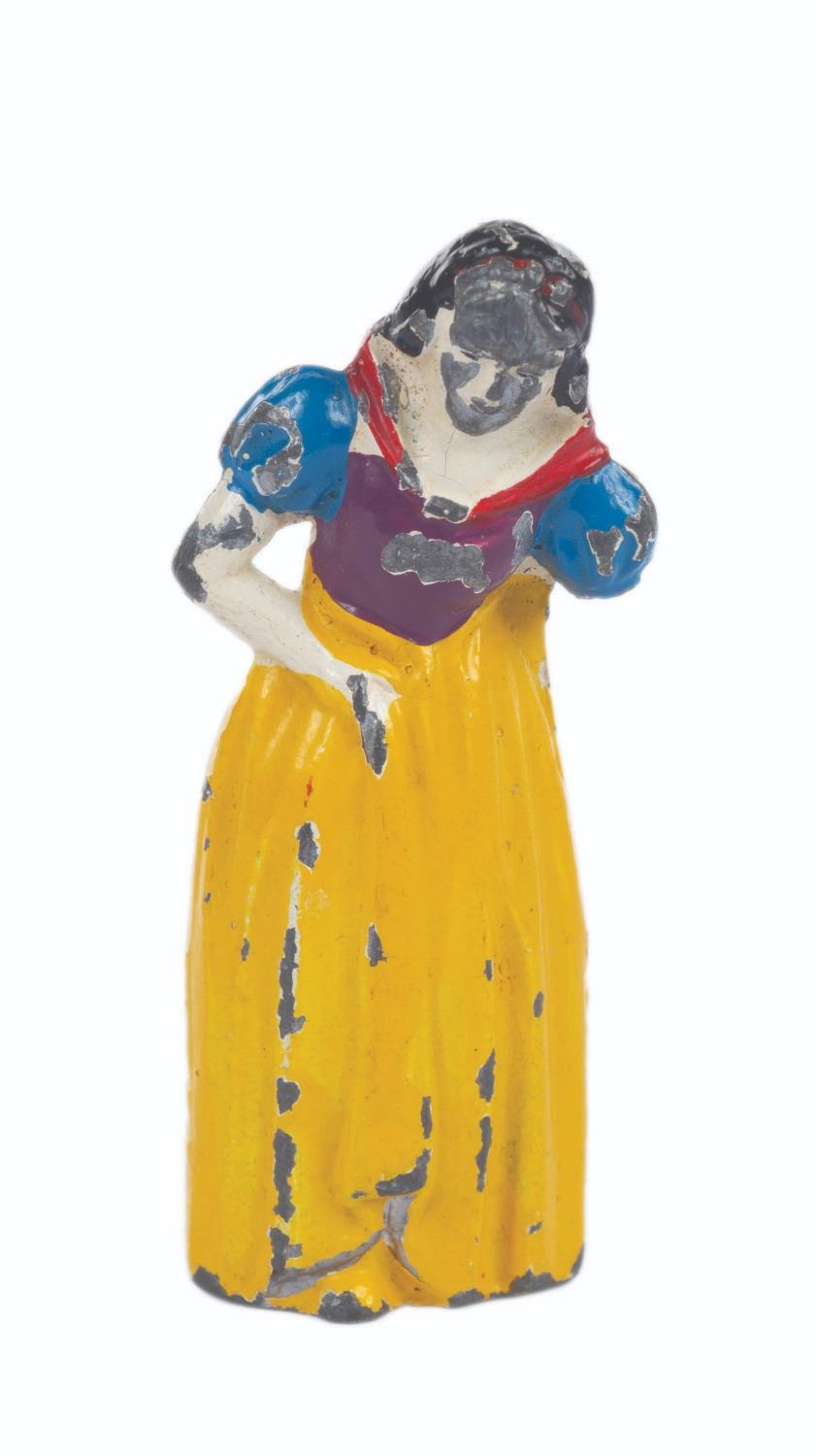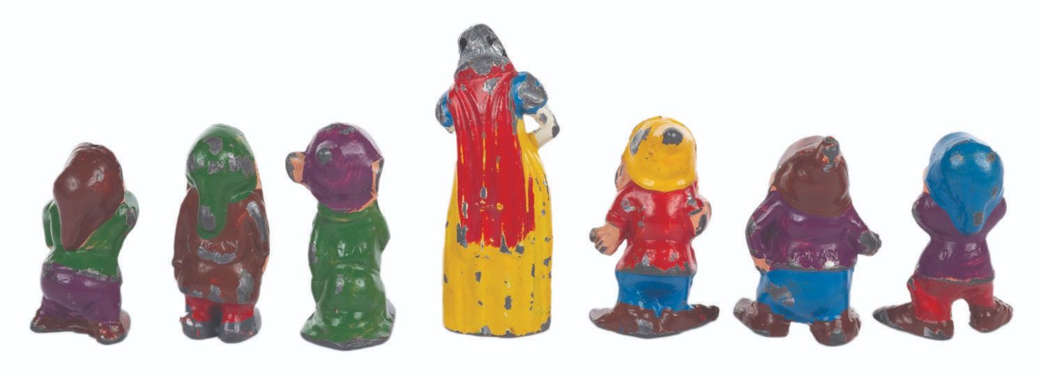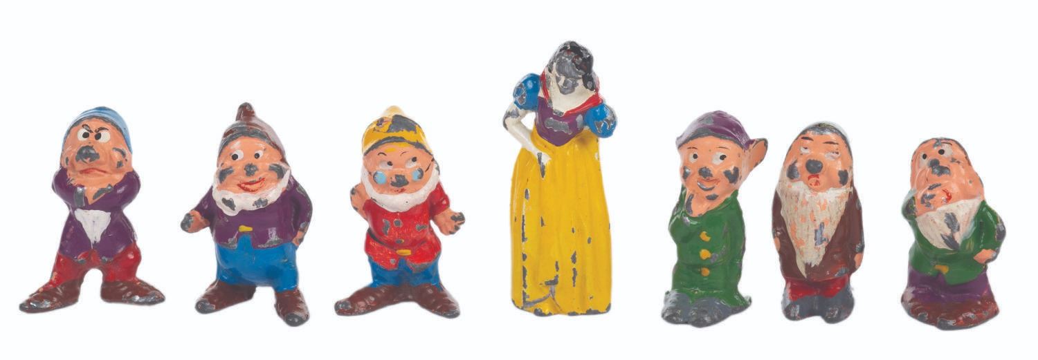 (Disney, 1930s) A collection of seven metal Snow White and the Seven Dwarfs figures, missing Bashful. The figures measure from 1.5" to 2.25" tall. and are in fair condition, with each exhibiting wear and chipping to the paint, and Snow White missing an arm.
