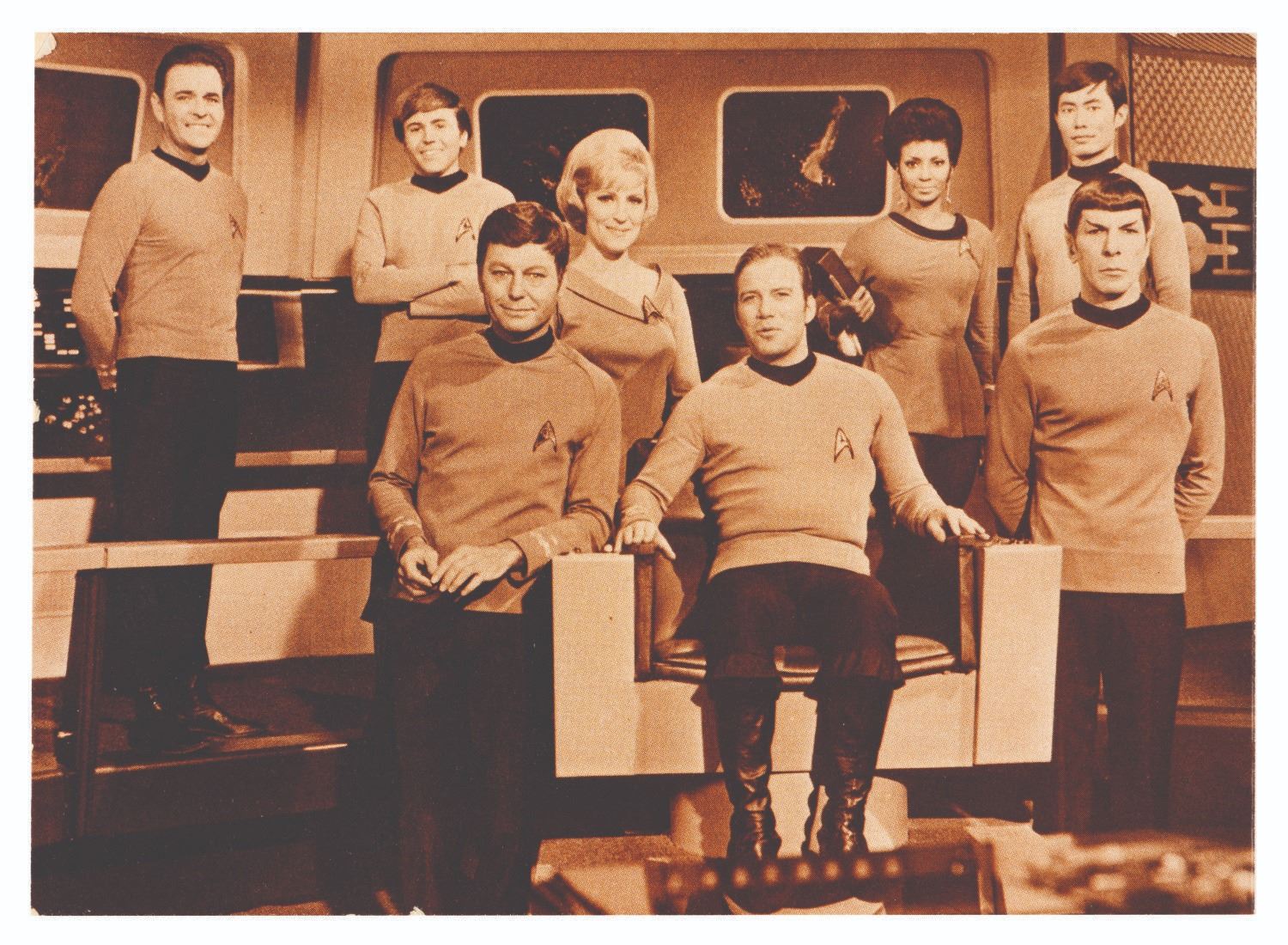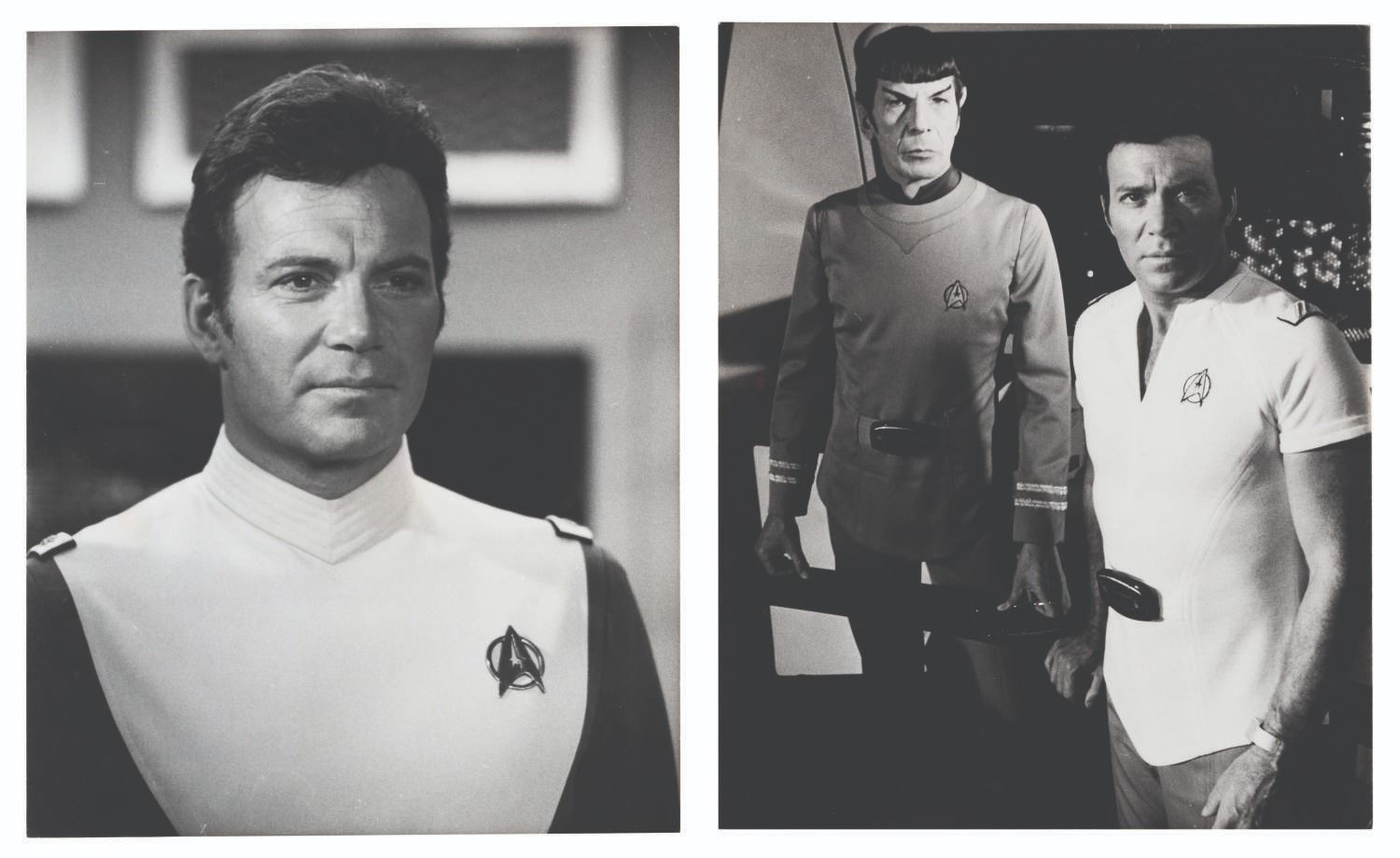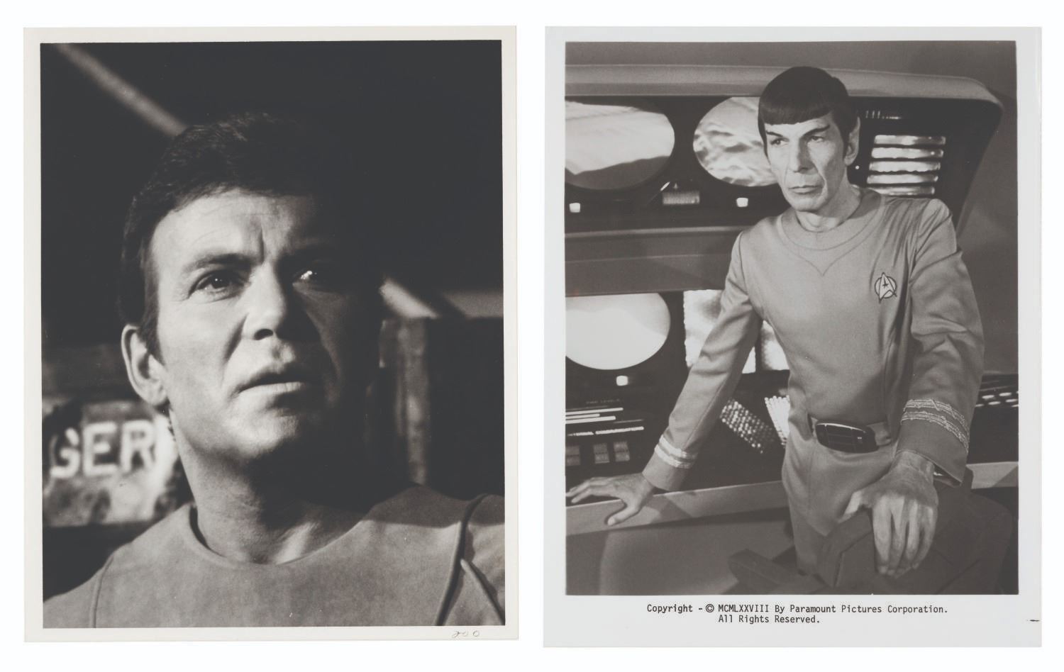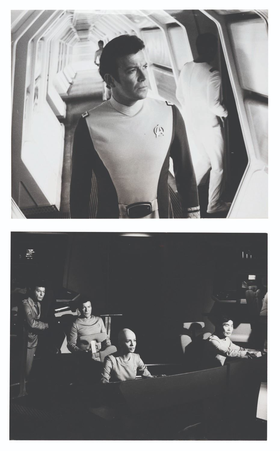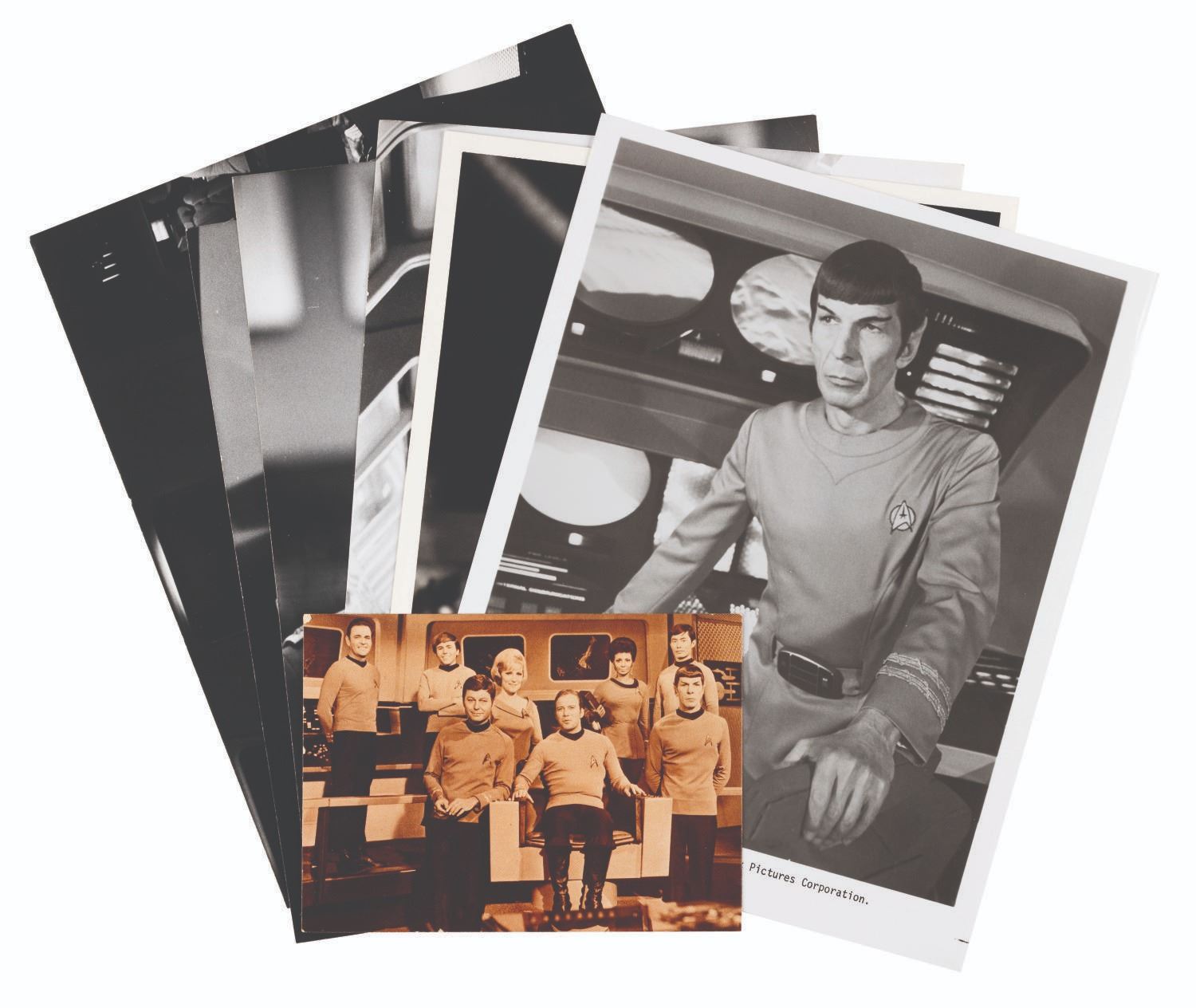(Paramount, 1978) A collection of seven photos from "Star Trek: The Motion Picture." Included is one publicity photo of Spock, and six different enlargements from the set photographer’s coverage of the film featuring Kirk, Spock, and the bridge crew including Sulu and Ilia. Each measuring 8” x 10”, the photo prints are in very good condition, with one in good condition with some creasing and small spots of wear. The lot also includes a 4.5” x 6” sepia-tone postcard of the Original Star Trek series cast.
