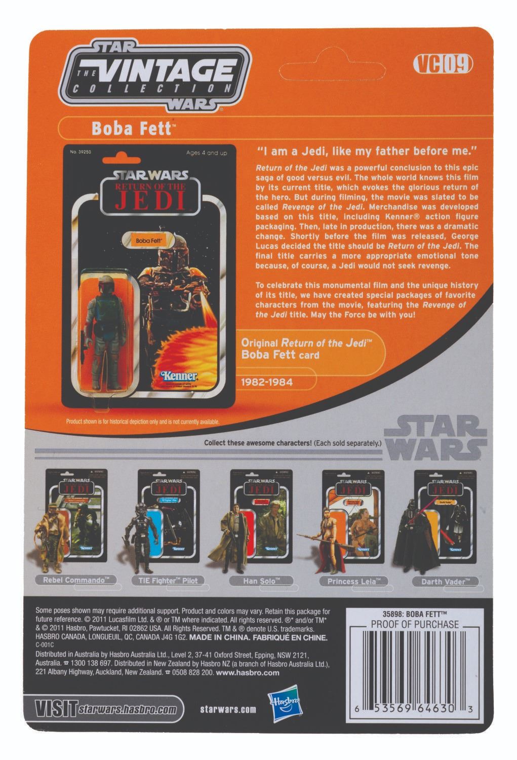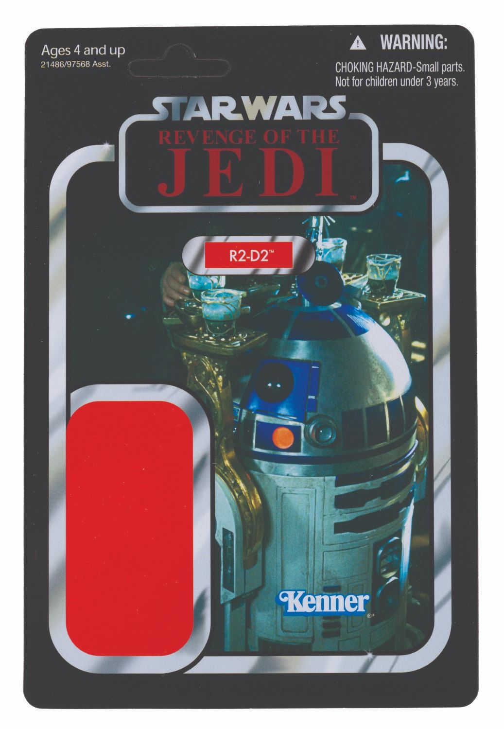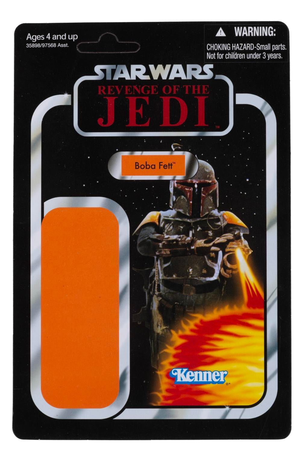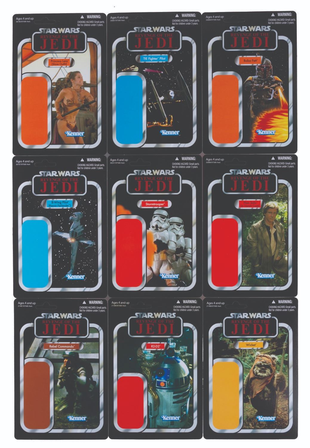 (Hasbro, 2011) A set of 9 unused cardbacks for the Star Wars The Vintage Collection “Return of the Jedi” action figures based on the original Kenner figures made in the late 1970s and early 80s. These cardbacks feature the film's original title "Revenge of the Jedi," which was changed late in production. Included in the set are cardbacks for Boba Fett, R2-D2, Rebel Commando, Wicket, Stormtrooper, Han Solo, B-Wing Pilot, Princess Leia, and TIE Fighter Pilot. Measuring 6" x 9", the unpunched cardbacks are in fine condition with a very soft 2.5" scuff line on the back right side of the Wicket, and a small piece of tape on the back bottom edge of the Stormtrooper.