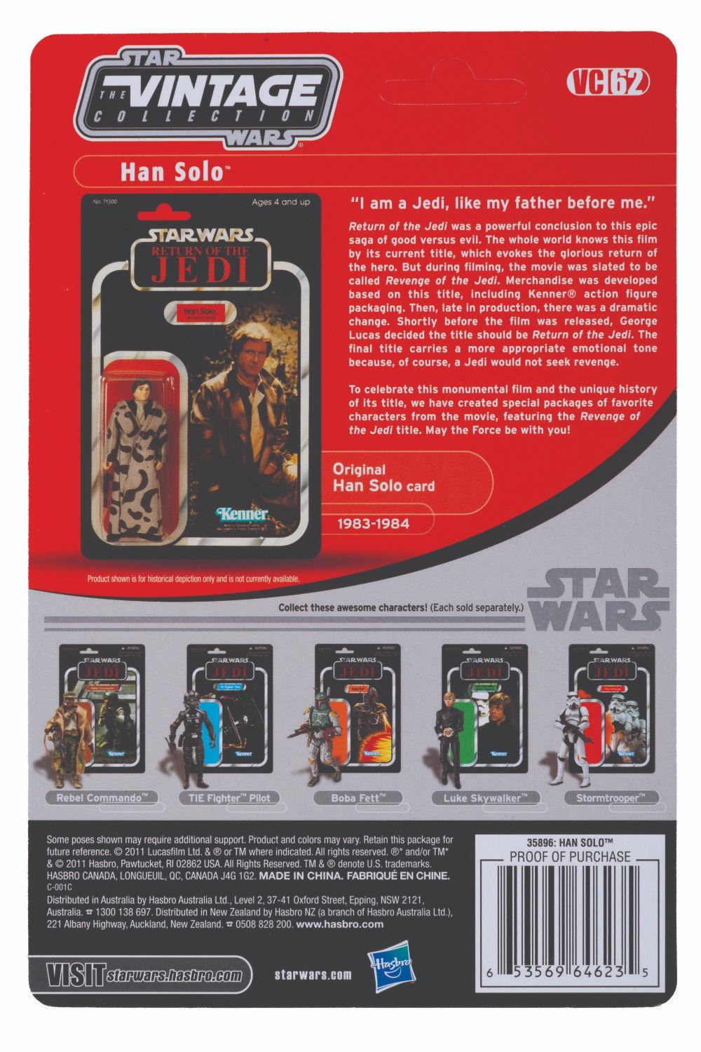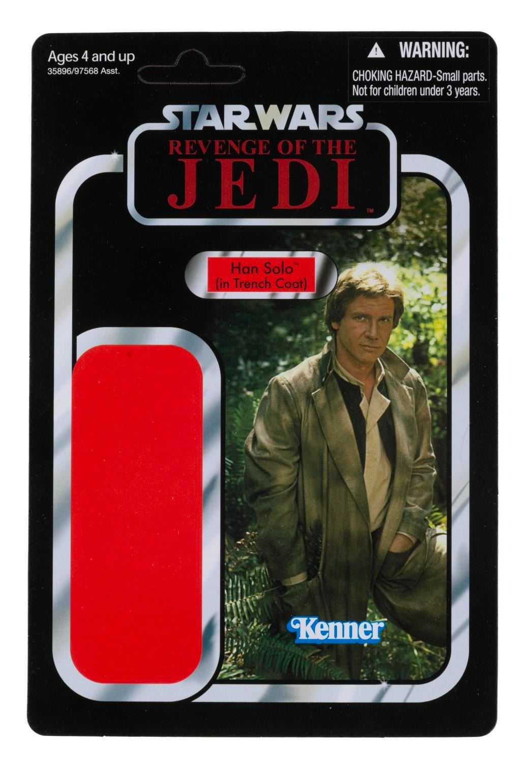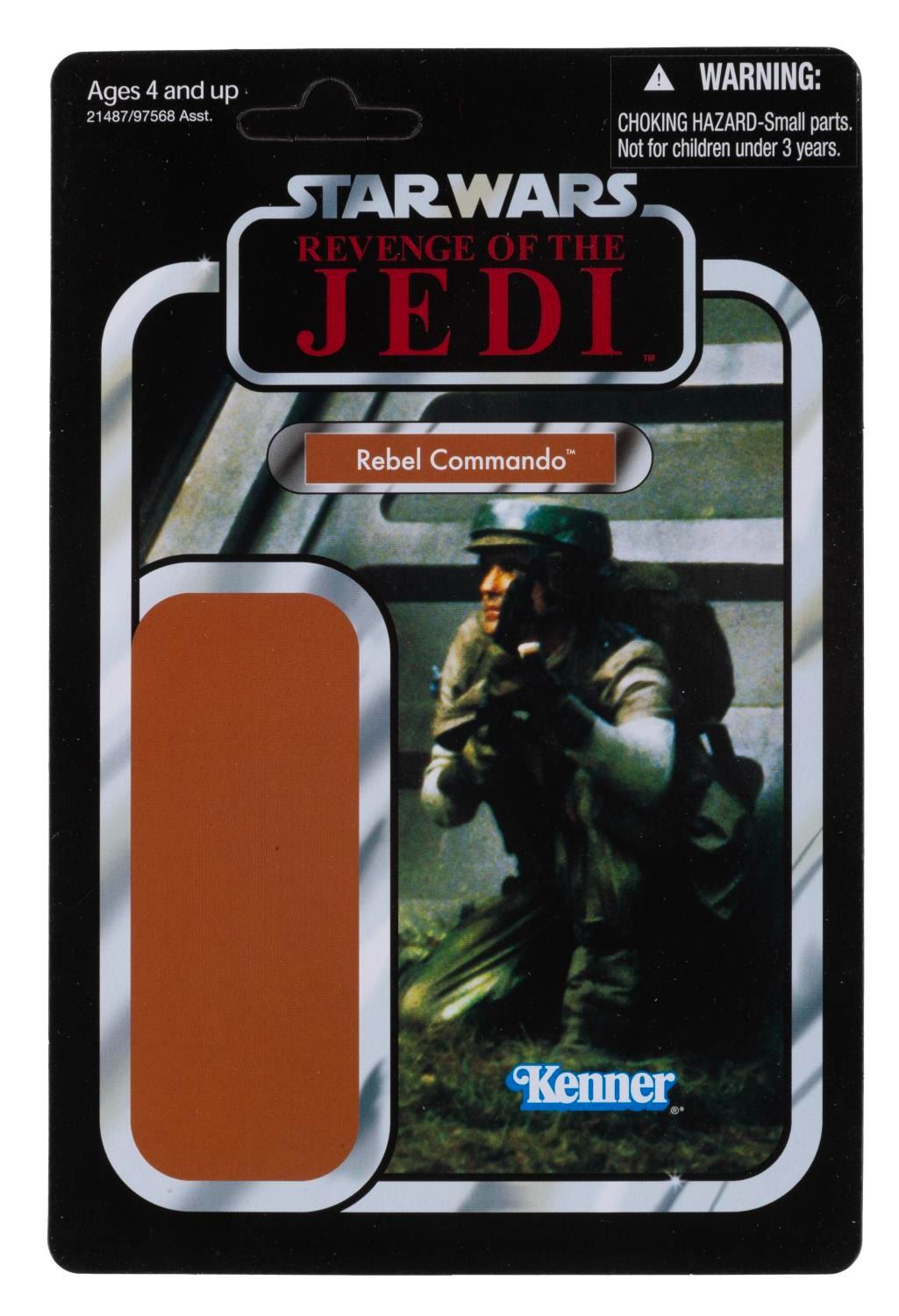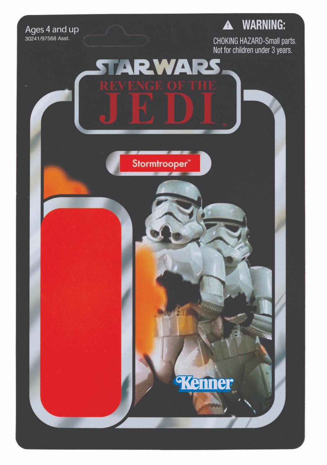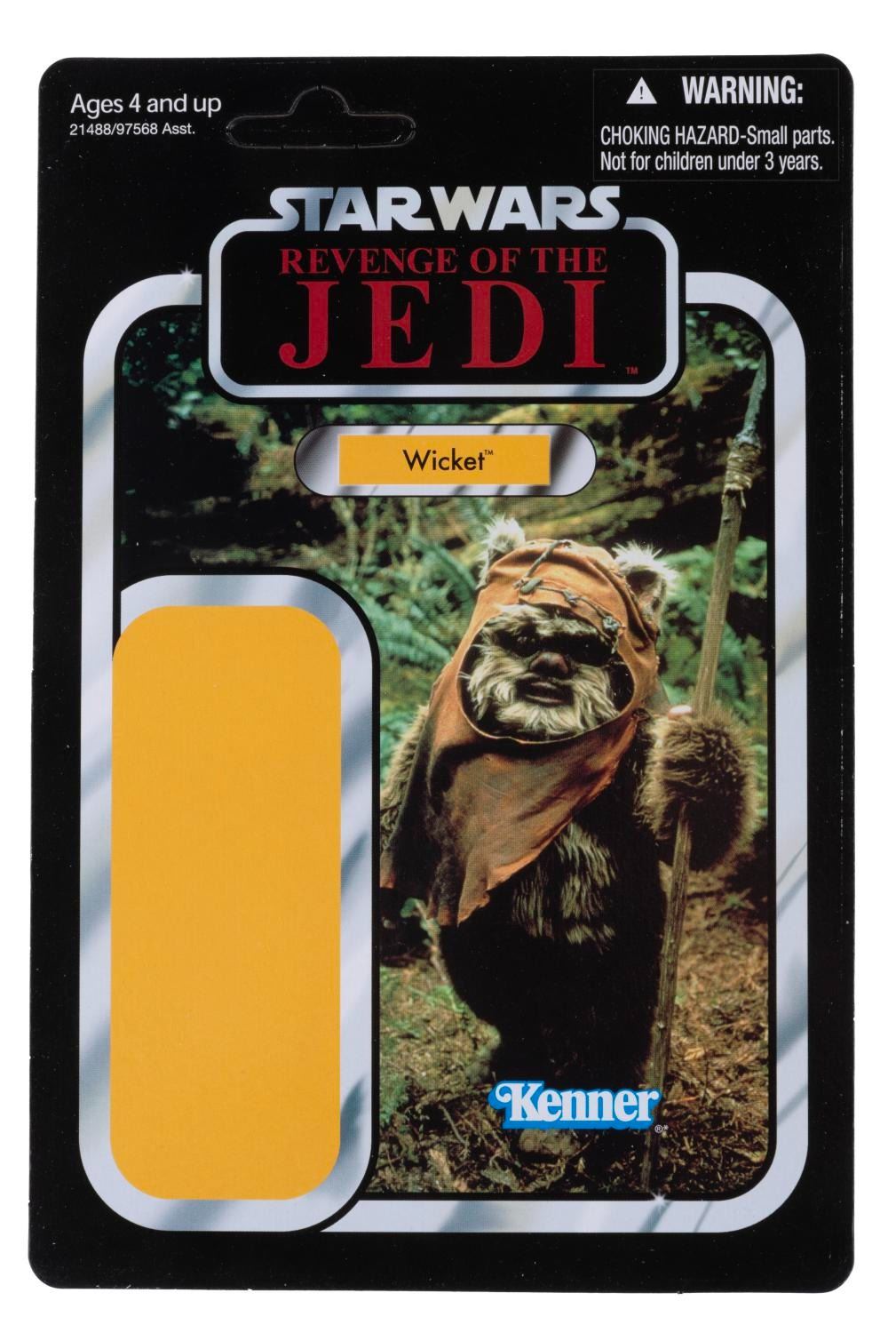 (Hasbro, 2011) A set of 9 unused cardbacks for the Star Wars The Vintage Collection “Return of the Jedi” action figures based on the original Kenner figures made in the late 1970s and early 80s. These cardbacks feature the film's original title "Revenge of the Jedi," which was changed late in production. Included in the set are cardbacks for Boba Fett, R2-D2, Rebel Commando, Wicket, Stormtrooper, Han Solo, B-Wing Pilot, Princess Leia, and TIE Fighter Pilot. Measuring 6" x 9", the unpunched cardbacks are in fine condition with a very soft 2.5" scuff line on the back right side of the Wicket, and a small piece of tape on the back bottom edge of the Stormtrooper.