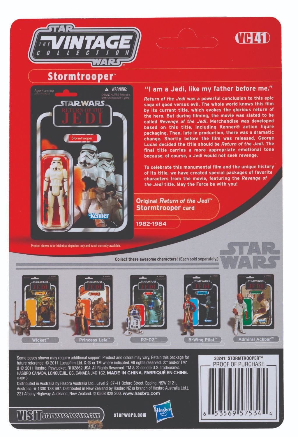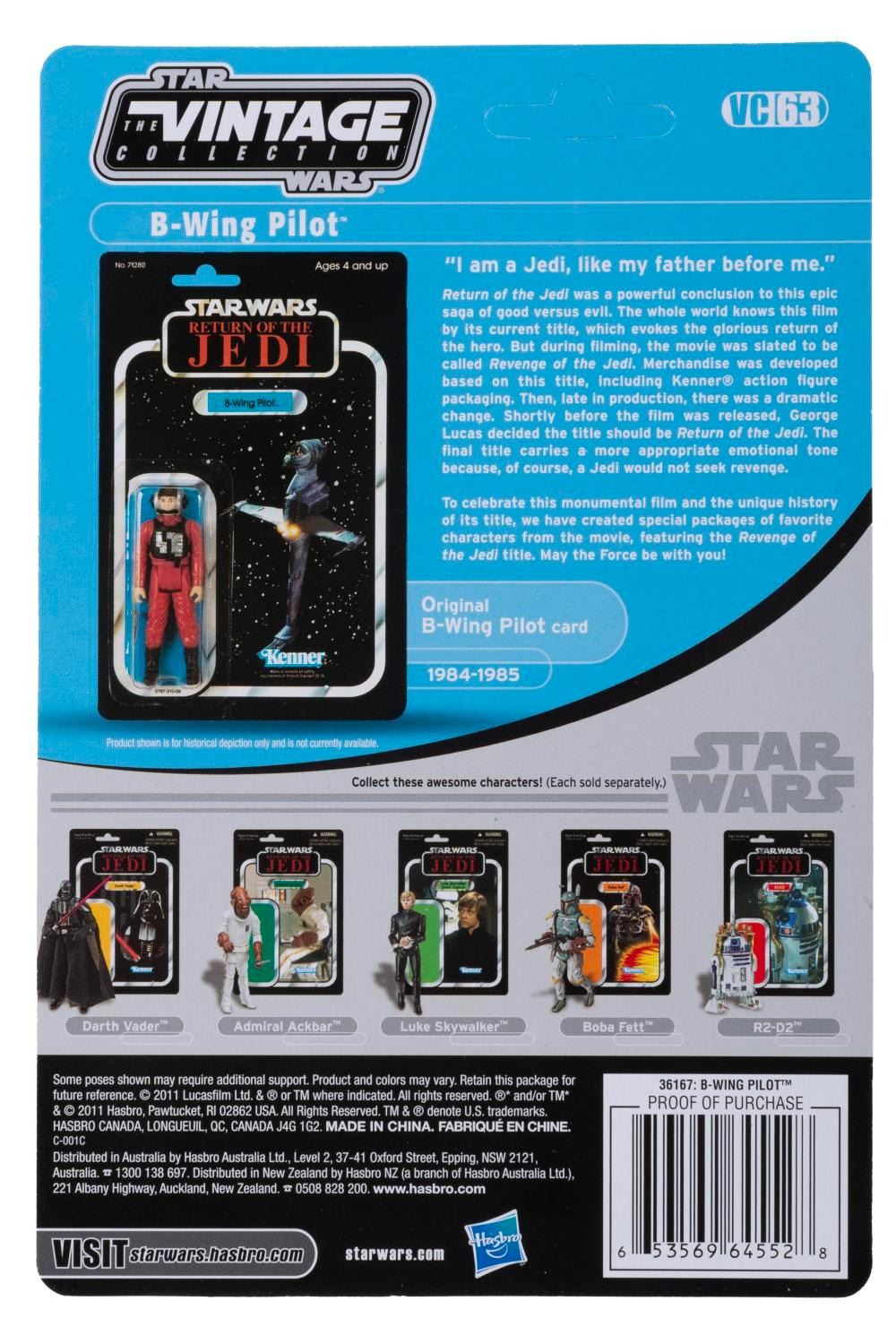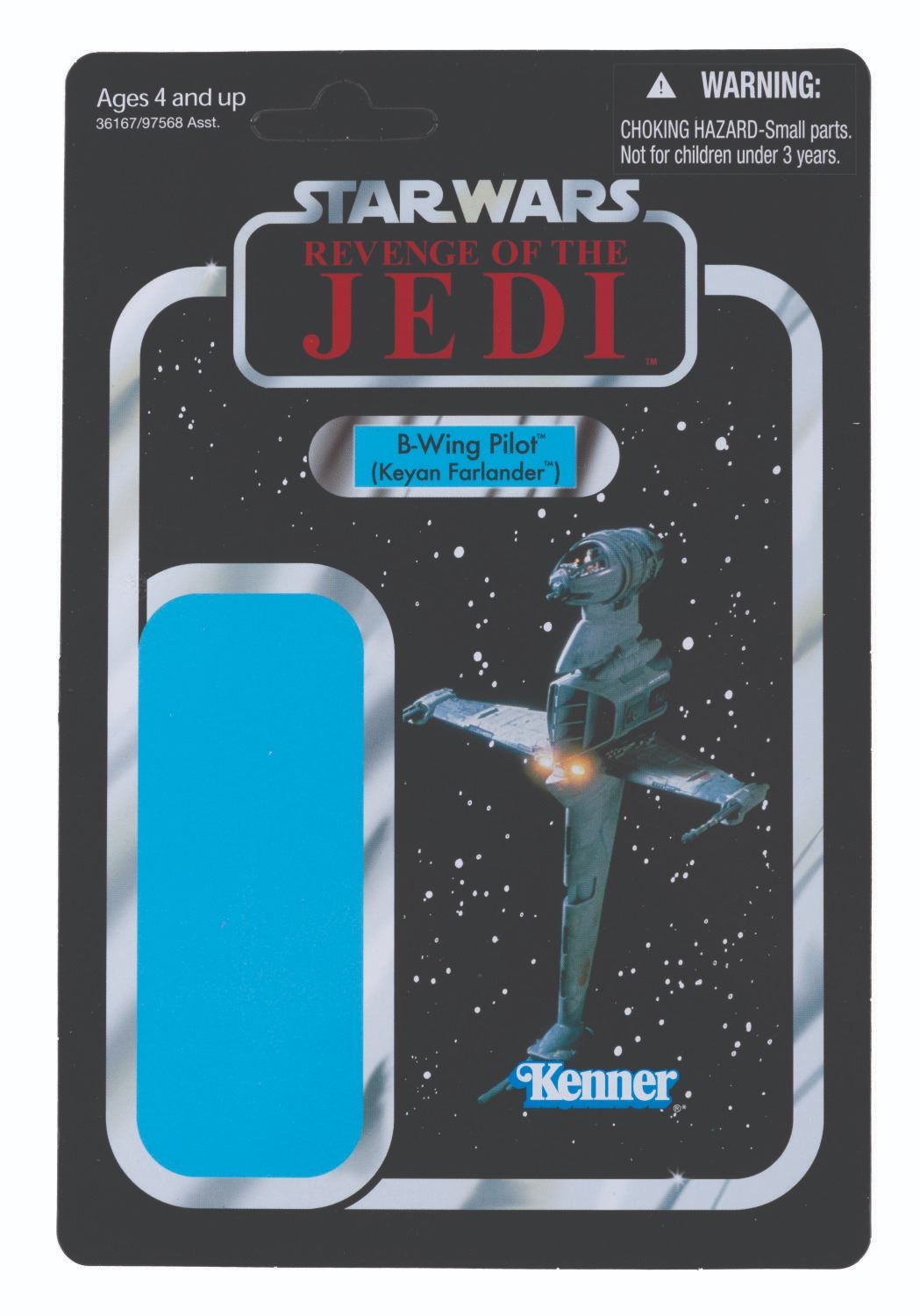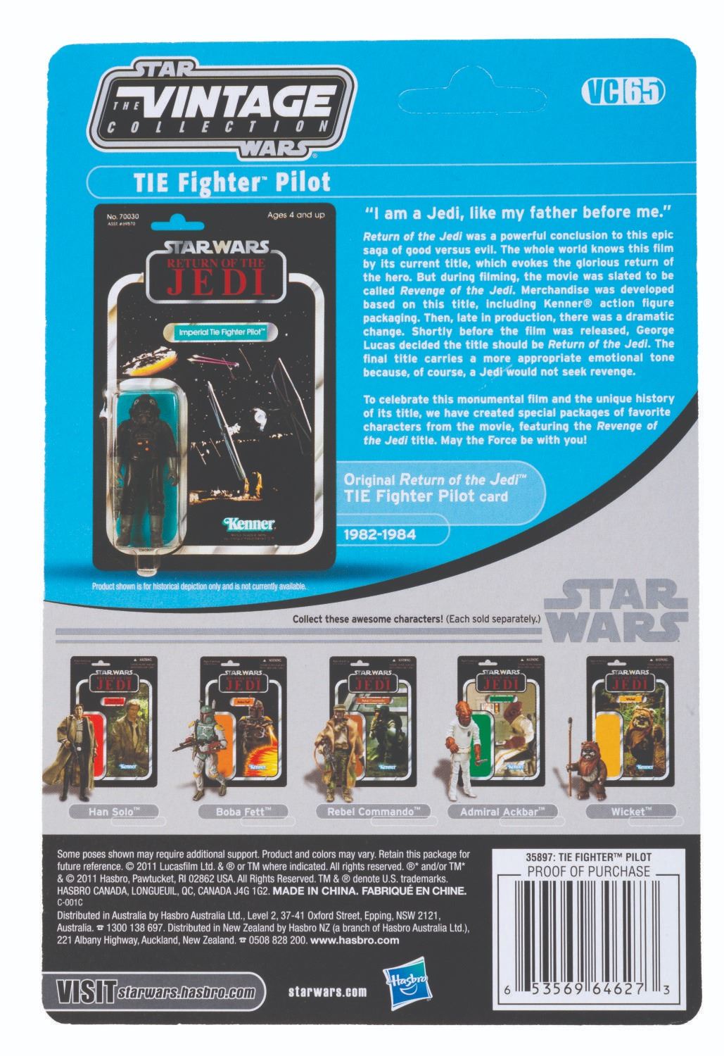 (Hasbro, 2011) A set of 9 unused cardbacks for the Star Wars The Vintage Collection “Return of the Jedi” action figures based on the original Kenner figures made in the late 1970s and early 80s. These cardbacks feature the film's original title "Revenge of the Jedi," which was changed late in production. Included in the set are cardbacks for Boba Fett, R2-D2, Rebel Commando, Wicket, Stormtrooper, Han Solo, B-Wing Pilot, Princess Leia, and TIE Fighter Pilot. Measuring 6" x 9", the unpunched cardbacks are in fine condition with a very soft 2.5" scuff line on the back right side of the Wicket, and a small piece of tape on the back bottom edge of the Stormtrooper.