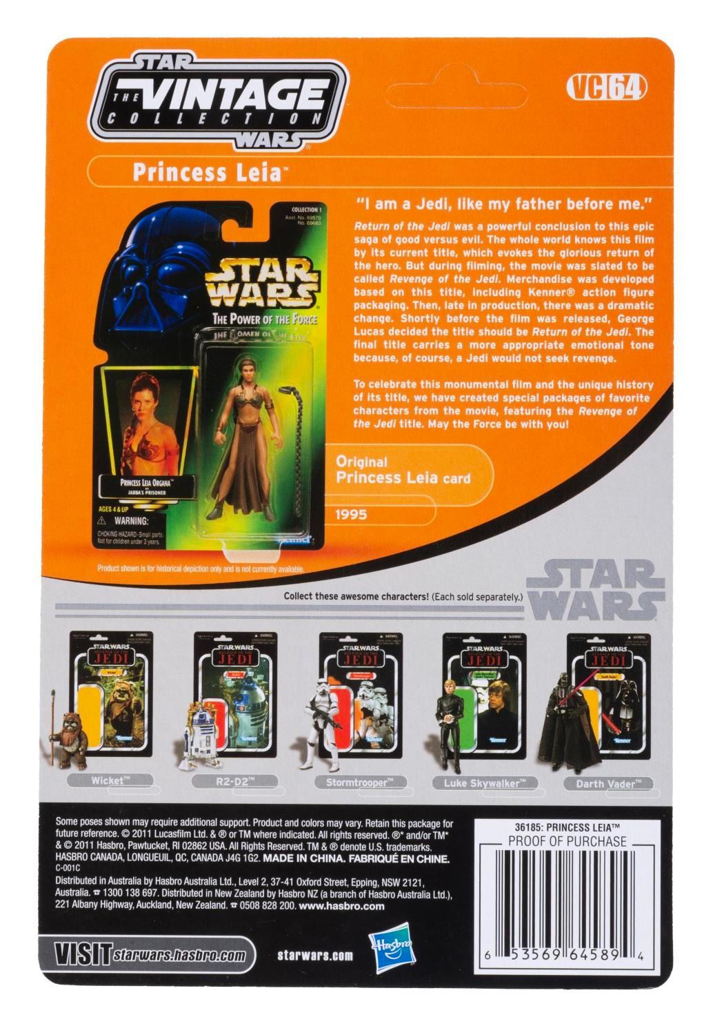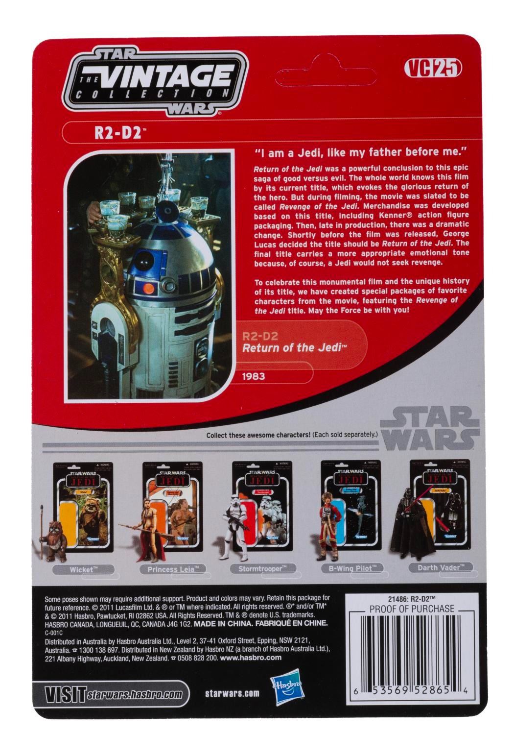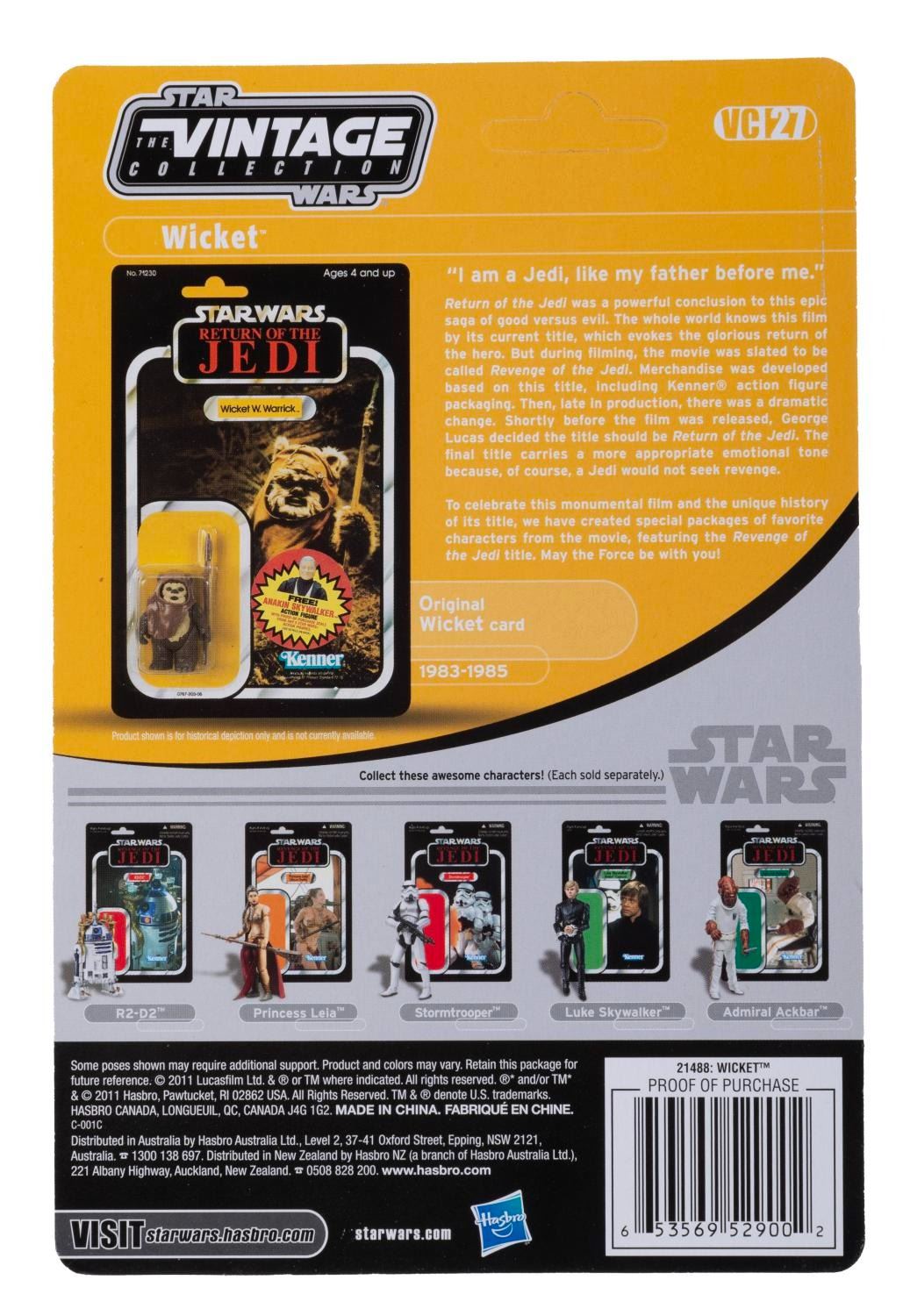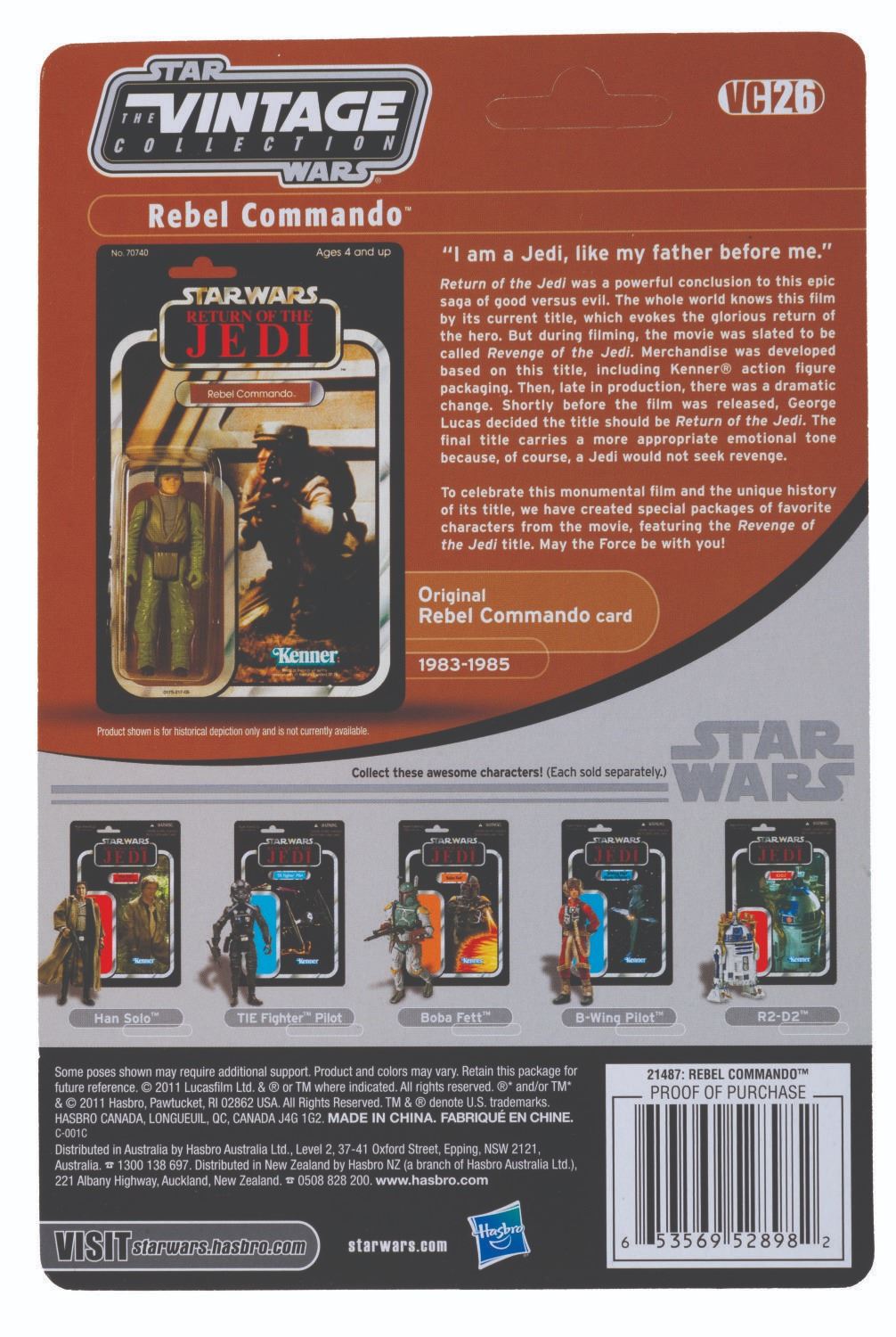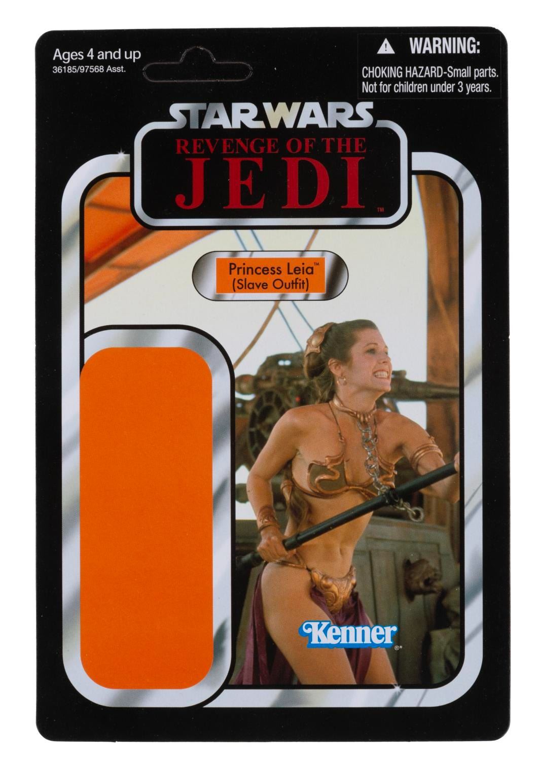 (Hasbro, 2011) A set of 9 unused cardbacks for the Star Wars The Vintage Collection “Return of the Jedi” action figures based on the original Kenner figures made in the late 1970s and early 80s. These cardbacks feature the film's original title "Revenge of the Jedi," which was changed late in production. Included in the set are cardbacks for Boba Fett, R2-D2, Rebel Commando, Wicket, Stormtrooper, Han Solo, B-Wing Pilot, Princess Leia, and TIE Fighter Pilot. Measuring 6" x 9", the unpunched cardbacks are in fine condition with a very soft 2.5" scuff line on the back right side of the Wicket, and a small piece of tape on the back bottom edge of the Stormtrooper.