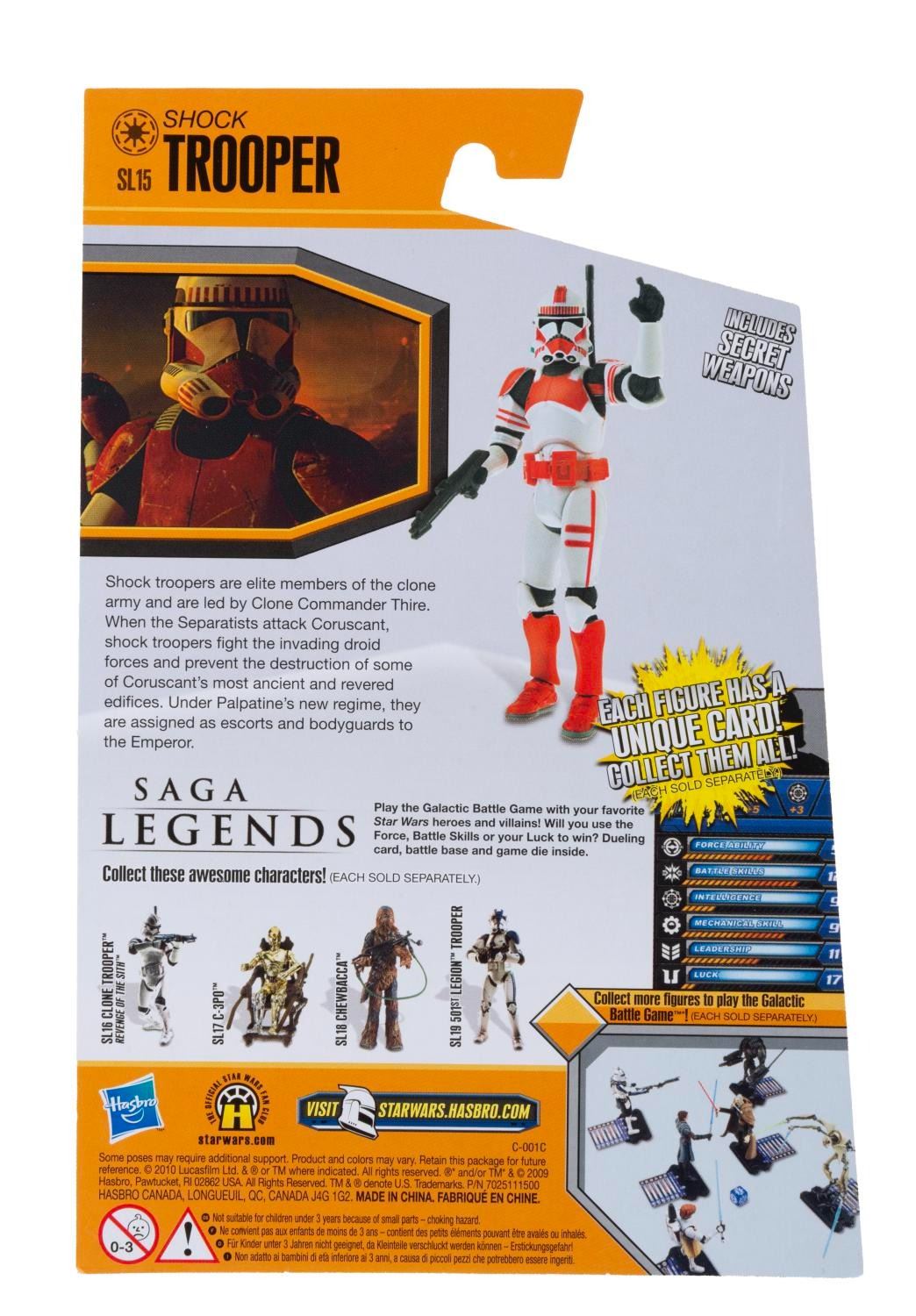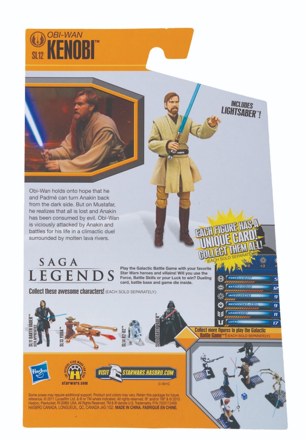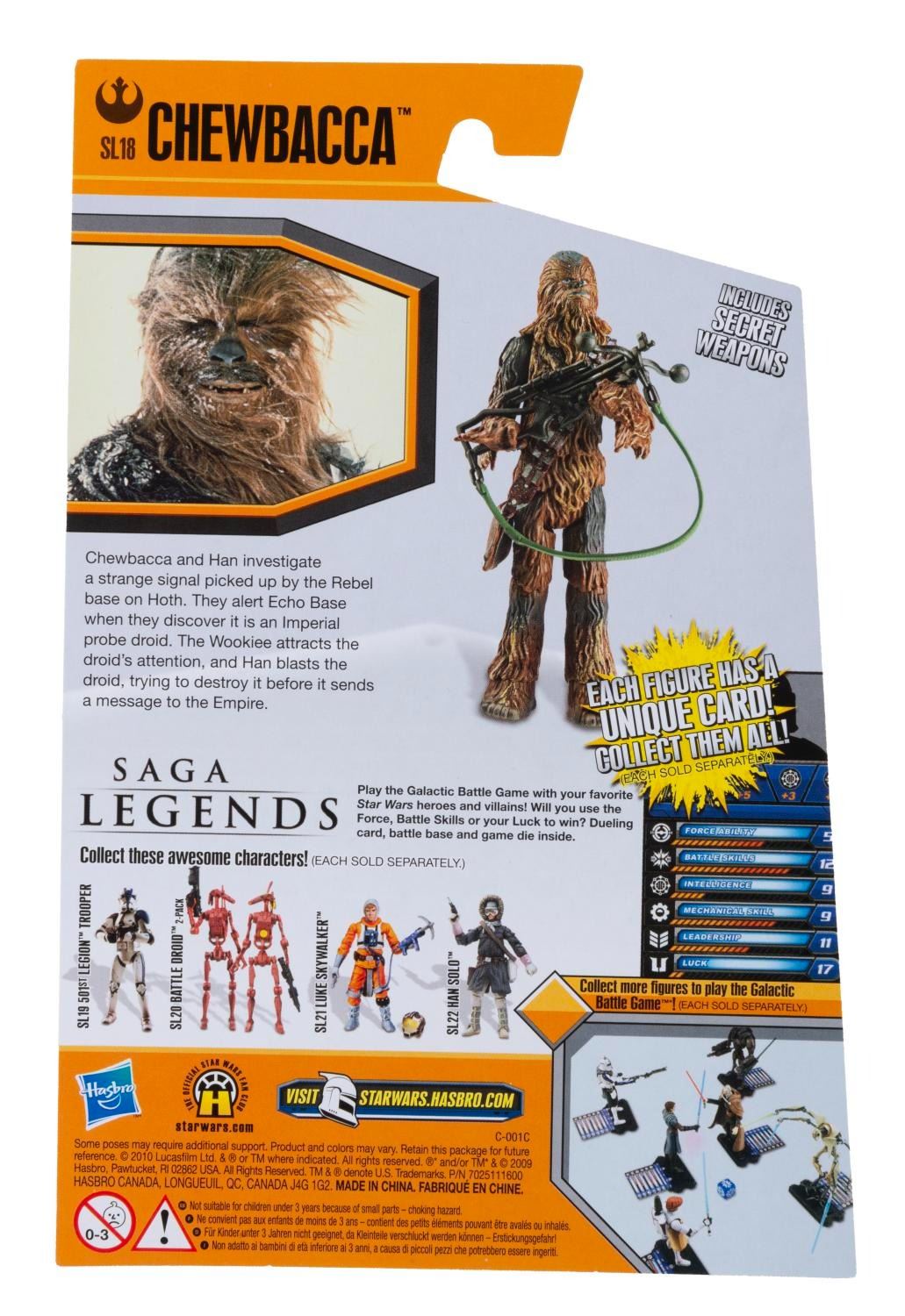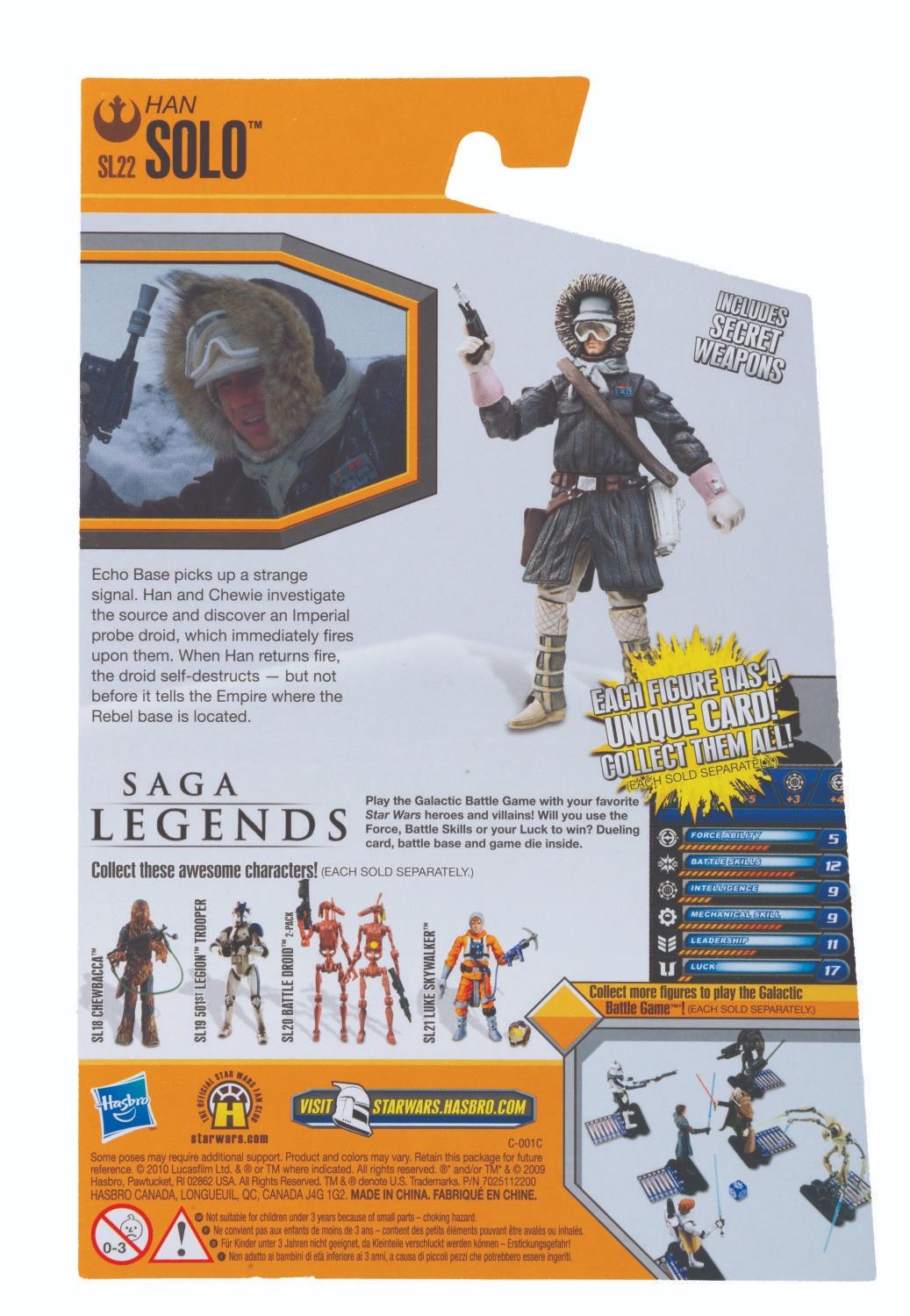 (Hasbro, 2010-2011) A set of 28 unused Star Wars Saga Legends cardbacks, including cardbacks for Darth Vader, Han Solo, Mace Windu, Yoda, and more. Missing from the set are numbers 2 and 7, and 24 and 26 (which were never made). Measuring 5.5" x 8.25", the cardbacks are in good to fine condition with a heavy crease at the bottom left corner of one, and light wear to five.